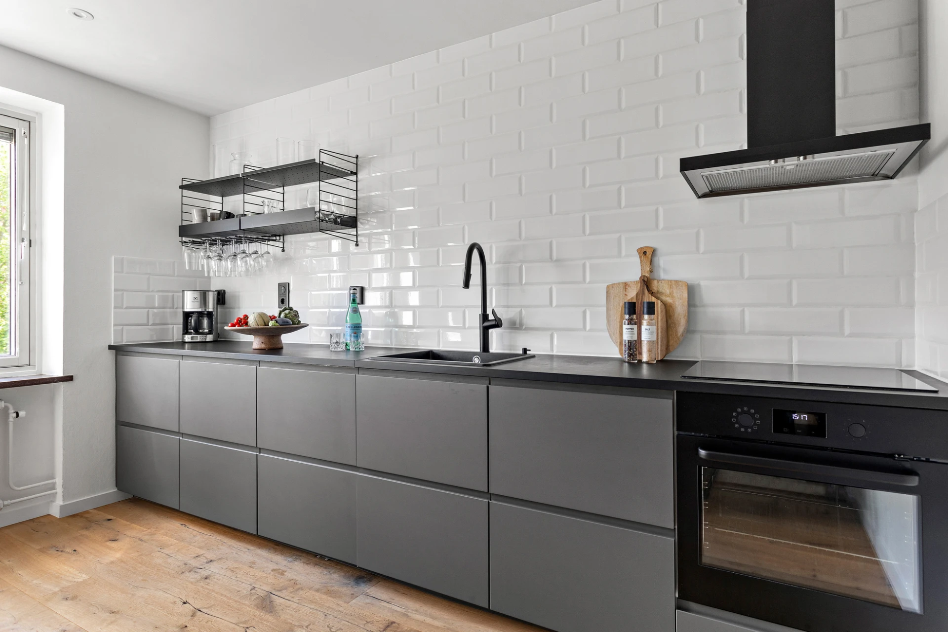 Parkett och vita väggar. Svart köksinredning, bänkskiva i svart sten och vitt kakel. Köket är utrustat med häll, ugn, diskmaskin, frys, kyl, vask och fläkt.