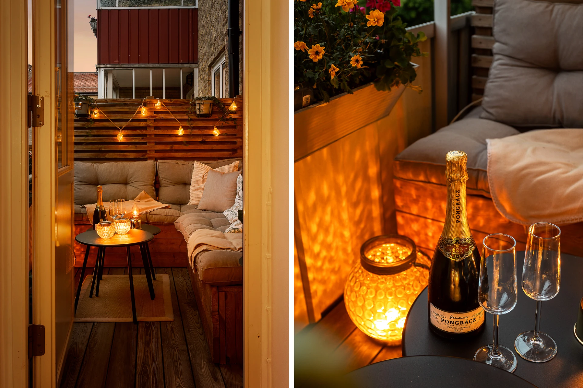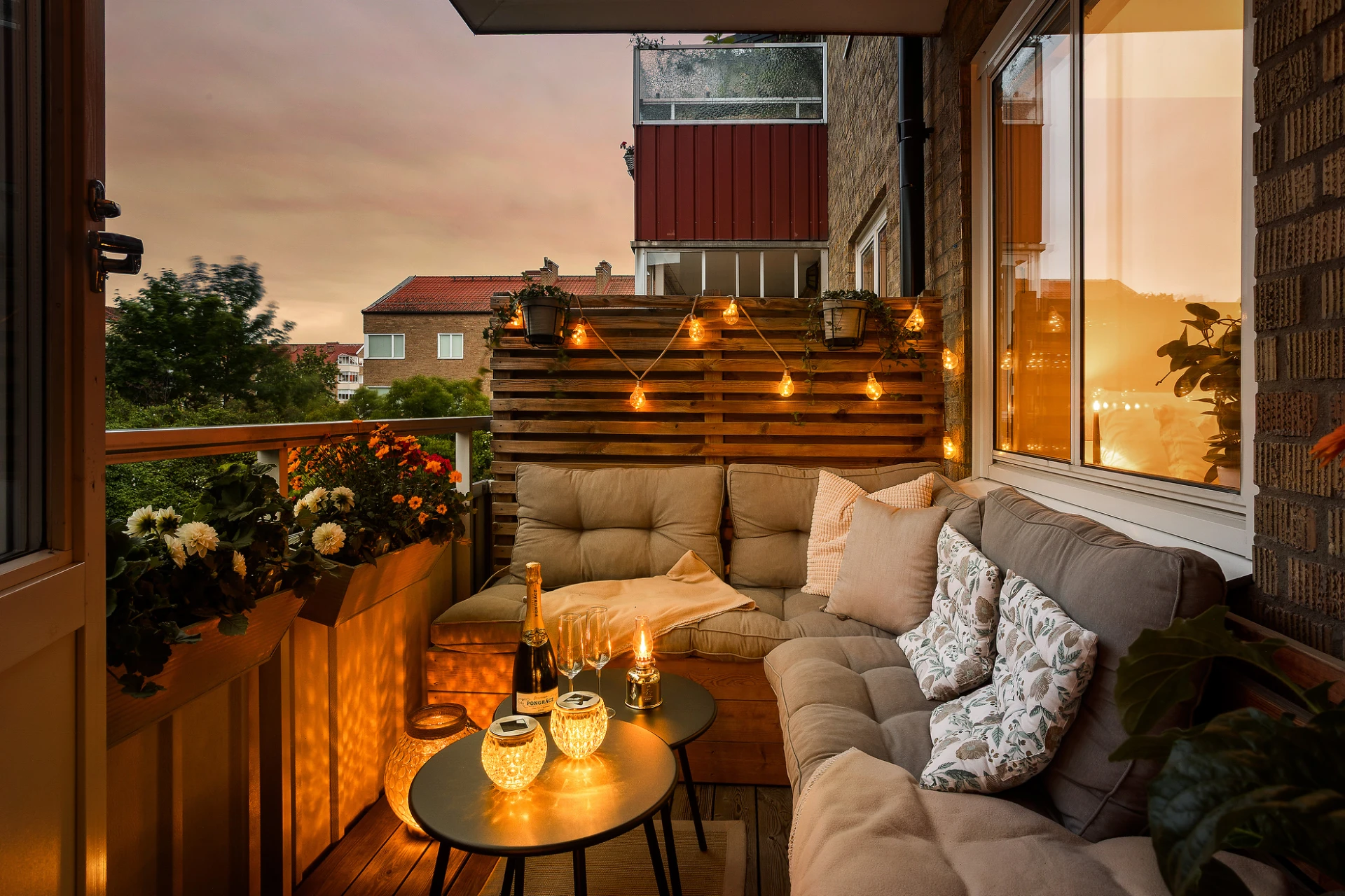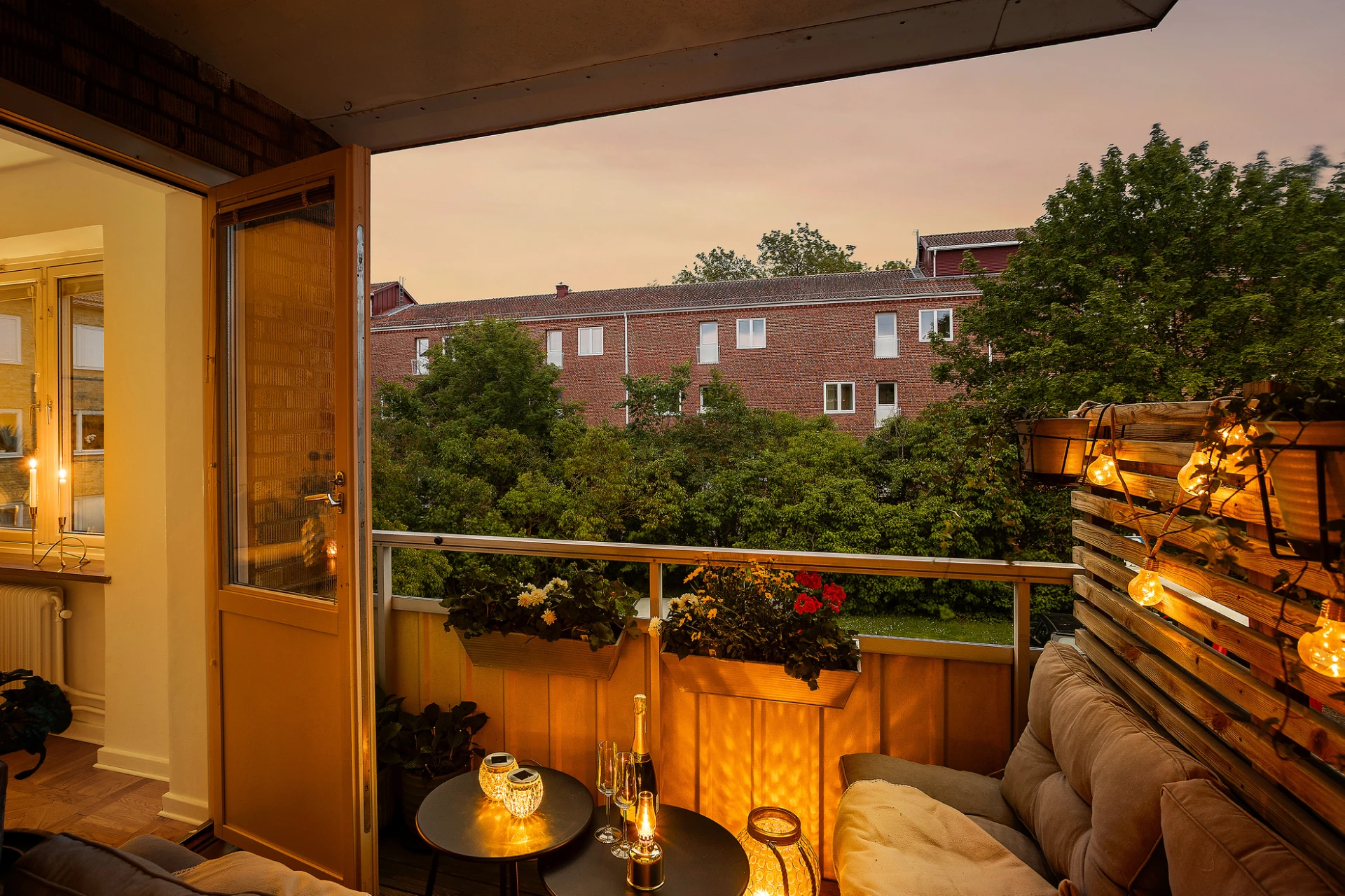 Rymlig balkong i söderläge med trall och platsbyggd hörsoffa.