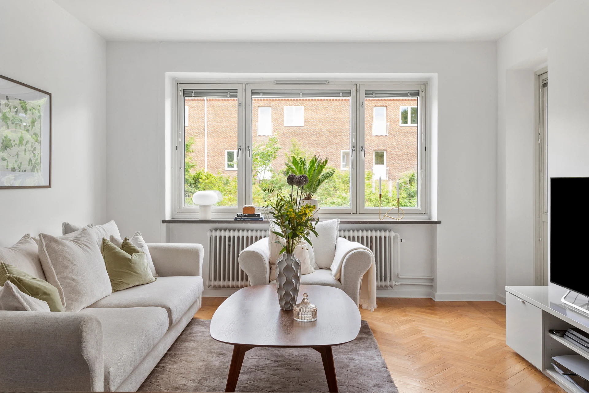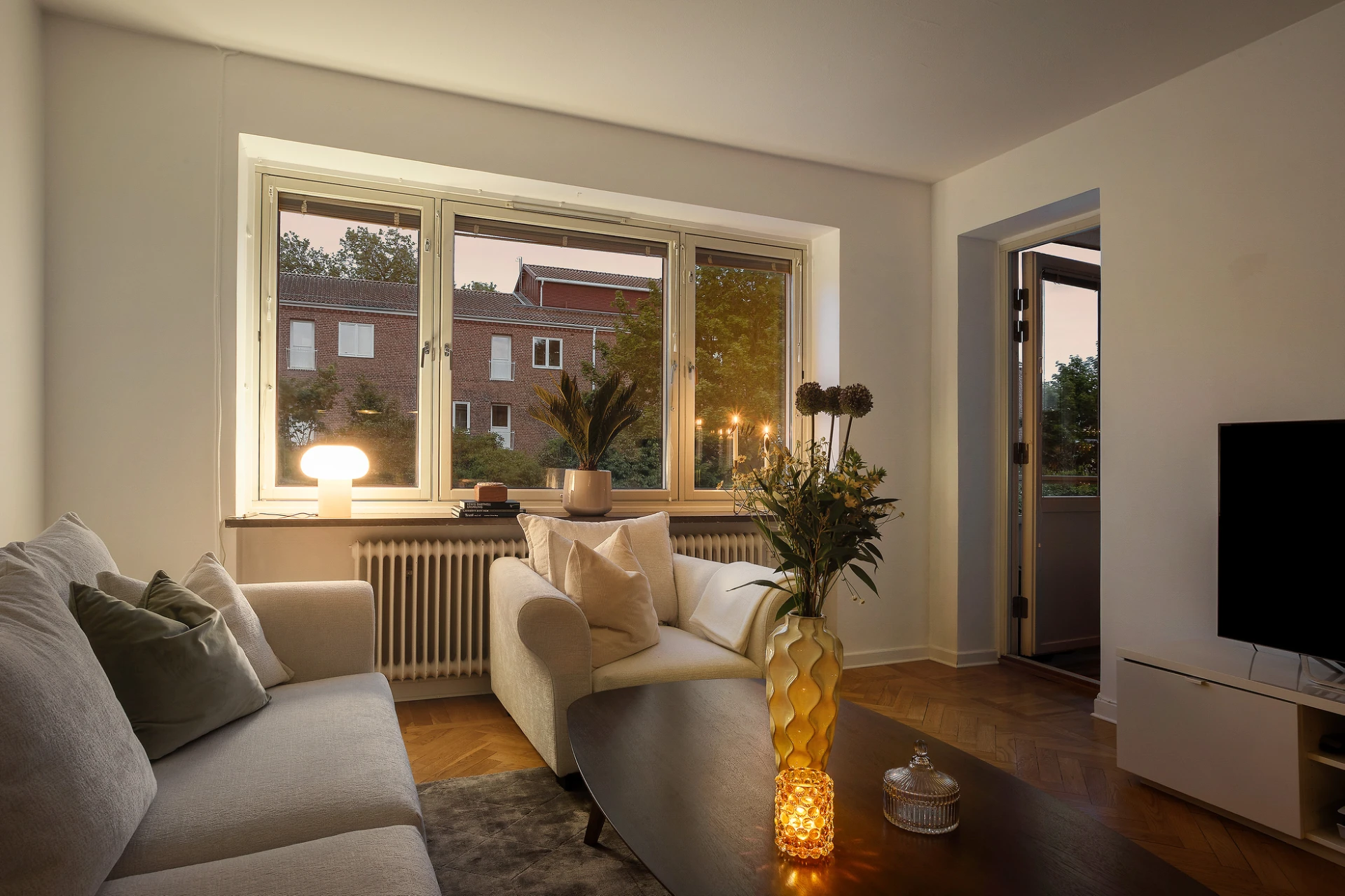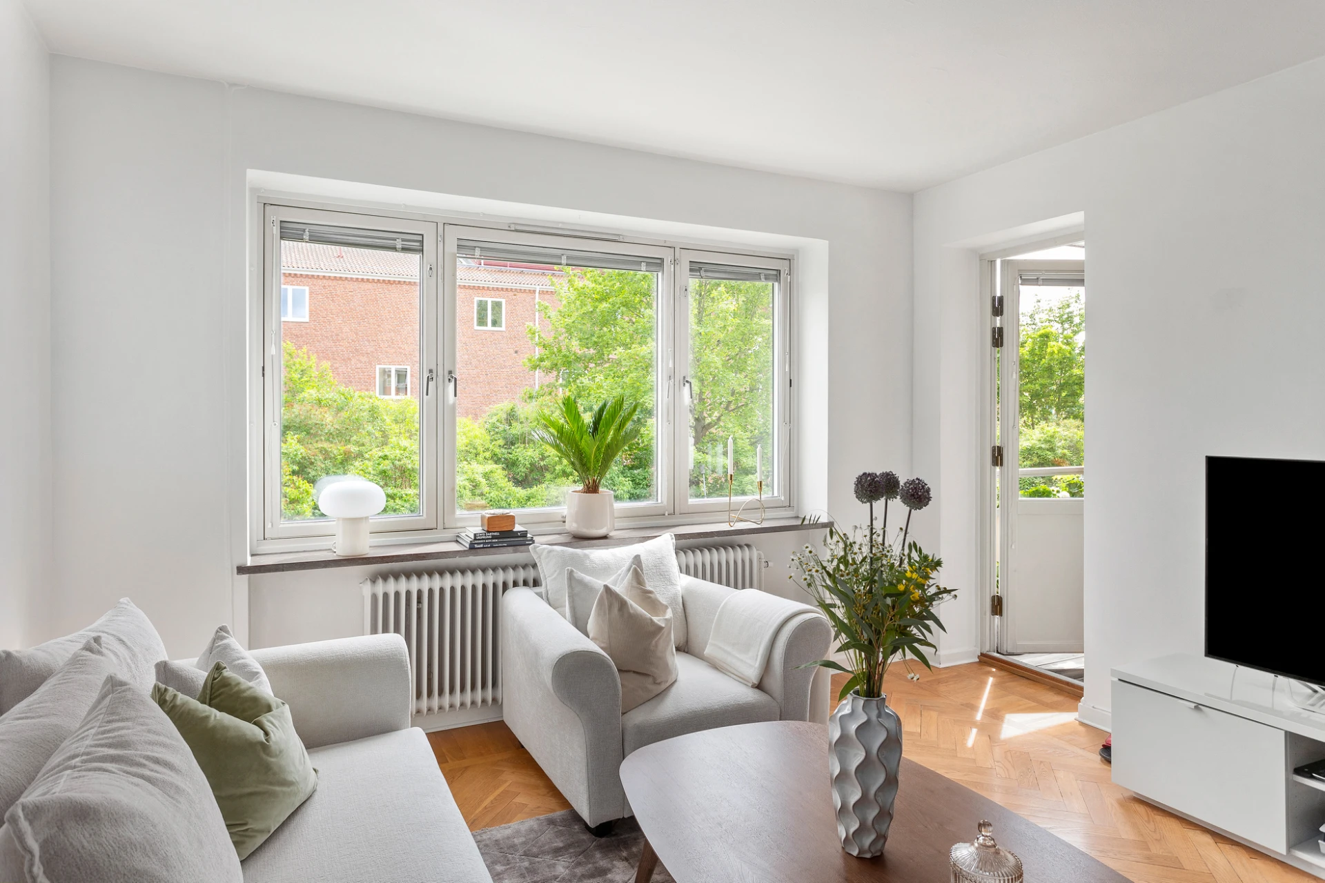Vardagsrummet är rymligt och lättmöblerat, med utgång till den soliga balkongen i bästa söderläge – en självklar favoritplats för avkoppling, växtodling eller ett glas vin i kvällssolen.