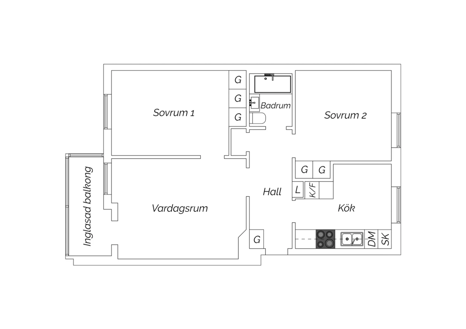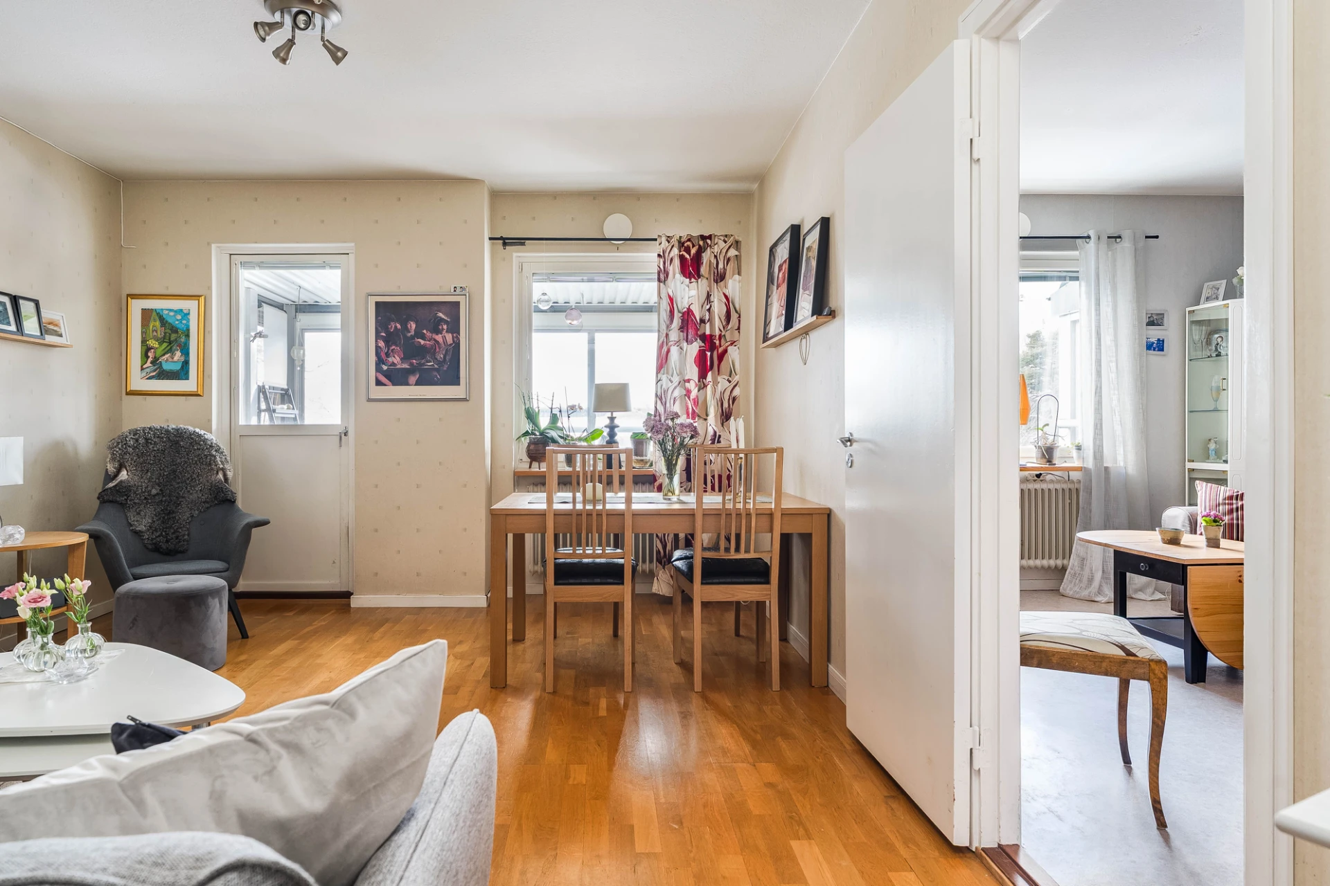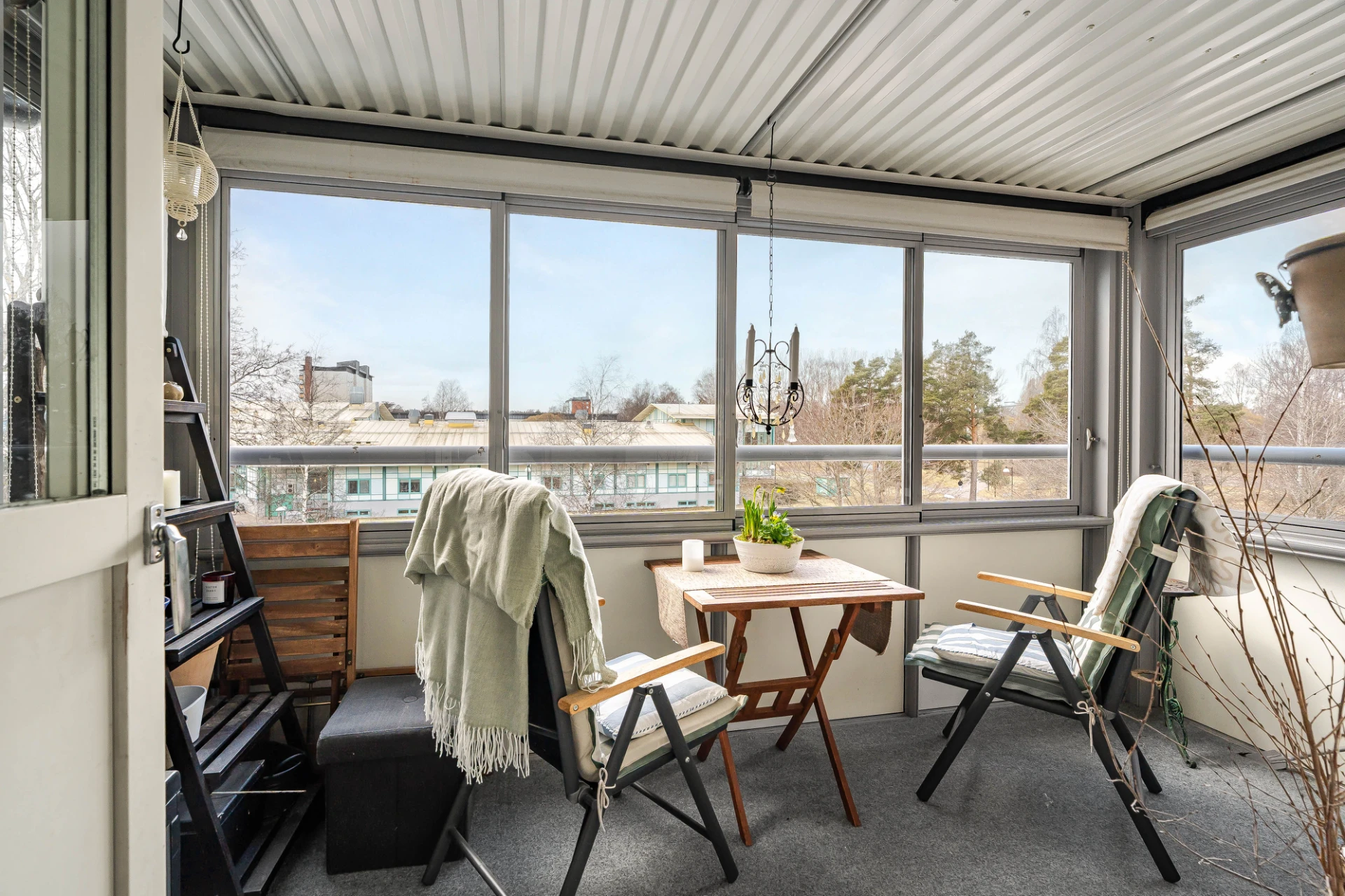 Du välkomnas av en rymlig hall med generösa förvaringsmöjligheter, perfekt för att hålla ordning och reda. Vidare möts du av ett modernt kök utrustat med alla bekvämligheter du kan önska dig, samt gott om förvaring och plats för ett matbord. Det luftiga vardagsrummet erbjuder plats för både en mysig soffgrupp och en matplats, och härifrån når du den inglasade balkongen, en perfekt förlängning av bostaden där du kan njuta av morgonkaffet eller en avkopplande kväll. Vidare finns två rymliga sovrum, båda med inbyggda garderober som ger smart förvaring. Det helkaklade badrummet är utrustat med badkar.