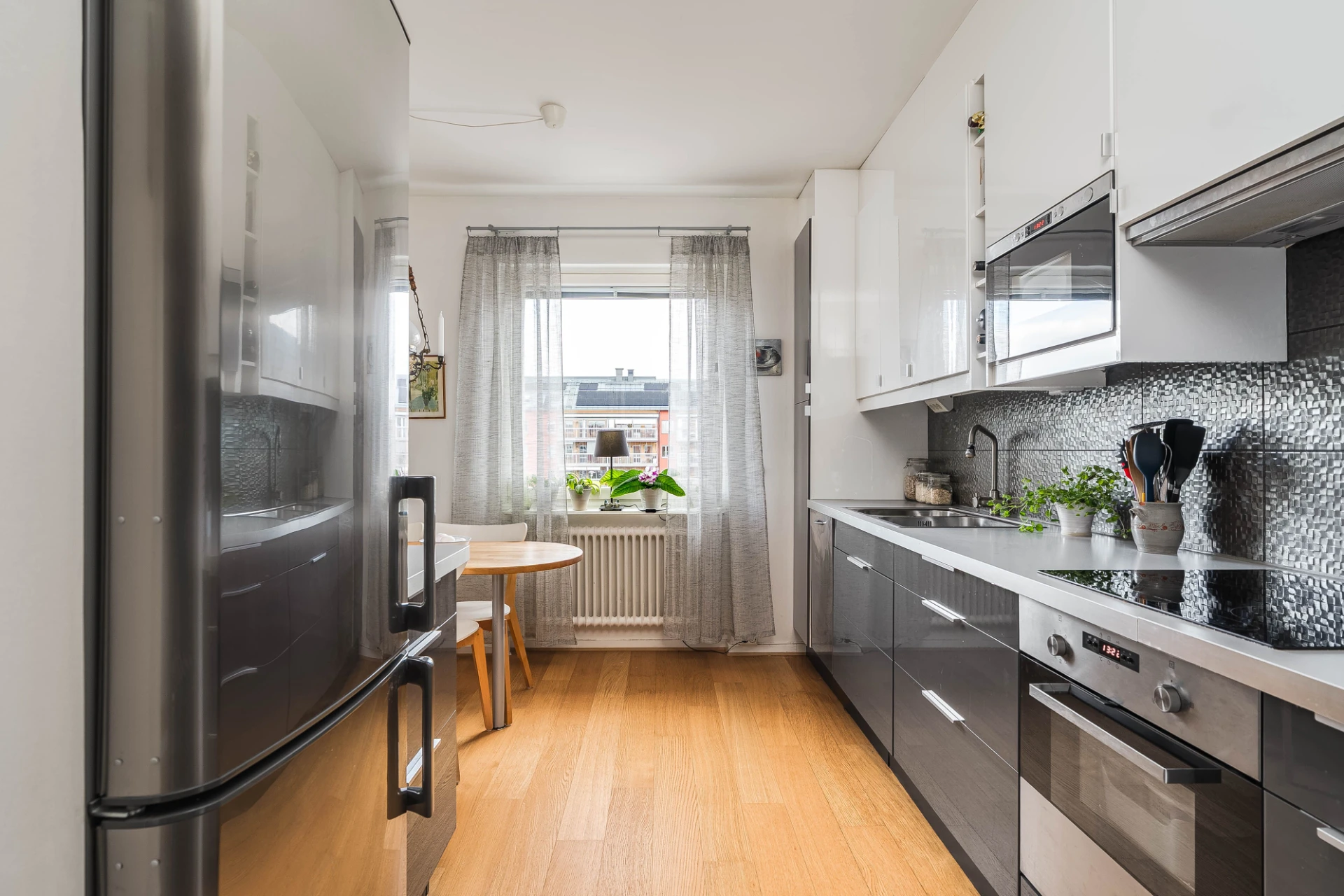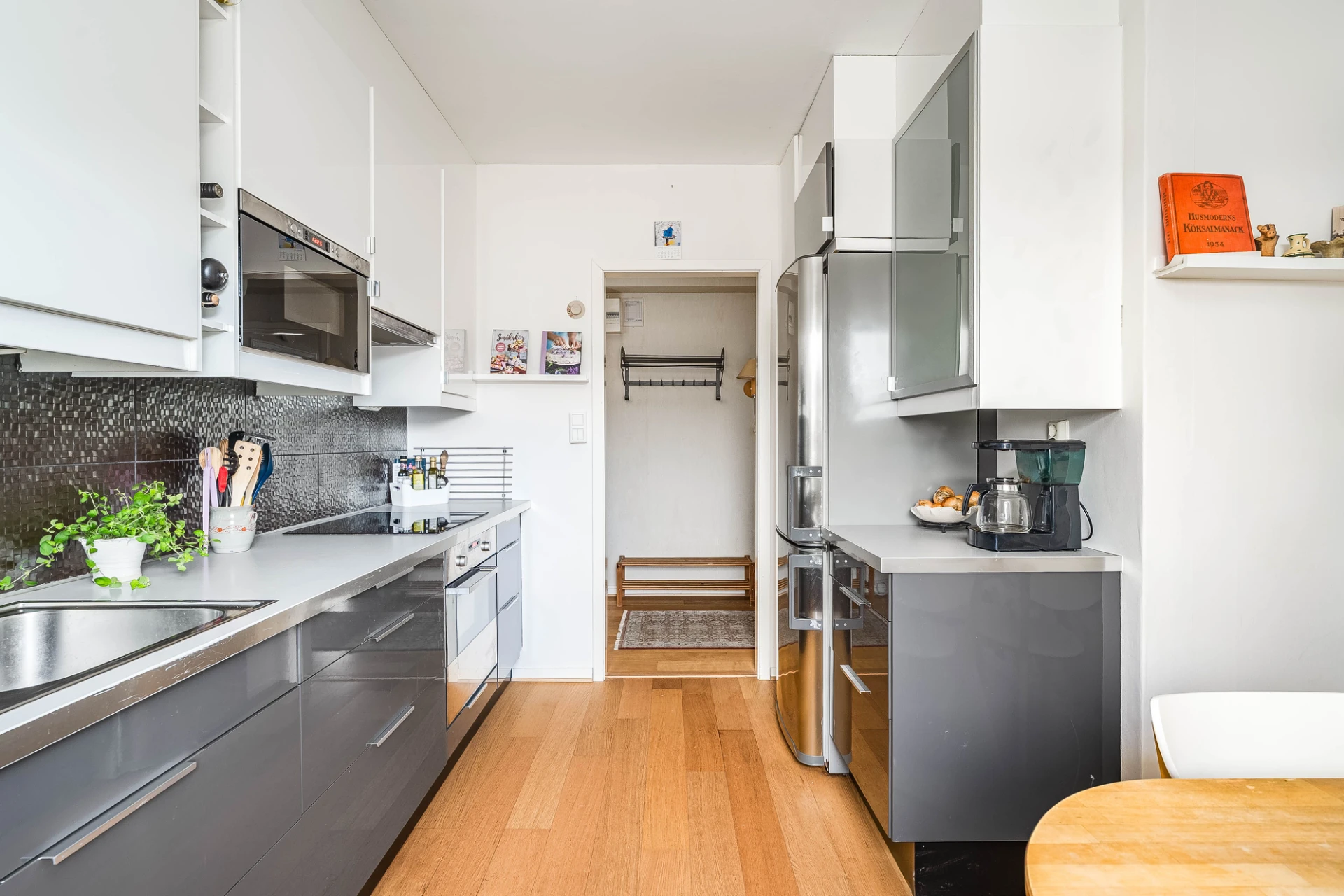 Köket går i tidlösa färger och har alla bekvämligheter du kan tänkas önska dig. Utrustat med kyl/frys, ugn, spishäll, fläkt, diskmaskin och integrerad micro. Här finns dessutom plats för ett matbord för ca 4 personer. Köket renoverades 2015.