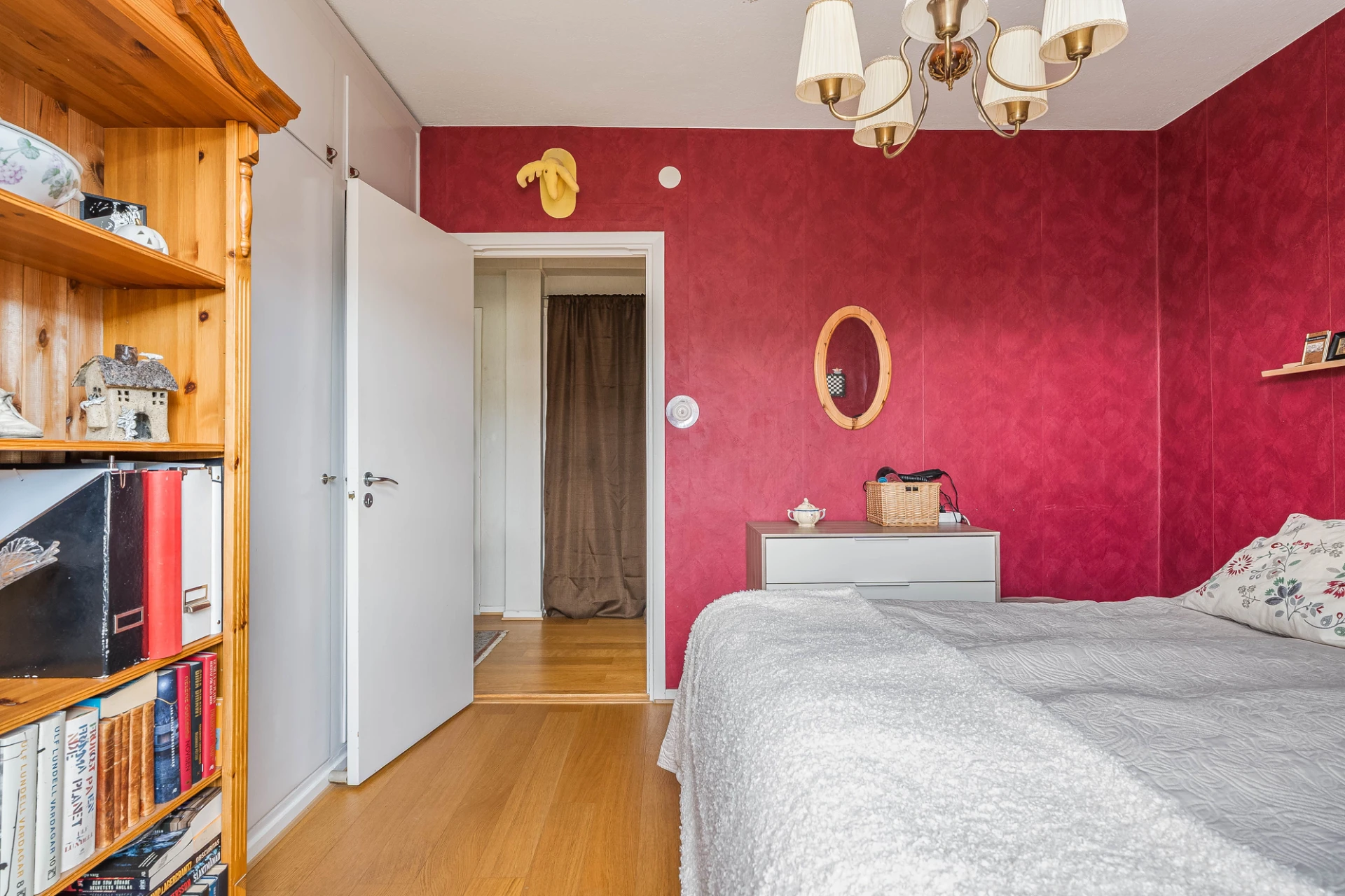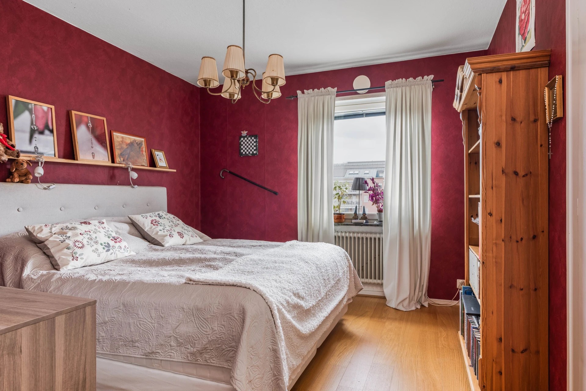 Rymligt sovrum med plats för fullstor säng eller annat efter behov. Här finns tre inbyggda garderober för förvaring.