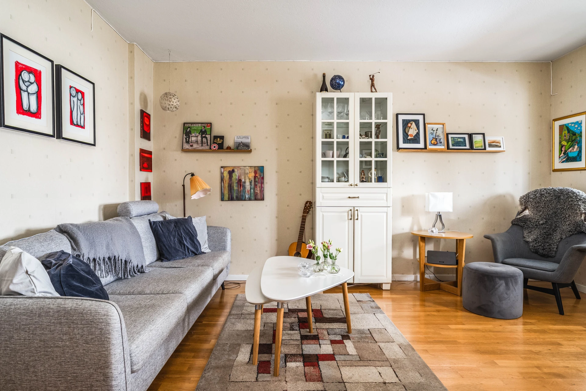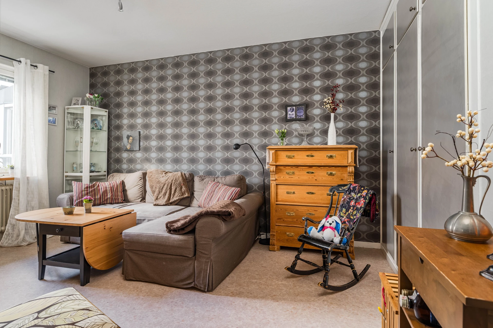 Vardagsrummet inrymmer både soffa och matbord, eller andra möbler efter önskemål. Härifrån når du ut till den inglasade balkongen som förlänger rummet när årstiden tillåter.