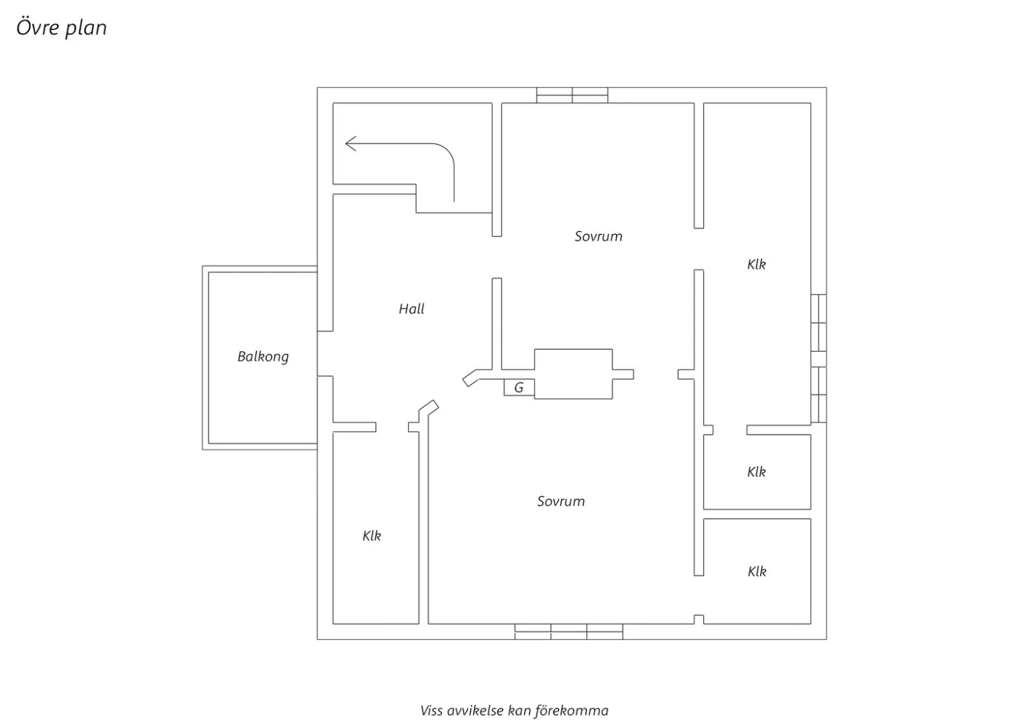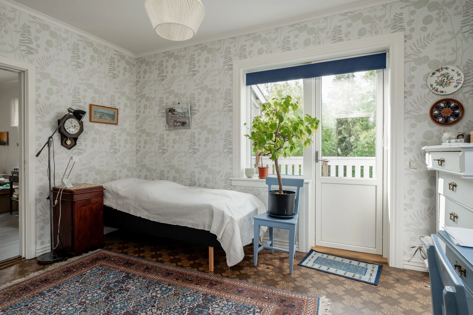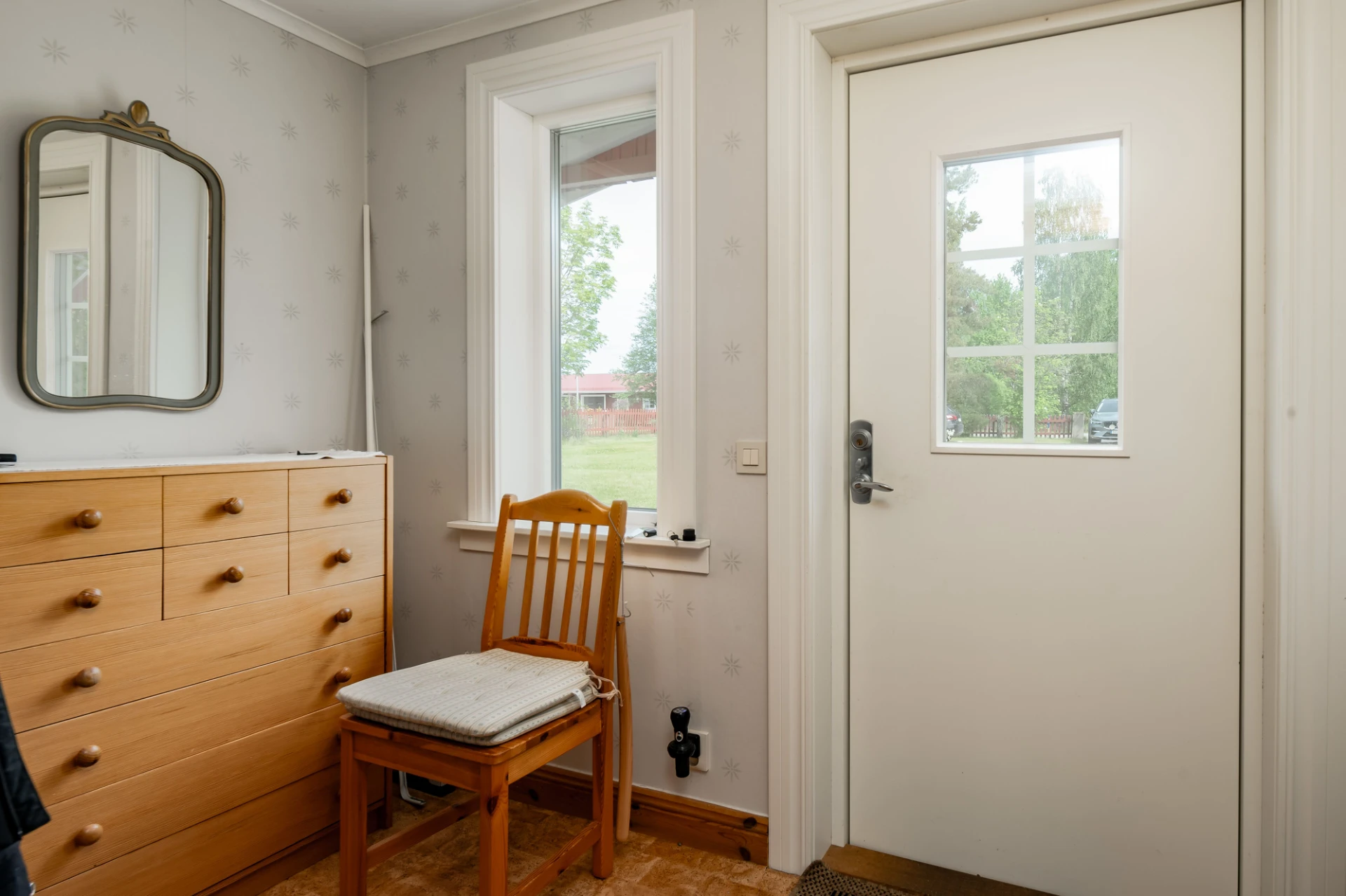 Plastmatta på golv och ljus mönstrad tapet. Här finns plats för säng med tillhörande möblemang. Utgång till altan.