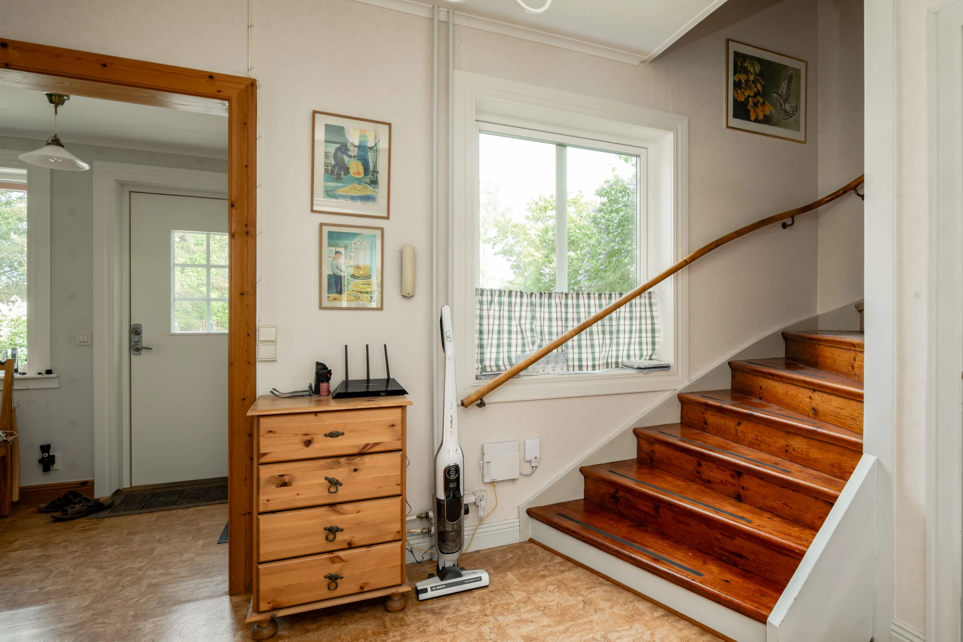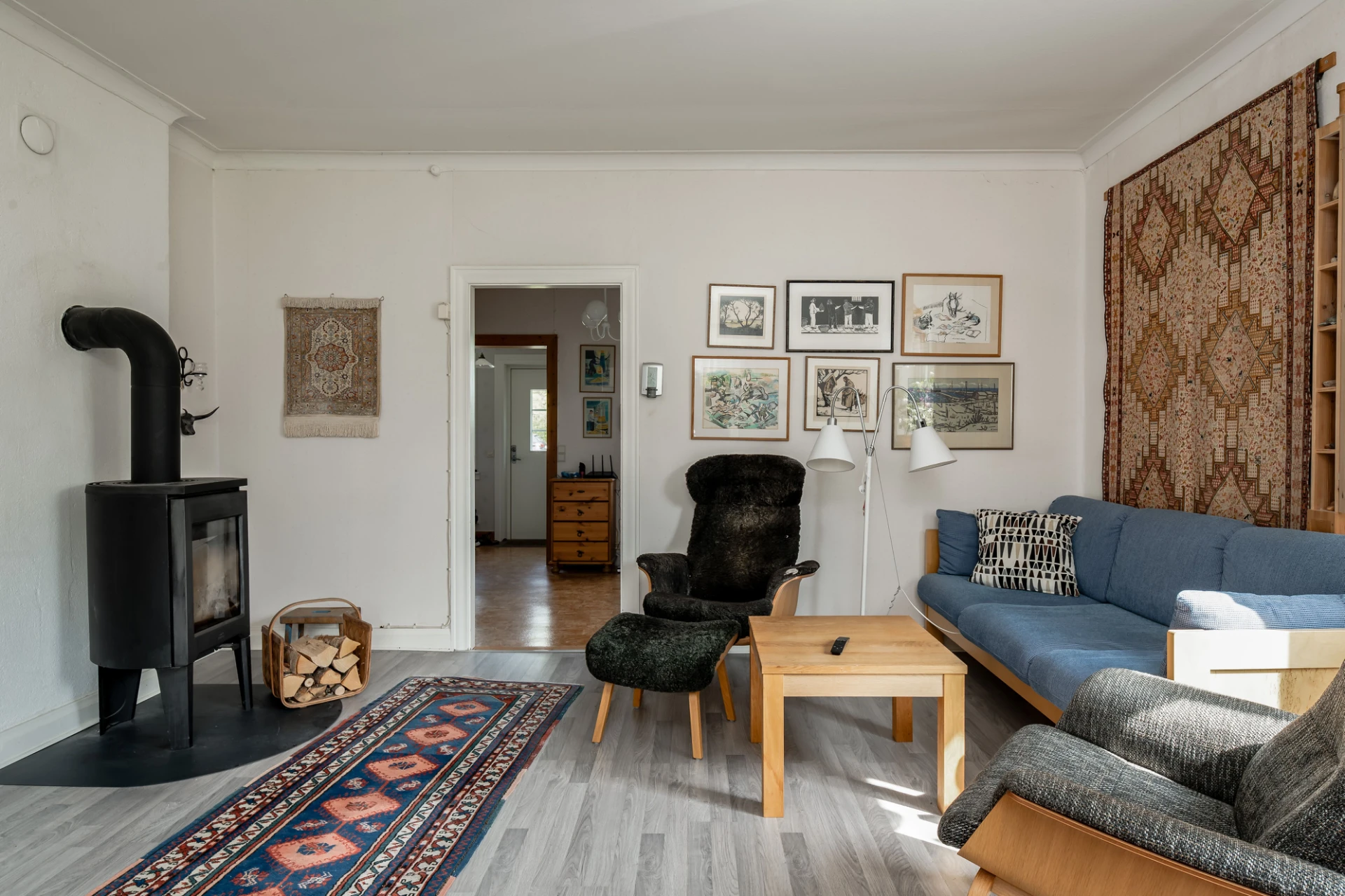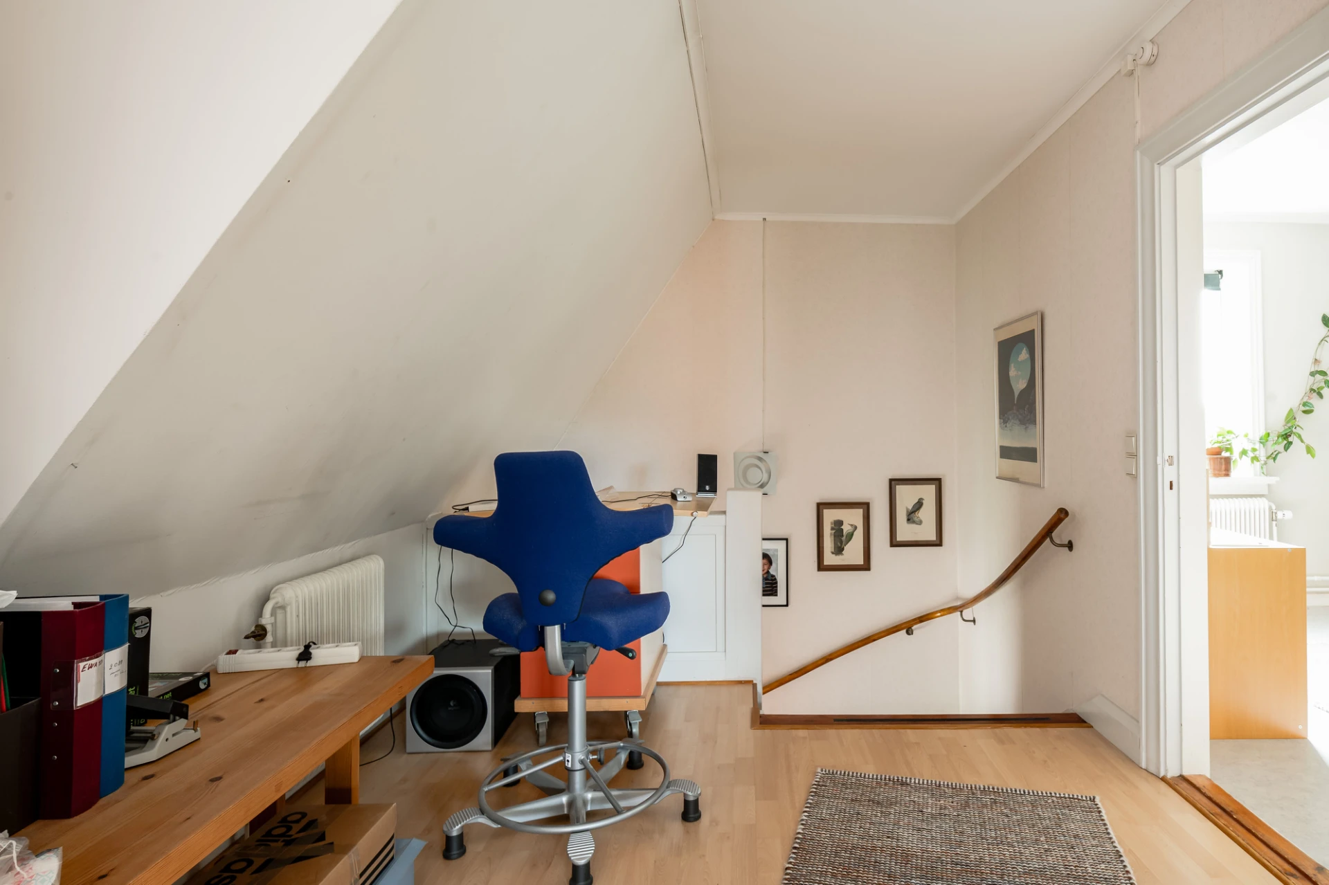 Laminatgolv och ljusa väggar.