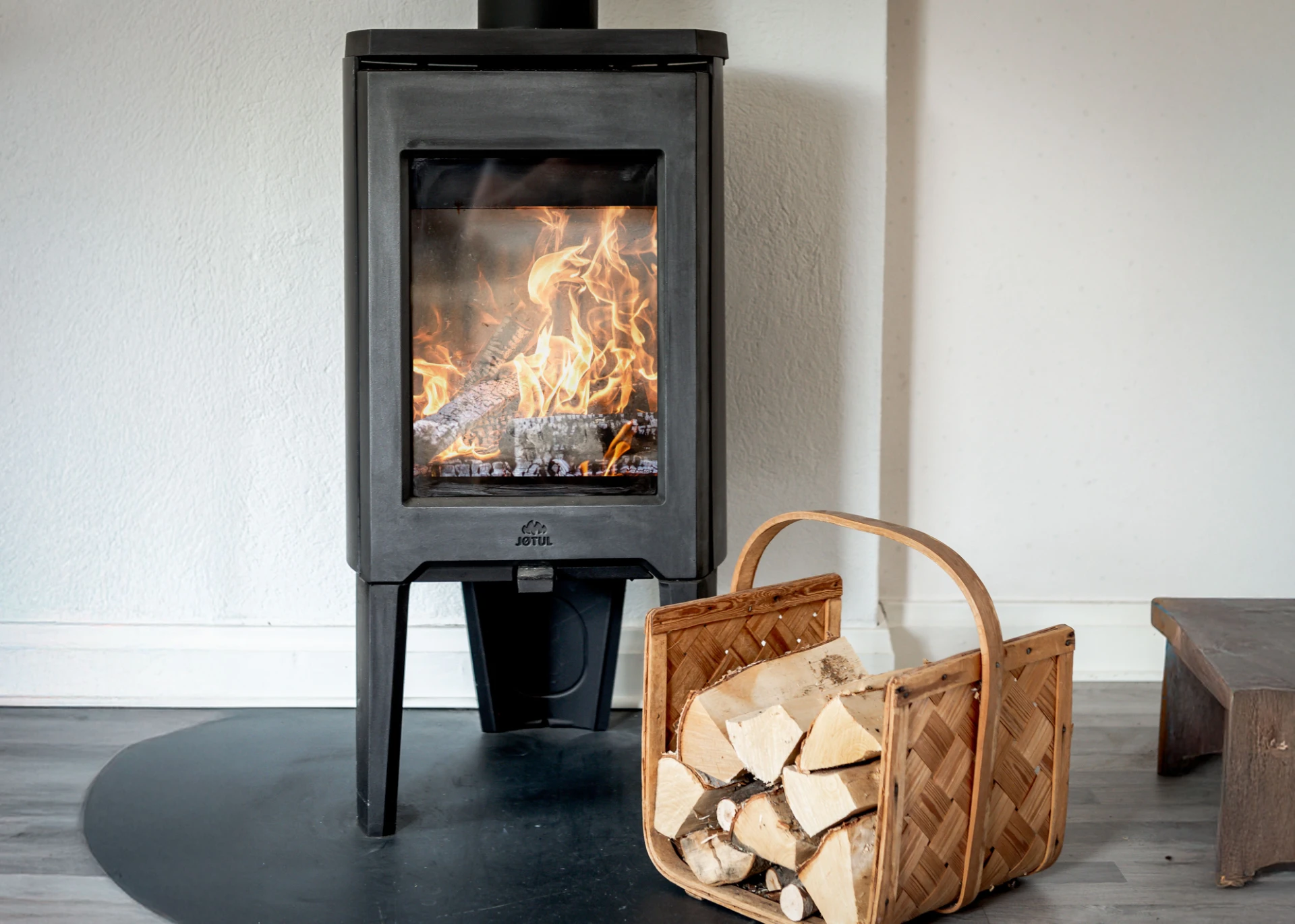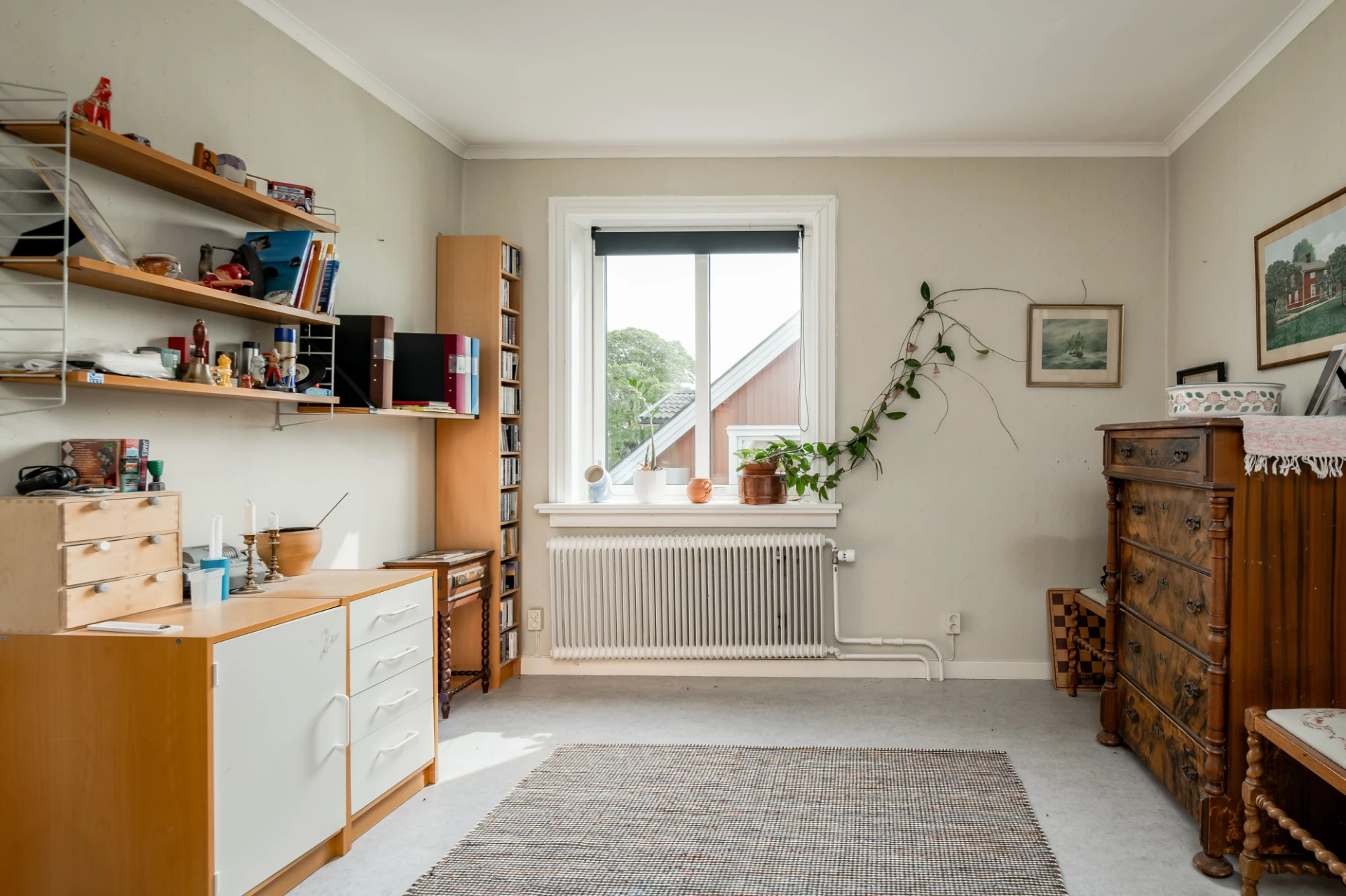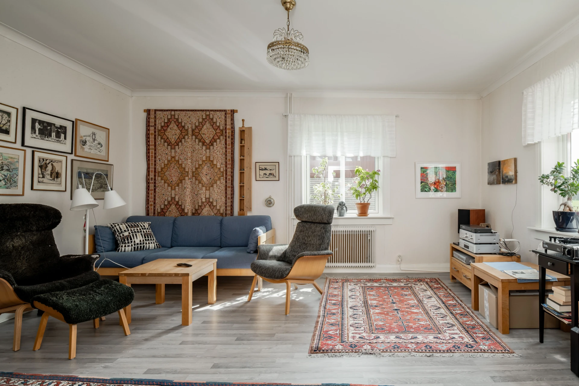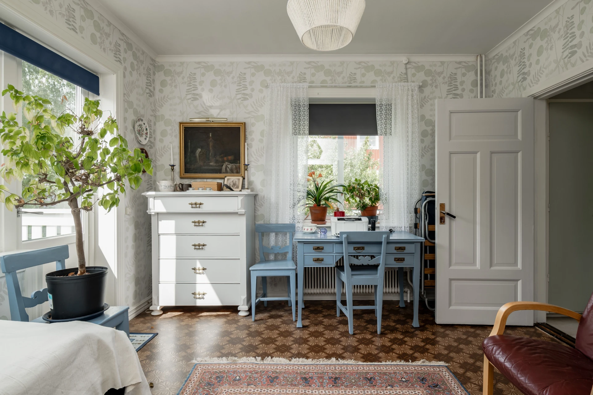 Laminatgolv och ljusa väggar.