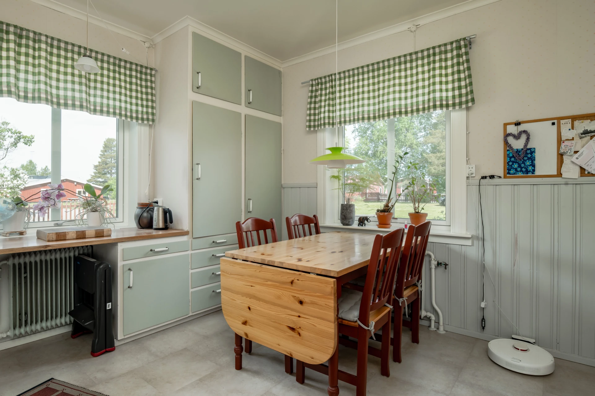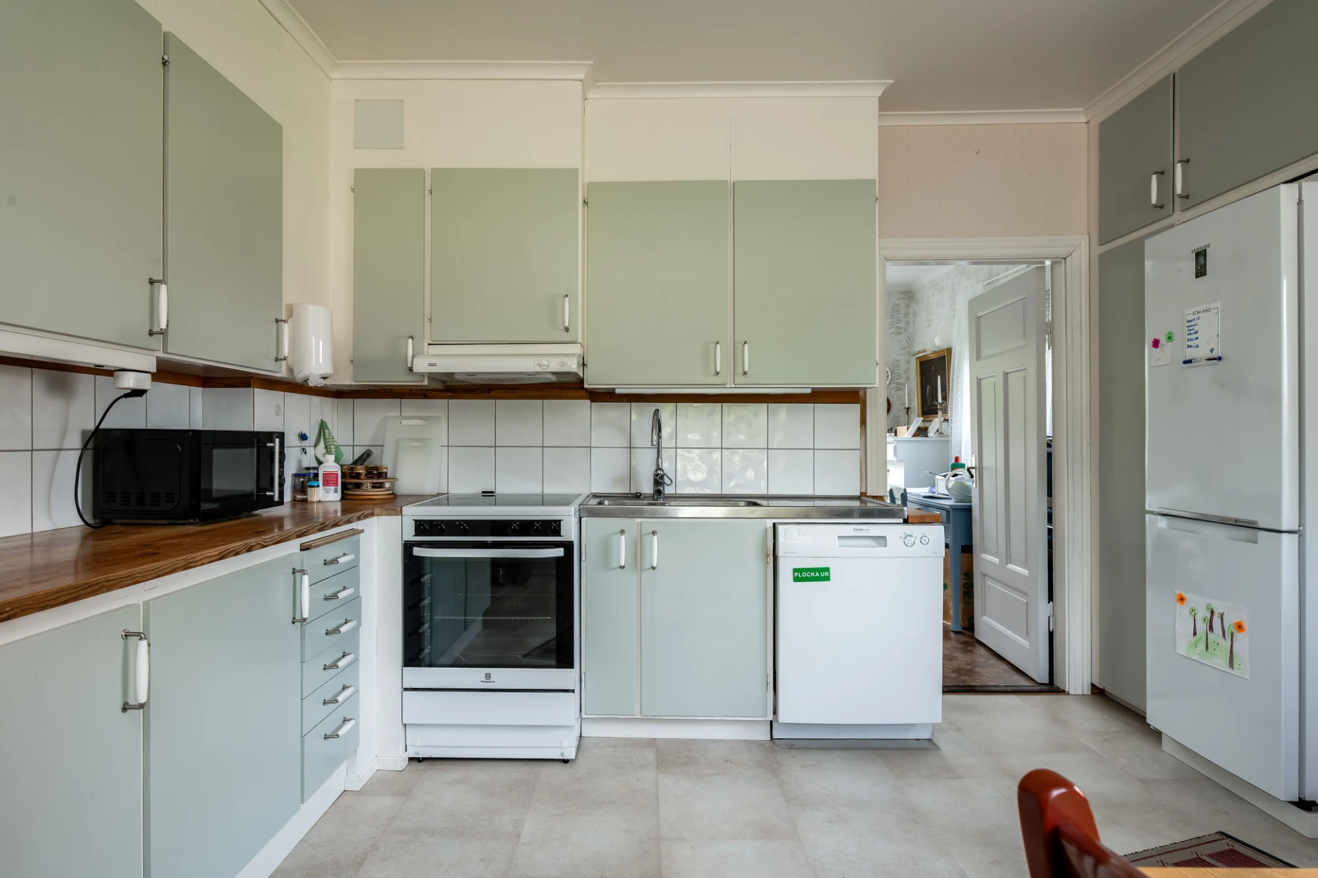 Plastmatta på golv och ljusa väggar. Ljusgröna köksluckor och vitt kakel. Den maskinella utrustningen består av spis med ugn, köksfläkt, diskmaskin samt kyl och frys. Här finns plats för matgrupp.