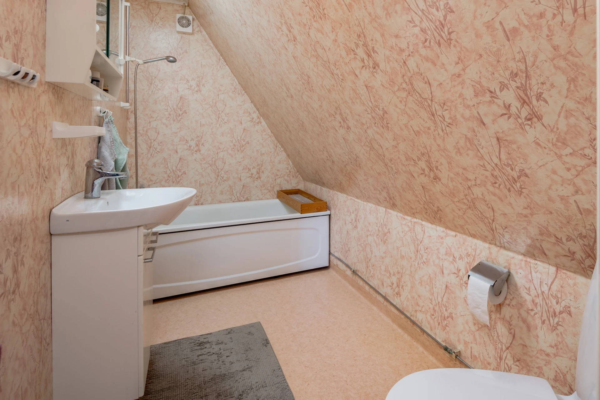 Våtrumsmatta och våtrumstapet. Tvättställ, WC och badkar.