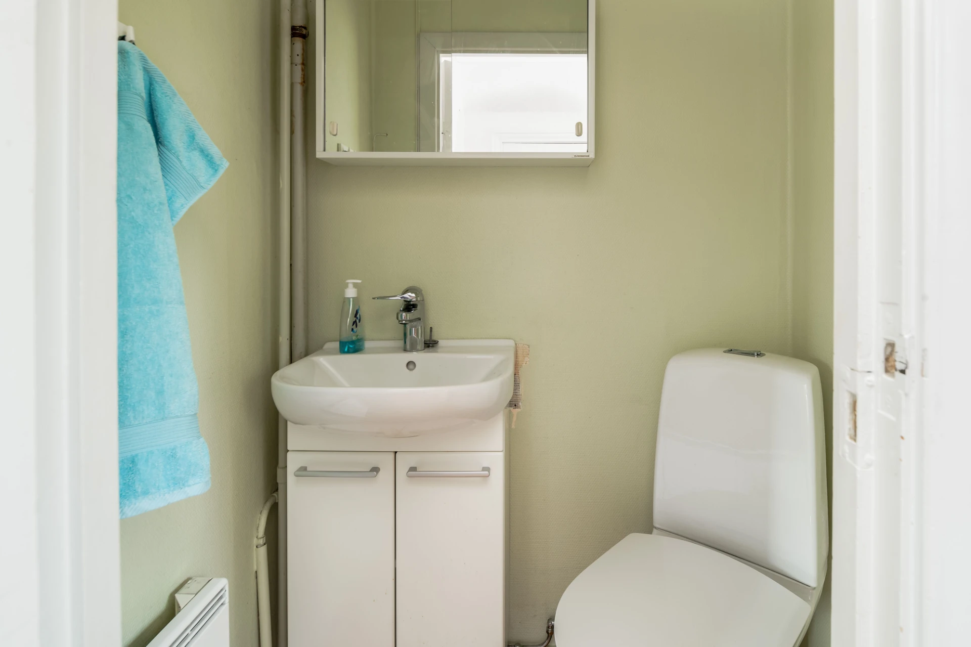 Ljusgröna väggar. Tvättställ och WC.