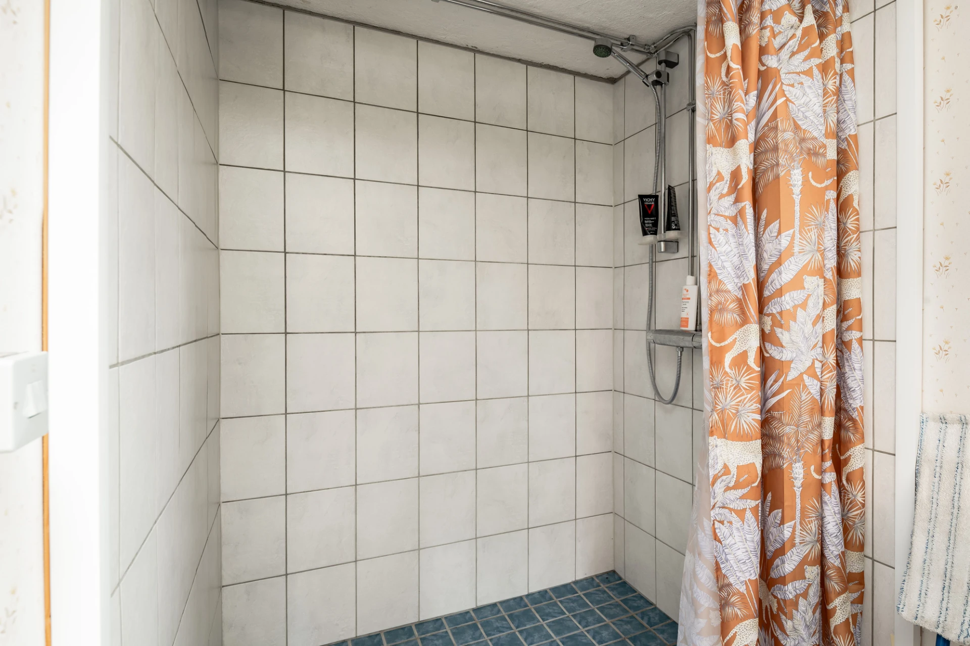 Blått klinkergolv och ljust kakel på väggar. Utrustat med dusch.