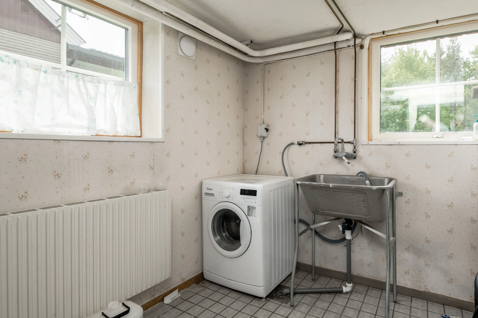 Klinkergolv och ljusa mönstrade väggar. Tvättho och tvättmaskin.