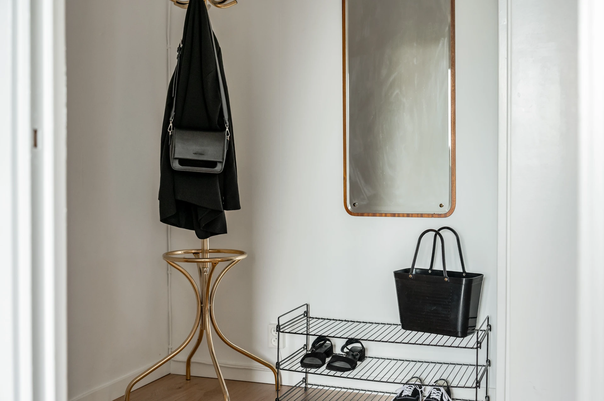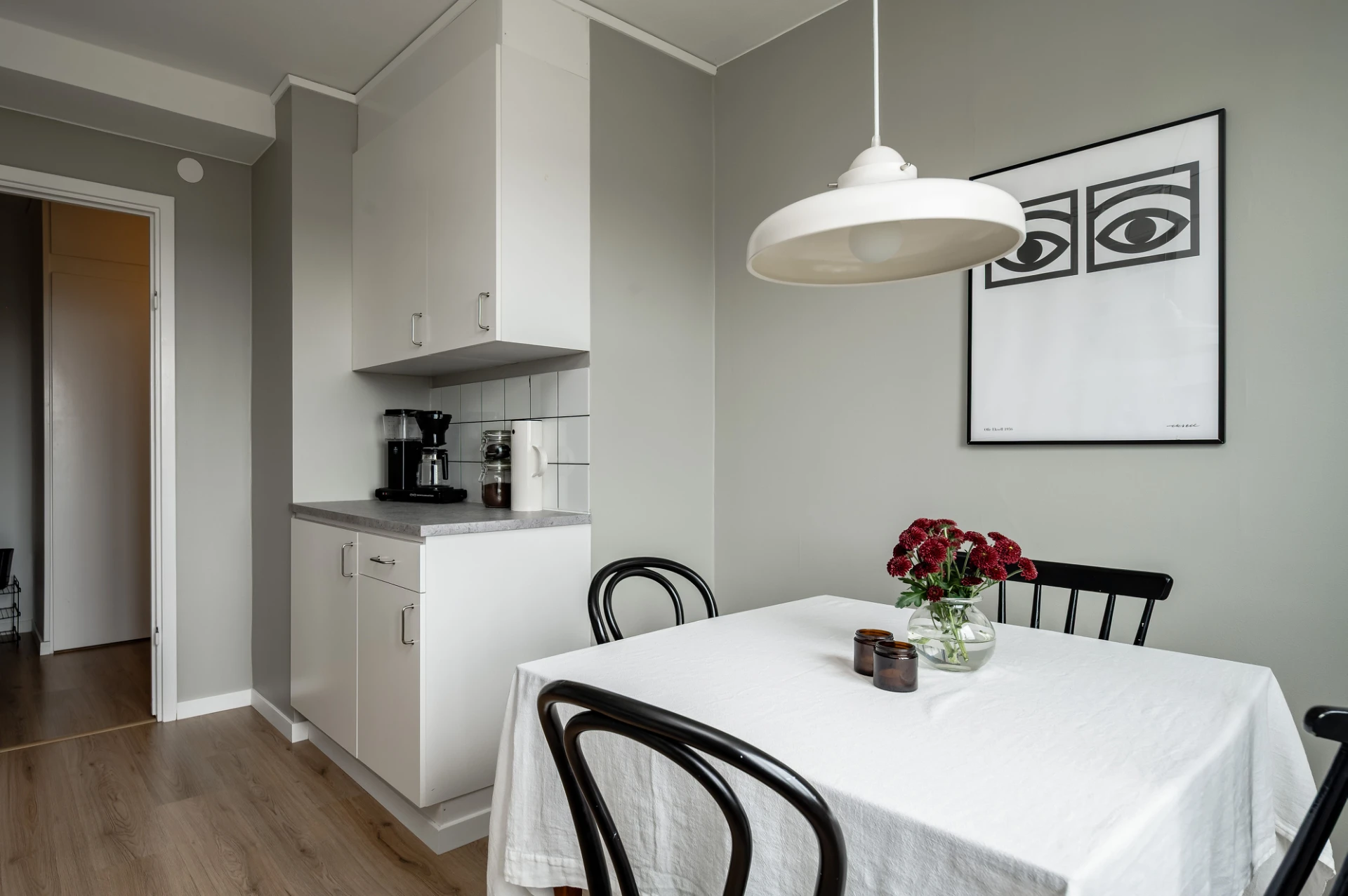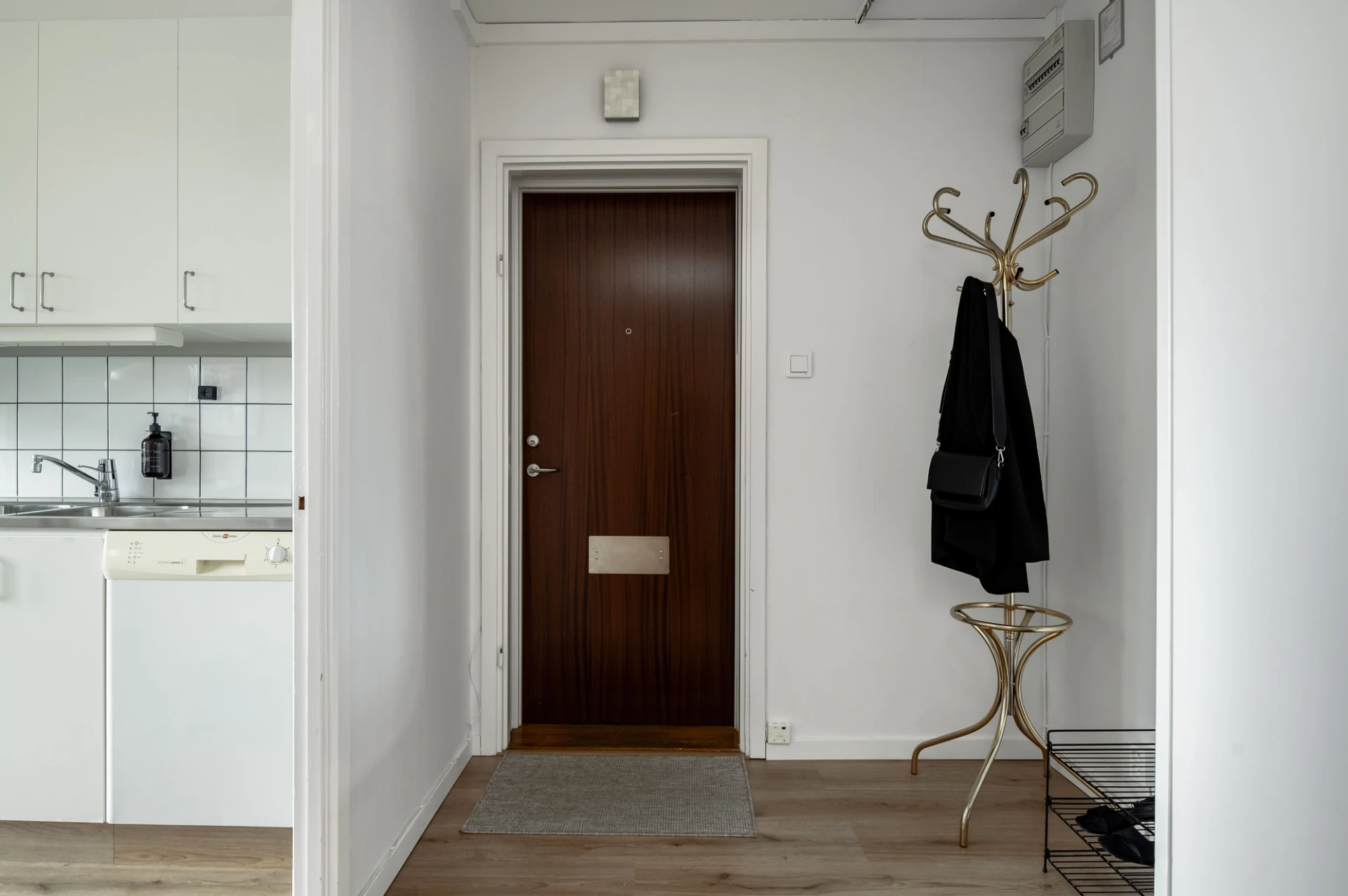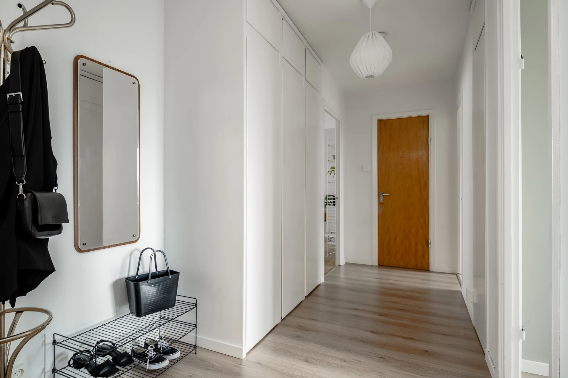 Laminatgolv och vita väggar. Här finns möjlighet till avhängning och förvaring i garderob.