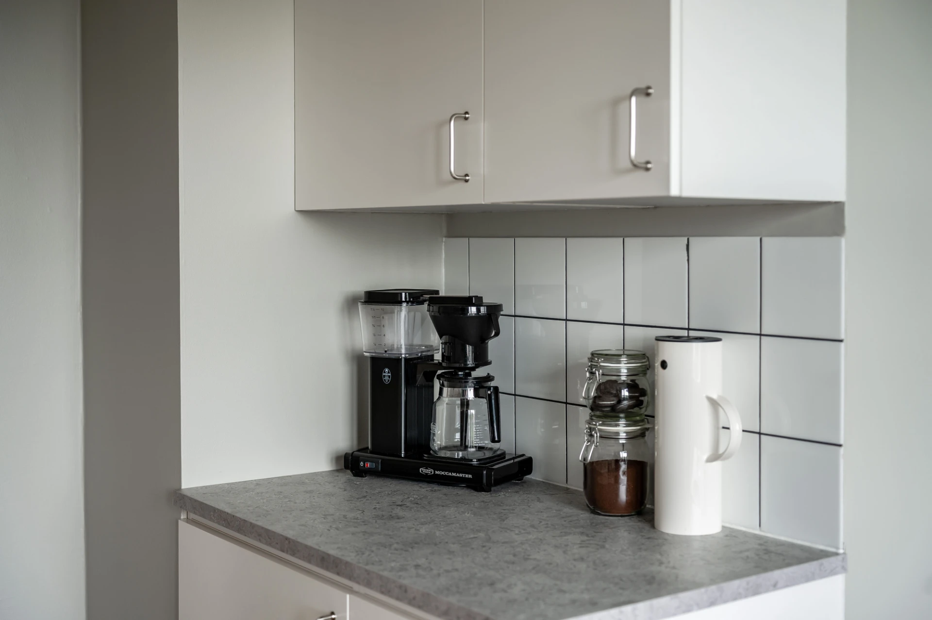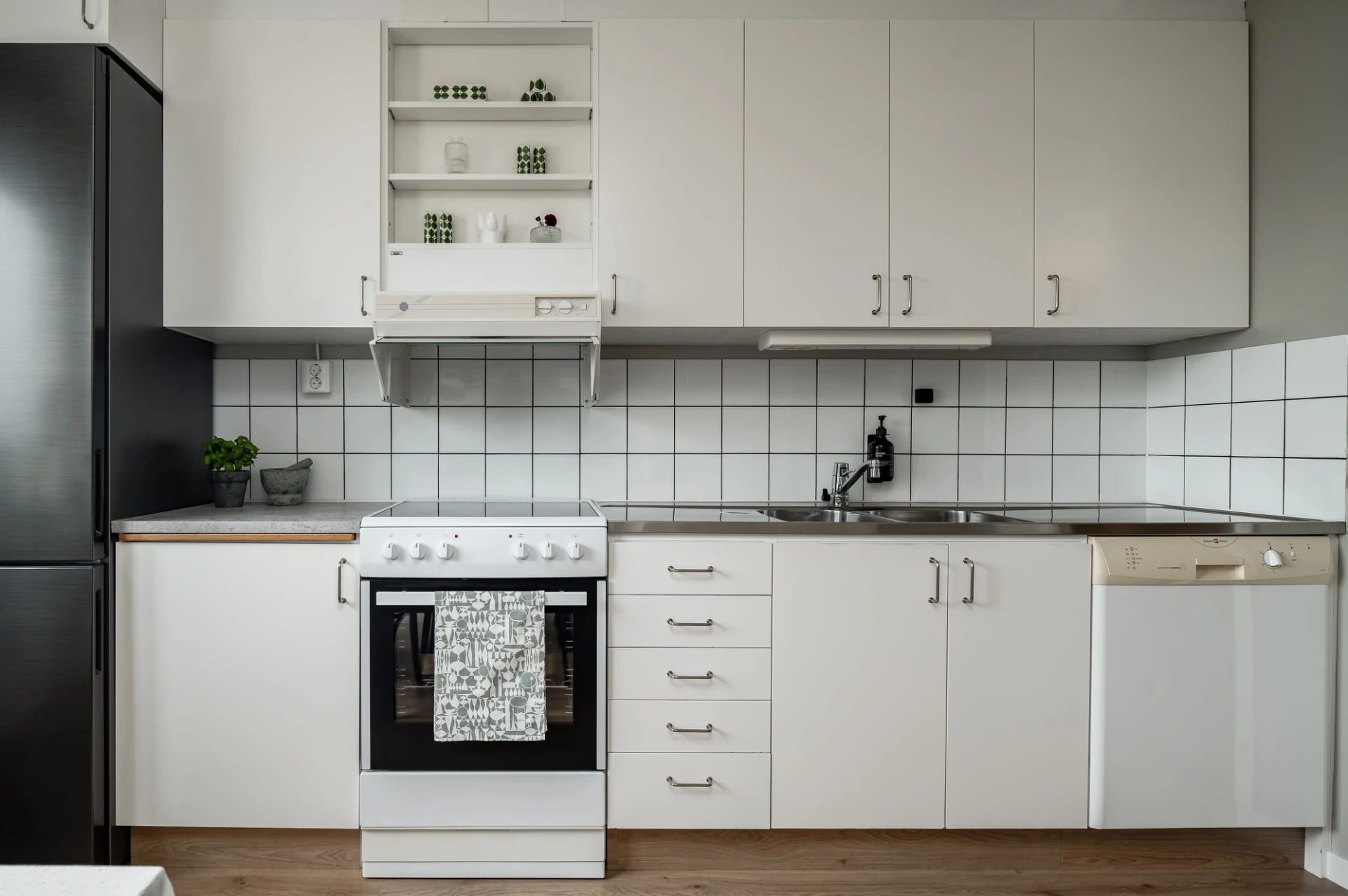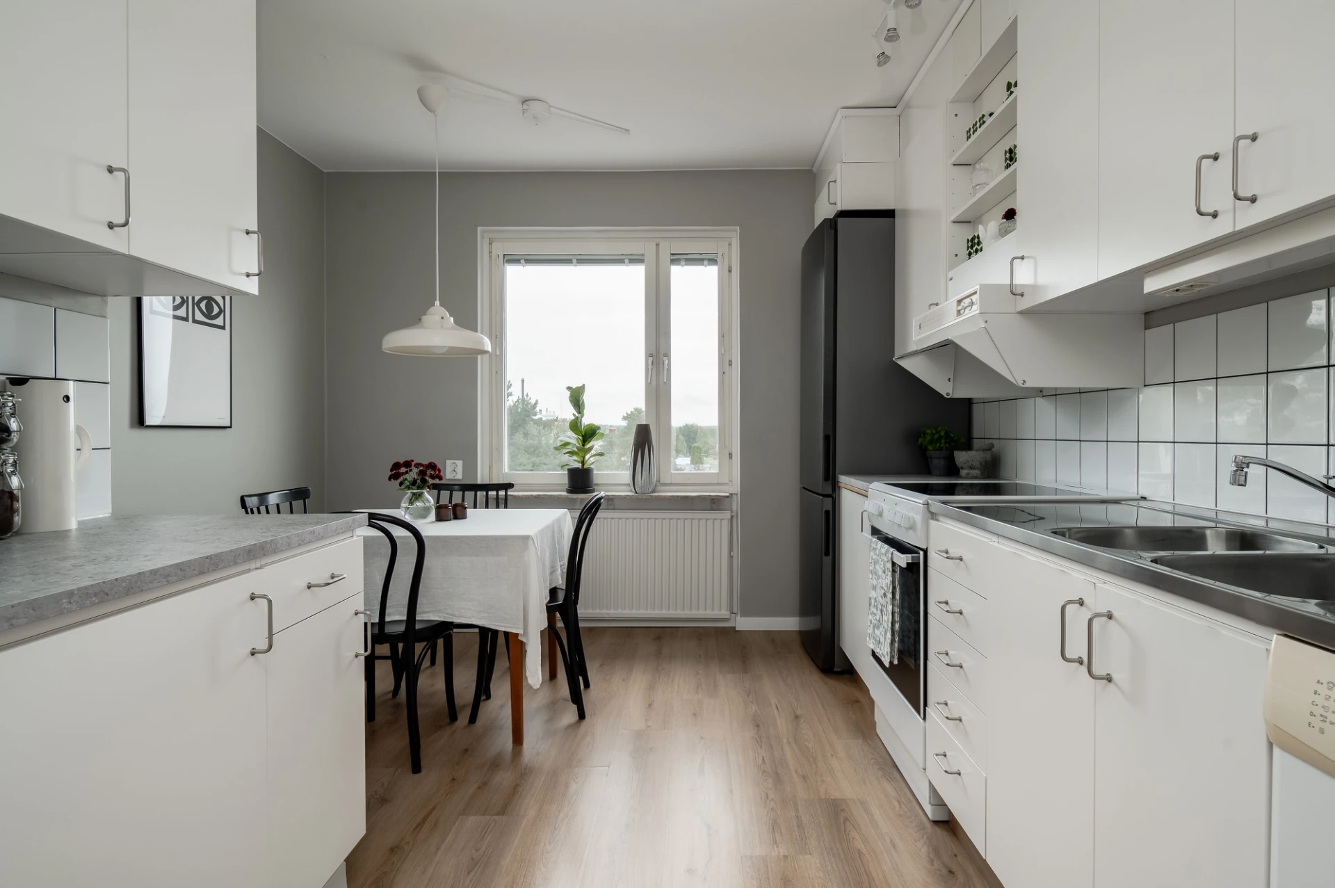 Laminatgolv och grå väggar. Köksluckor i vitt, grå laminatbänkskiva och vitt kakel. Den maskinella utrustningen består av köksfläkt, spis med ugn, diskmaskin samt kyl och frys. Här finns plats för matgrupp.