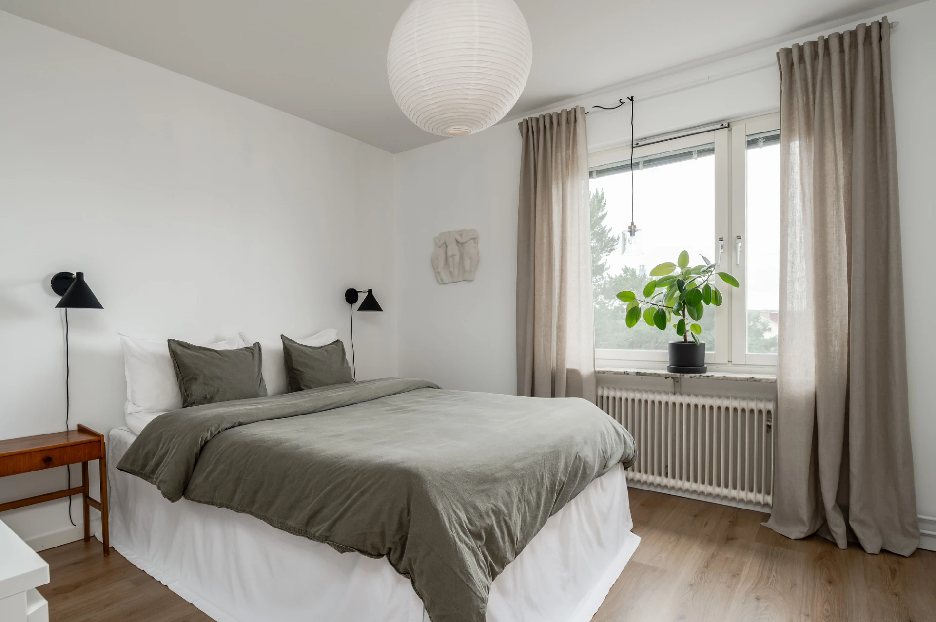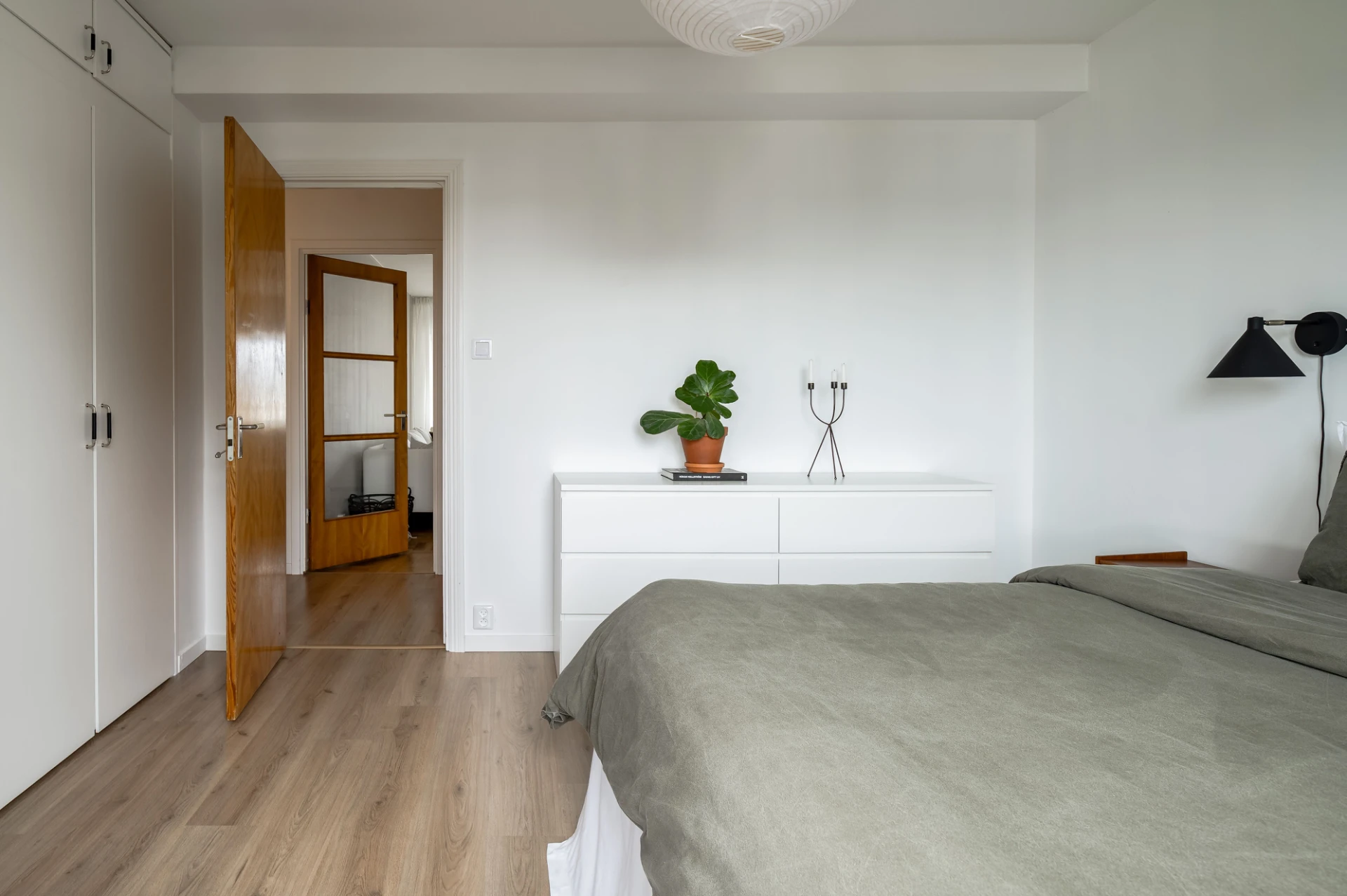 Laminatgolv och vita väggar. Här finns plats för dubbelsäng med tillhörande möblemang. Förvaring i garderob.
