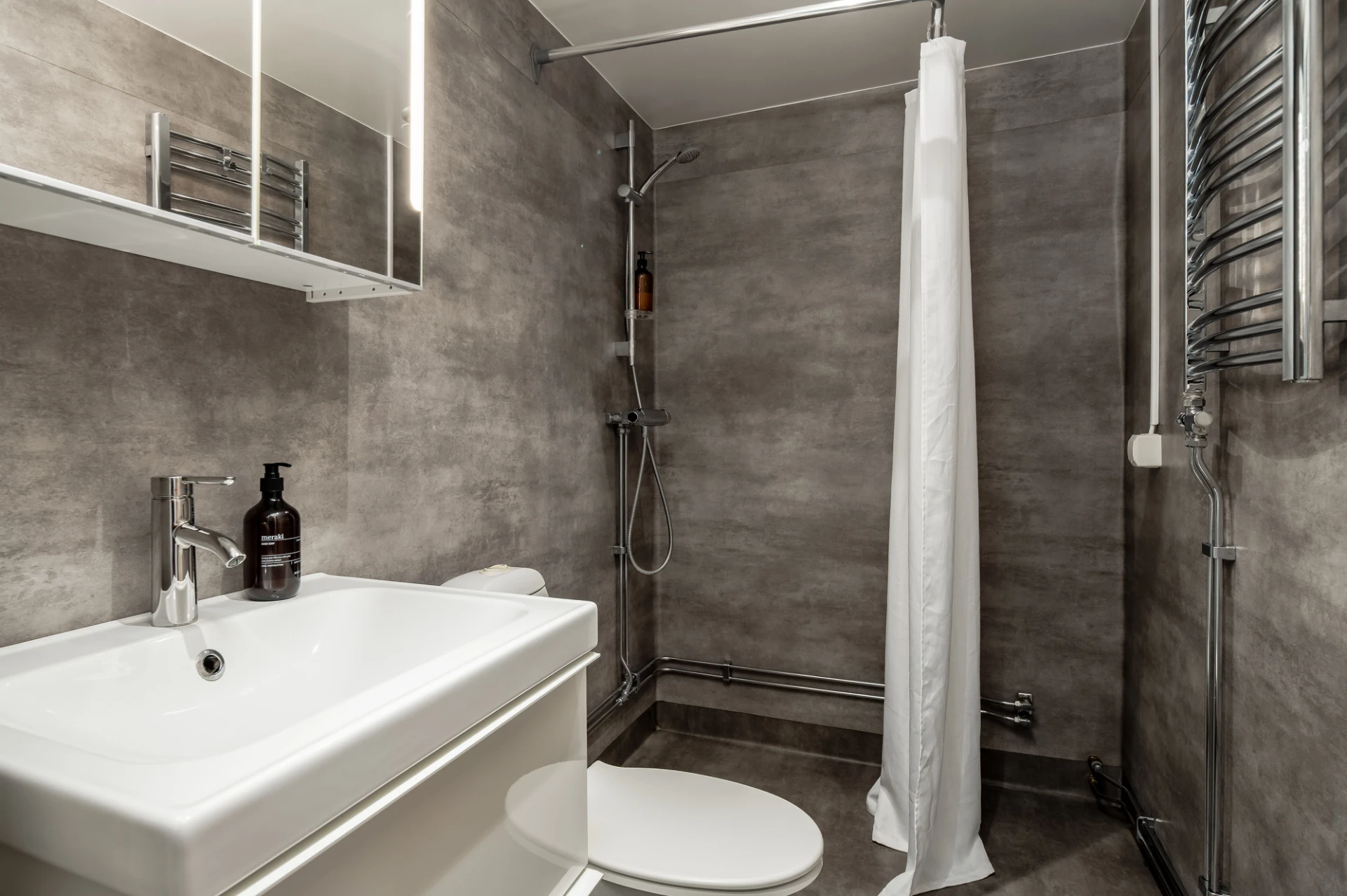 Våtrumsmatta och våtrumstapet på väggar. Handfat, WC, dusch och handdukstork.