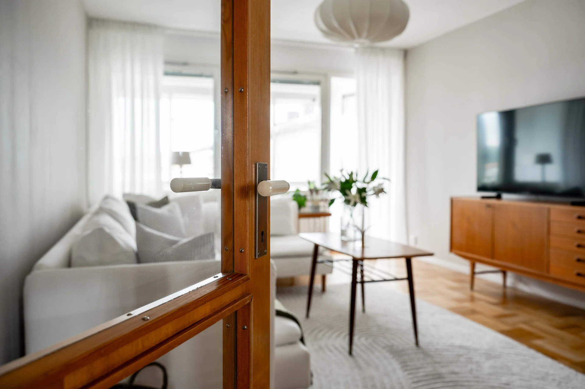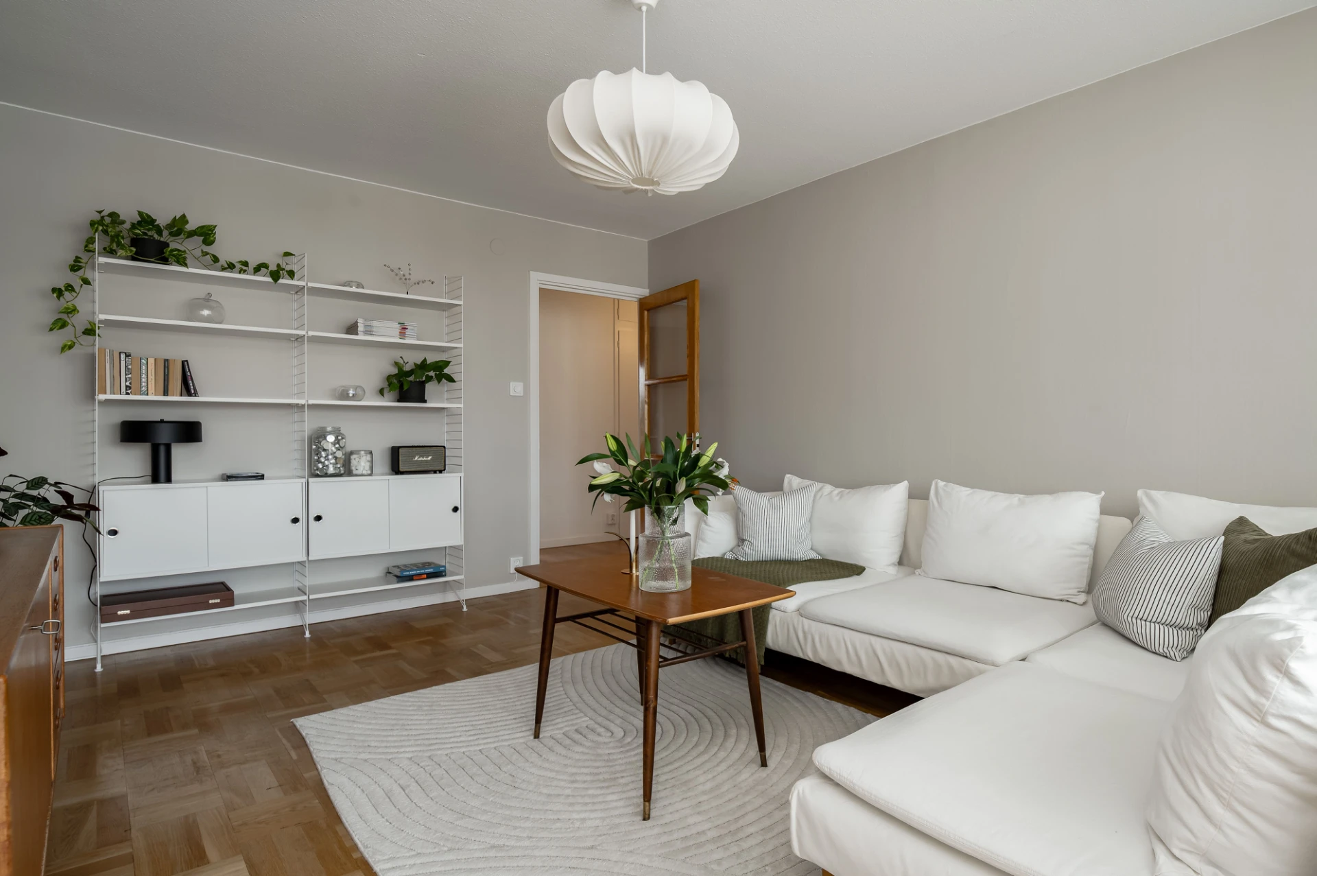 Parkettgolv och beige väggar. Här finns plats för soffa med tillhörande möblemang. Utgång till inglasad balkong.