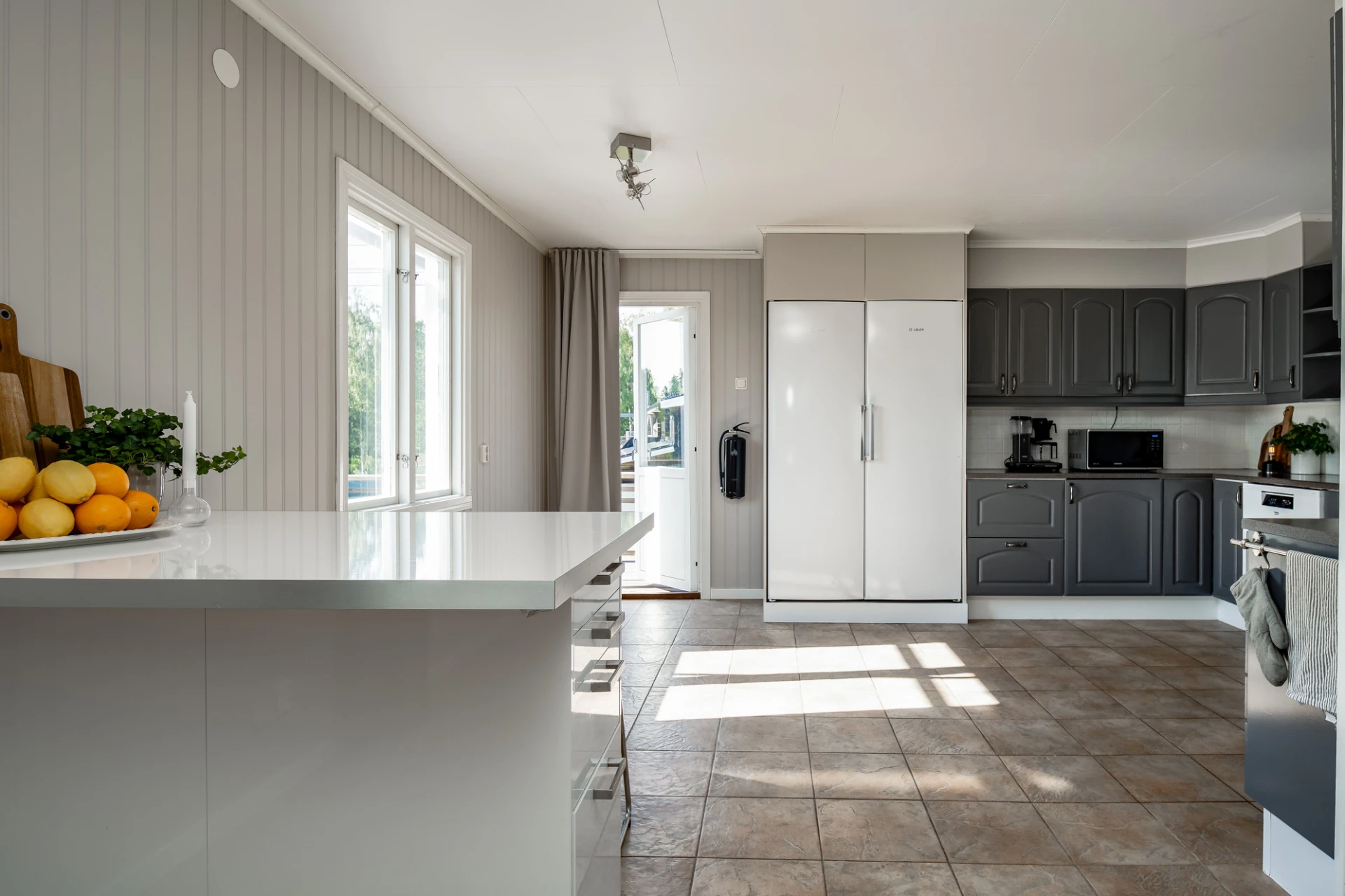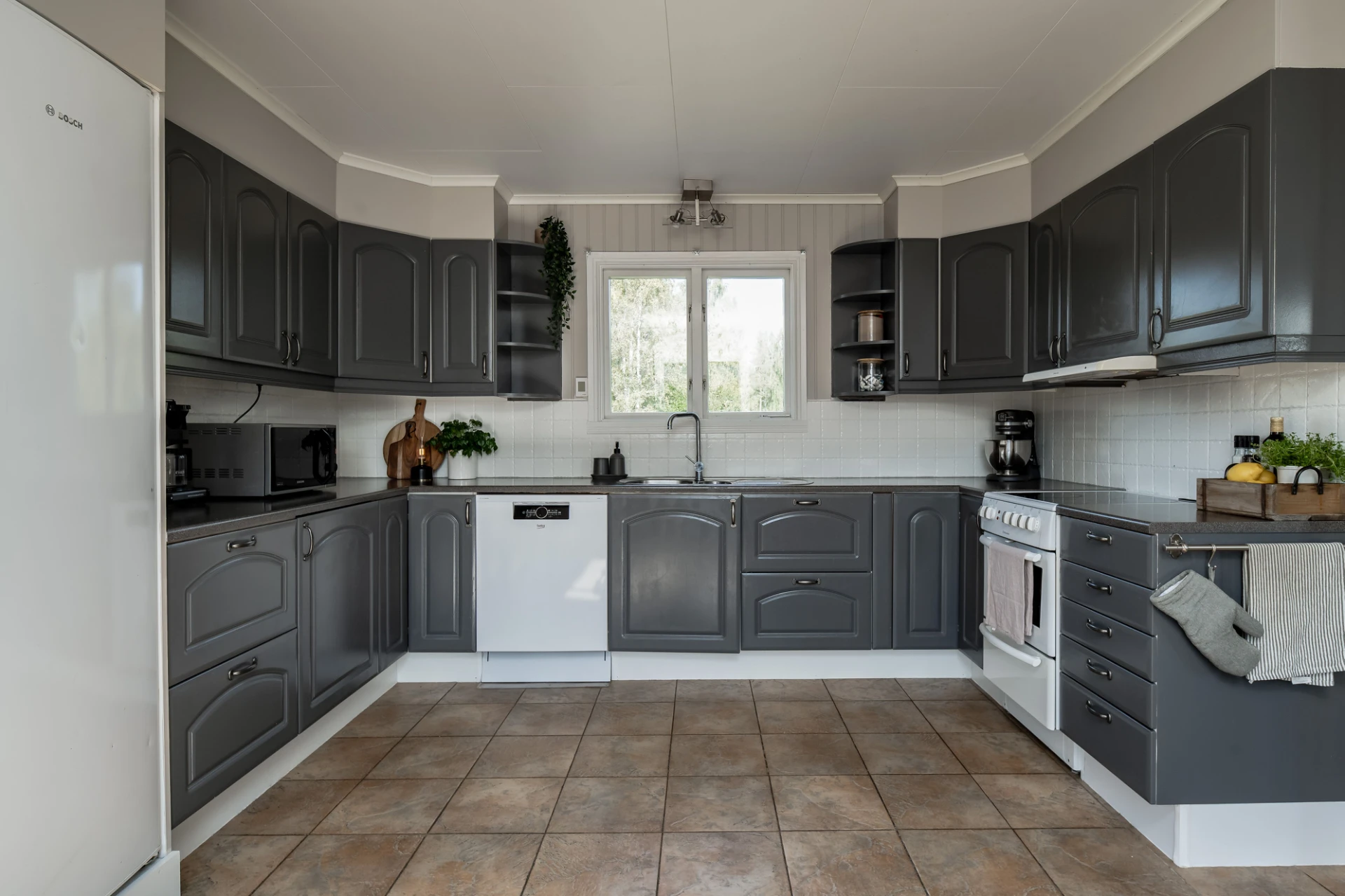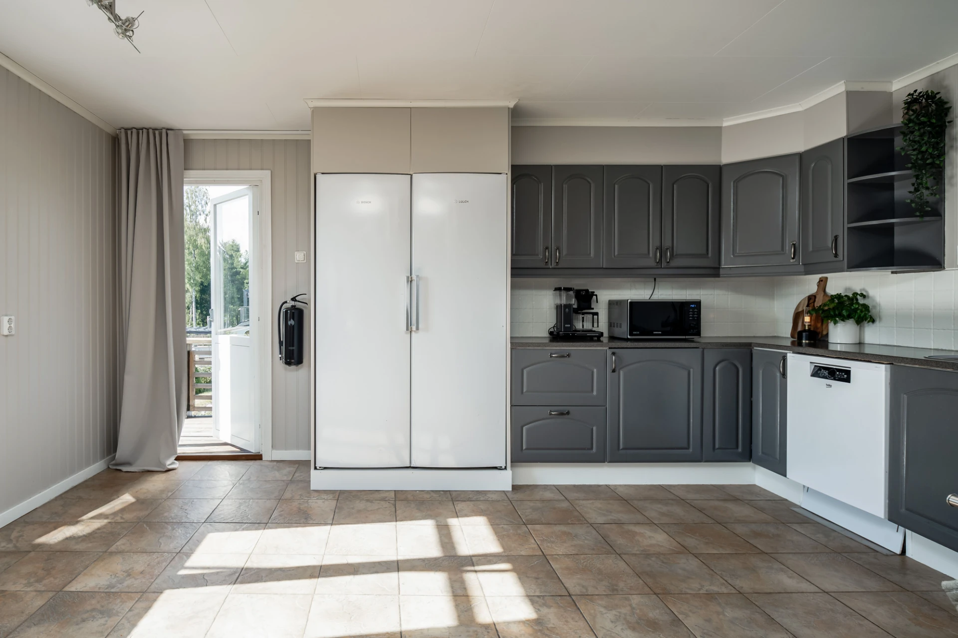 Klinkergolv och beige väggar. Grå köksluckor och vita köksluckor. Den maskinella utrustningen består av köksfläkt, spis med ugn, diskmaskin samt kyl och frys. Utgång till altan.