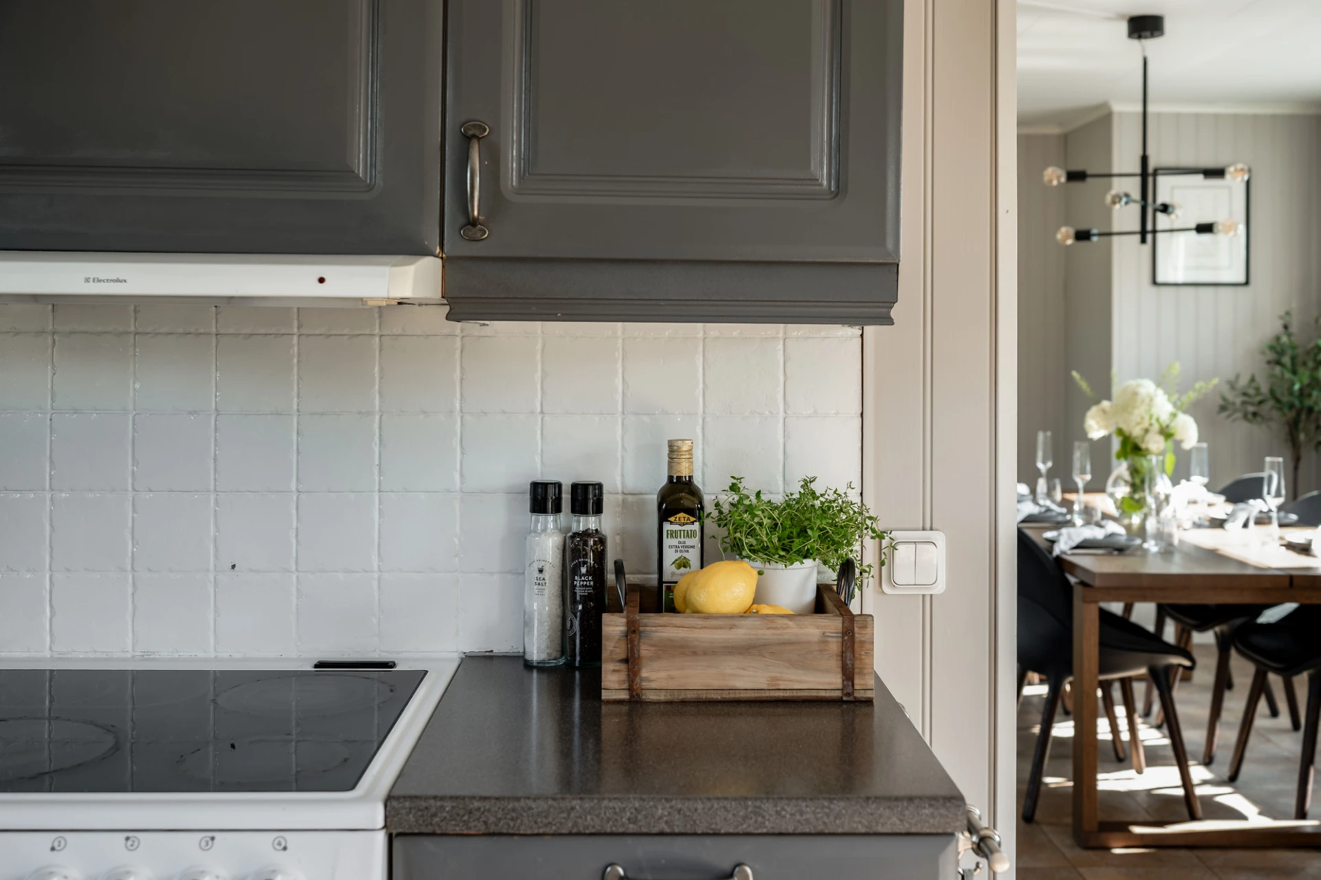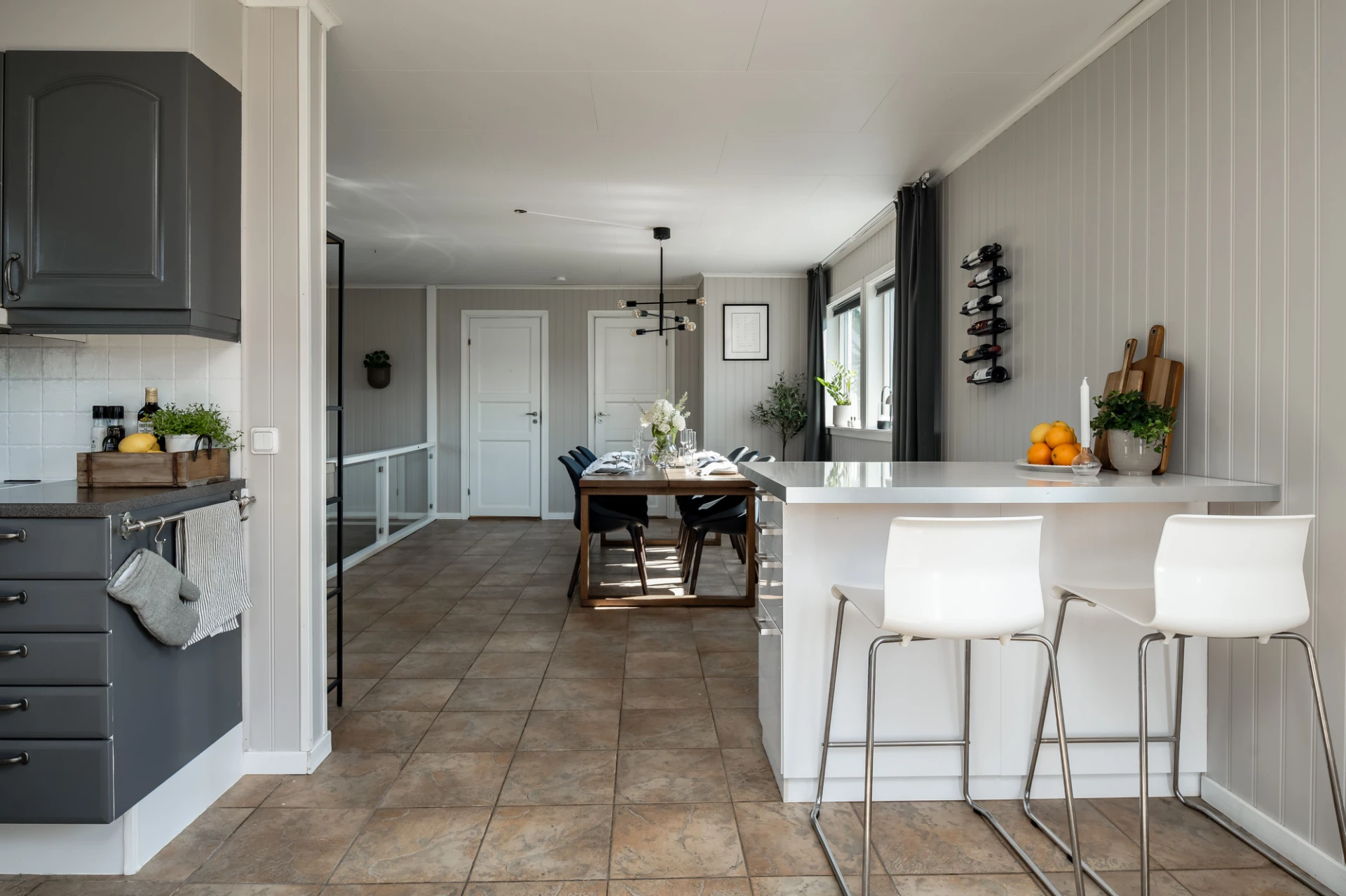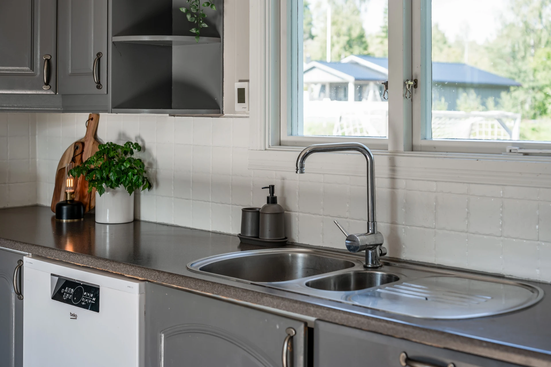 Klinkergolv och beige väggar. Grå köksluckor och vita köksluckor. Den maskinella utrustningen består av köksfläkt, spis med ugn, diskmaskin samt kyl och frys. Utgång till altan.