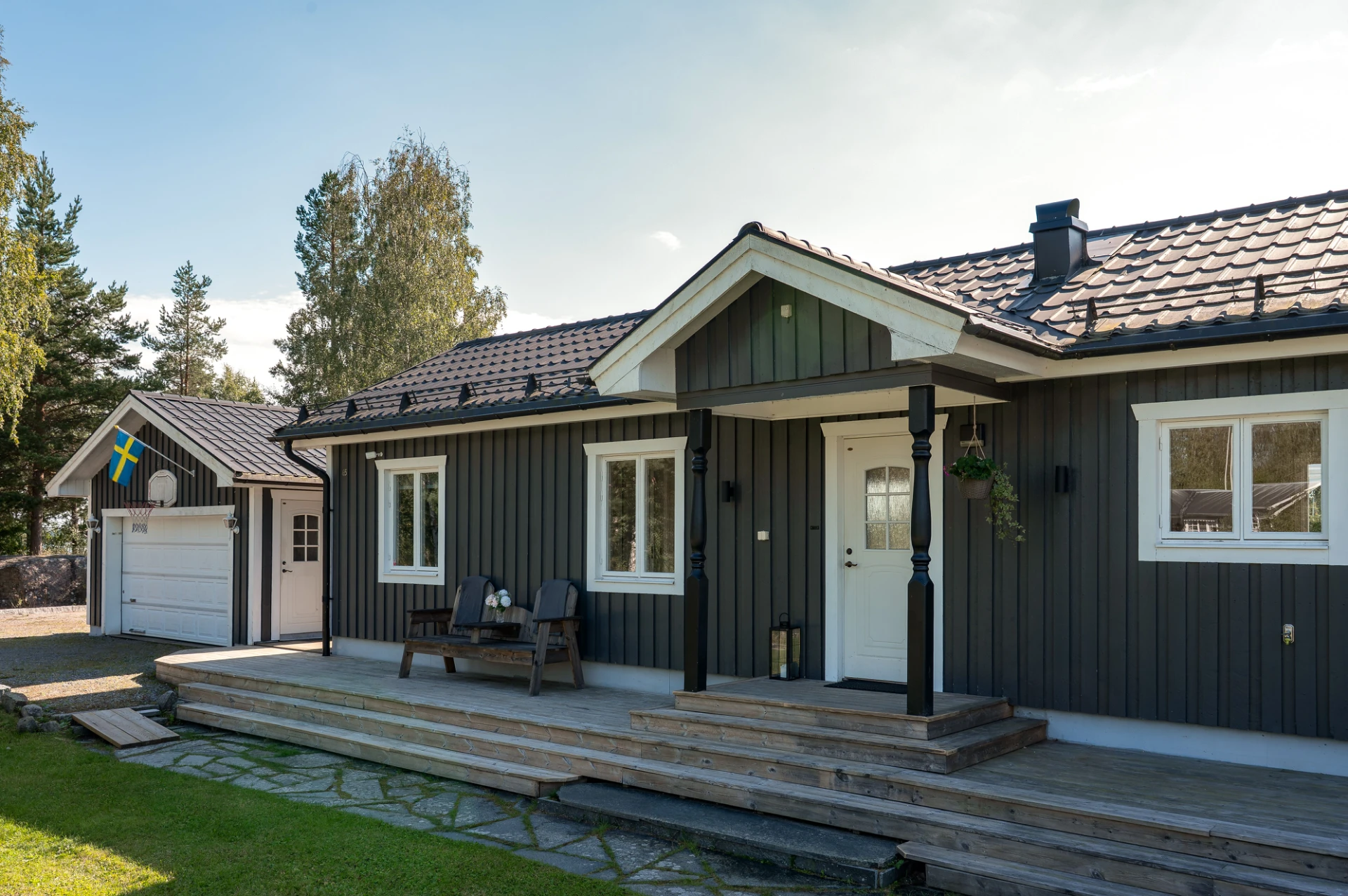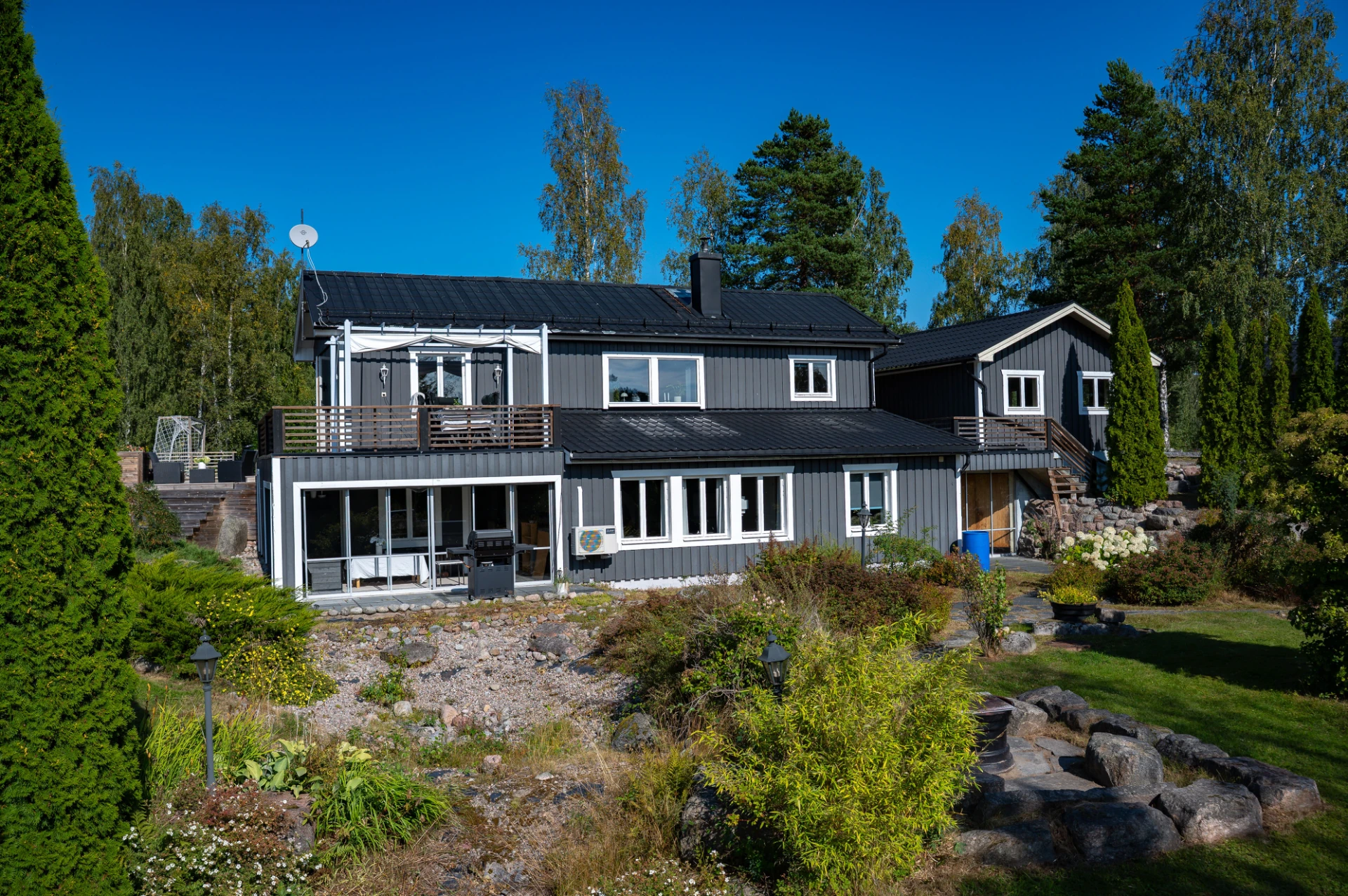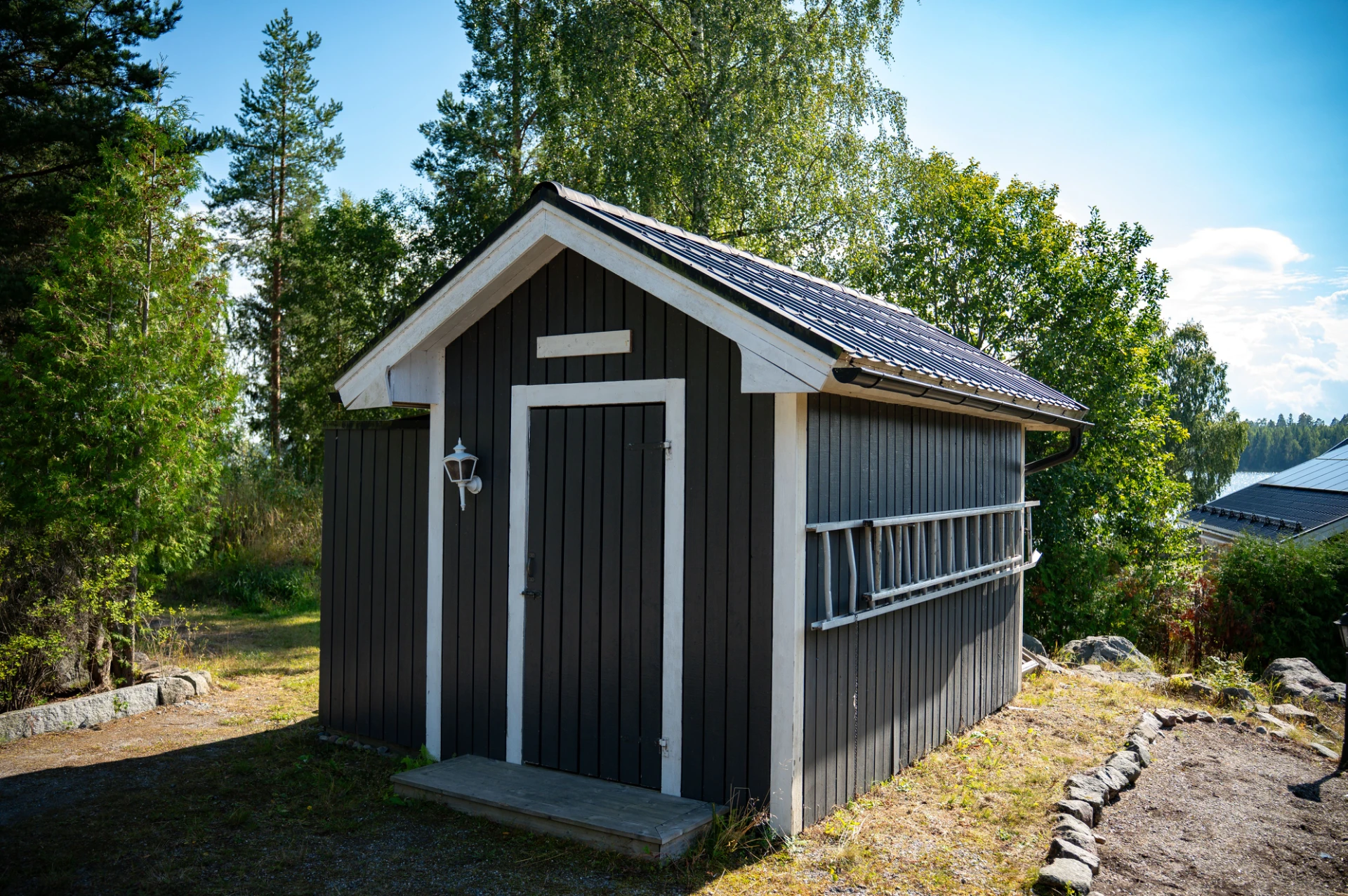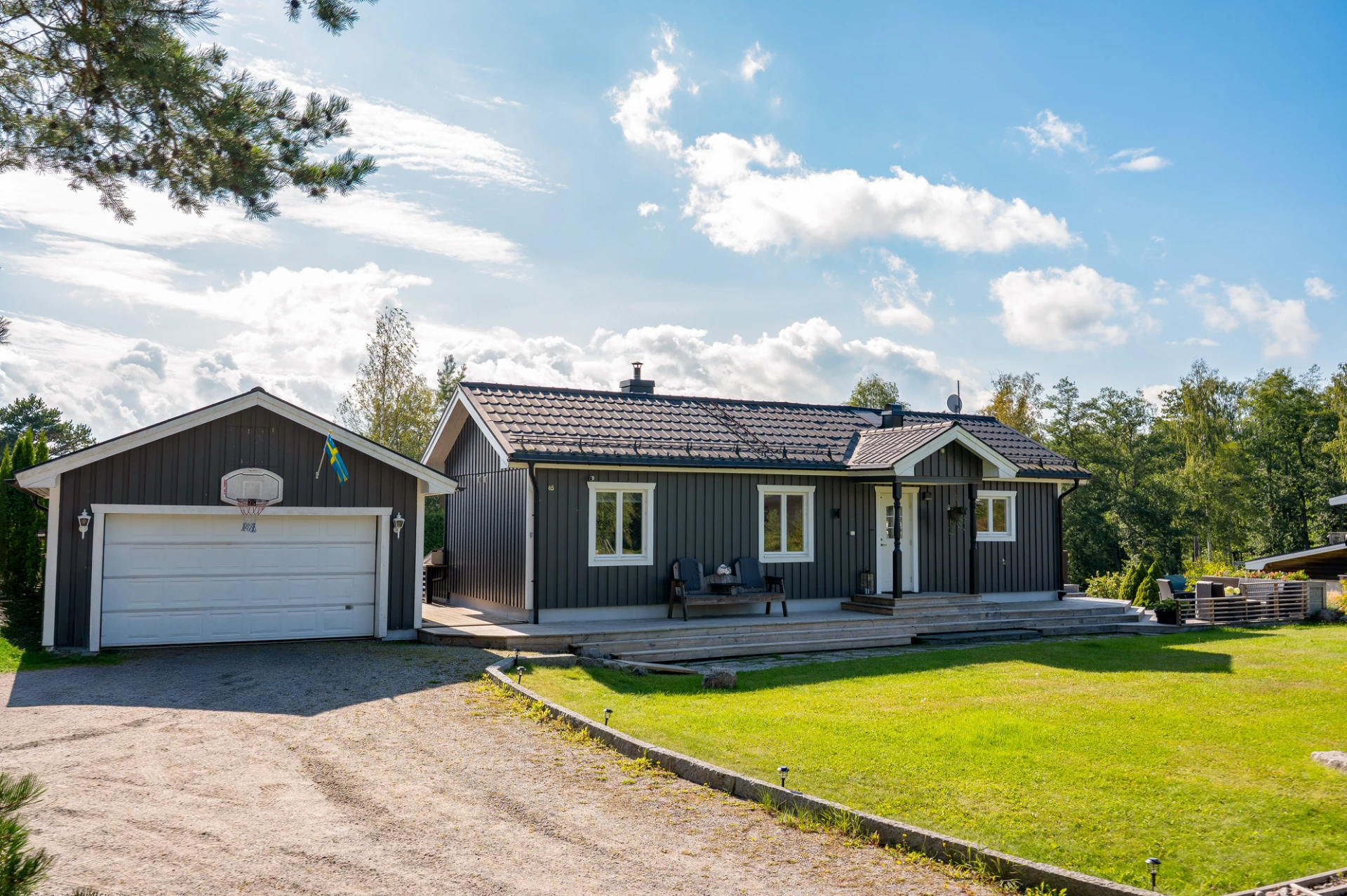 På tomten finns dessutom flera praktiska komplementbyggnader så som garage och förråd.