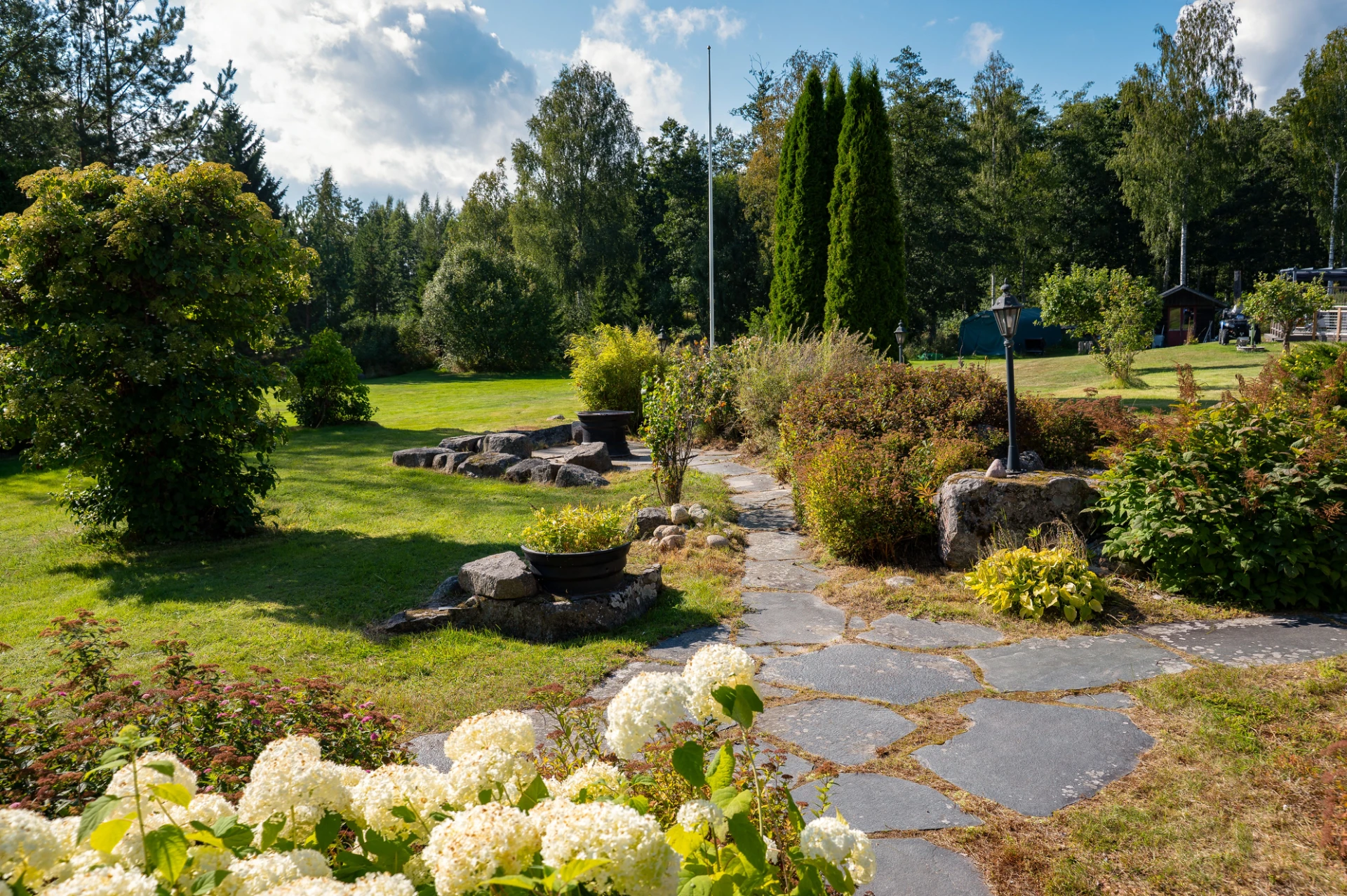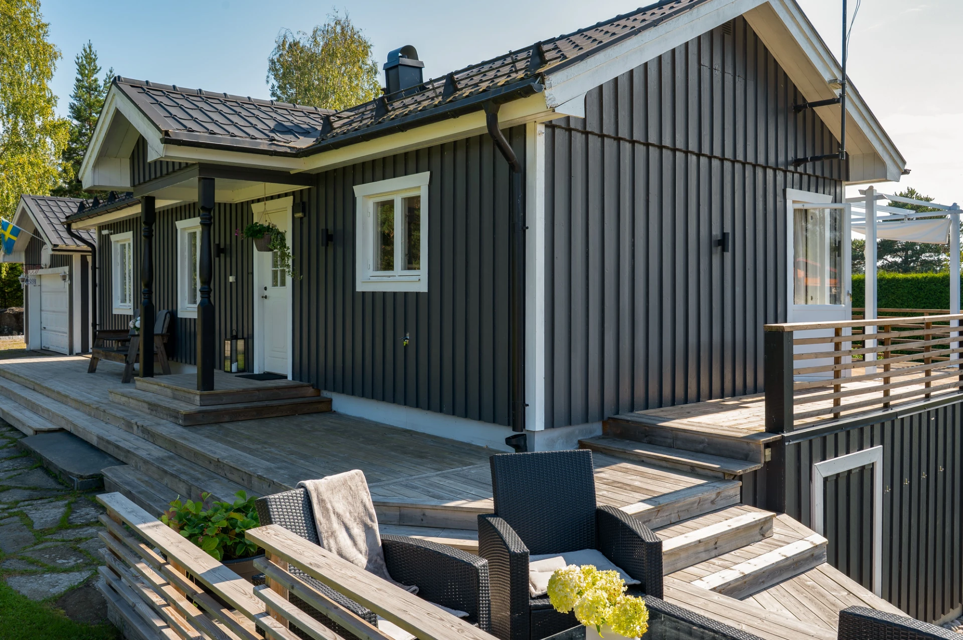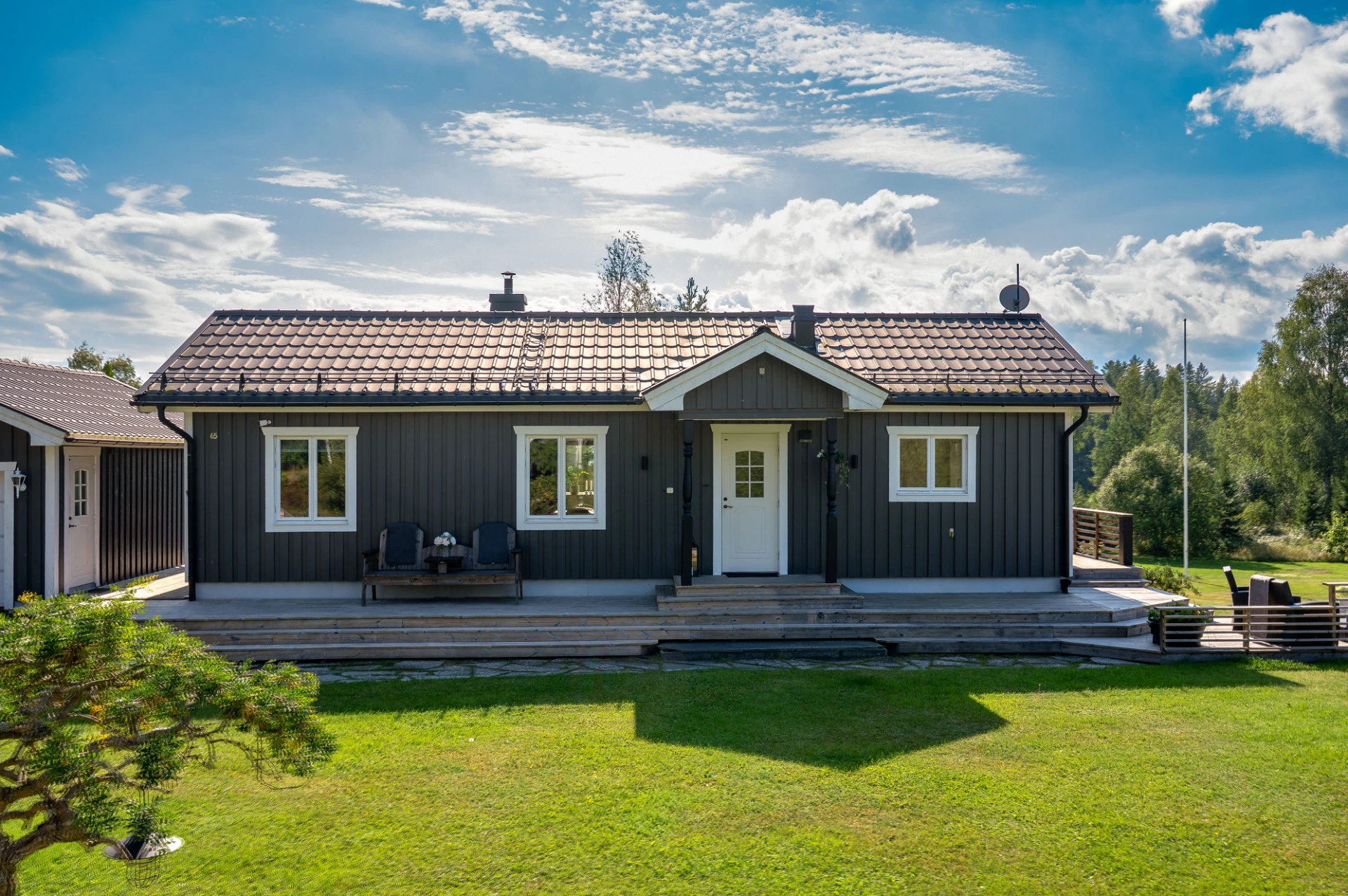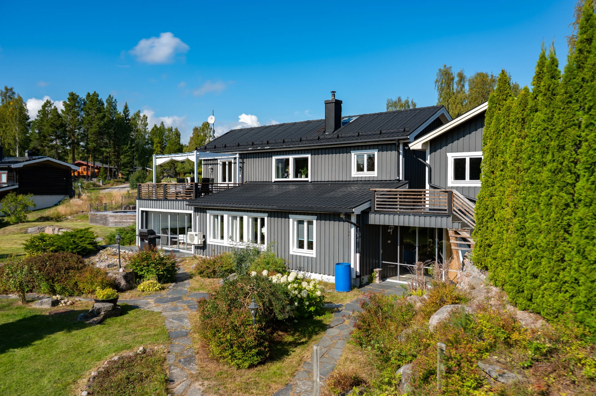 På tomten finns dessutom flera praktiska komplementbyggnader så som garage och förråd.