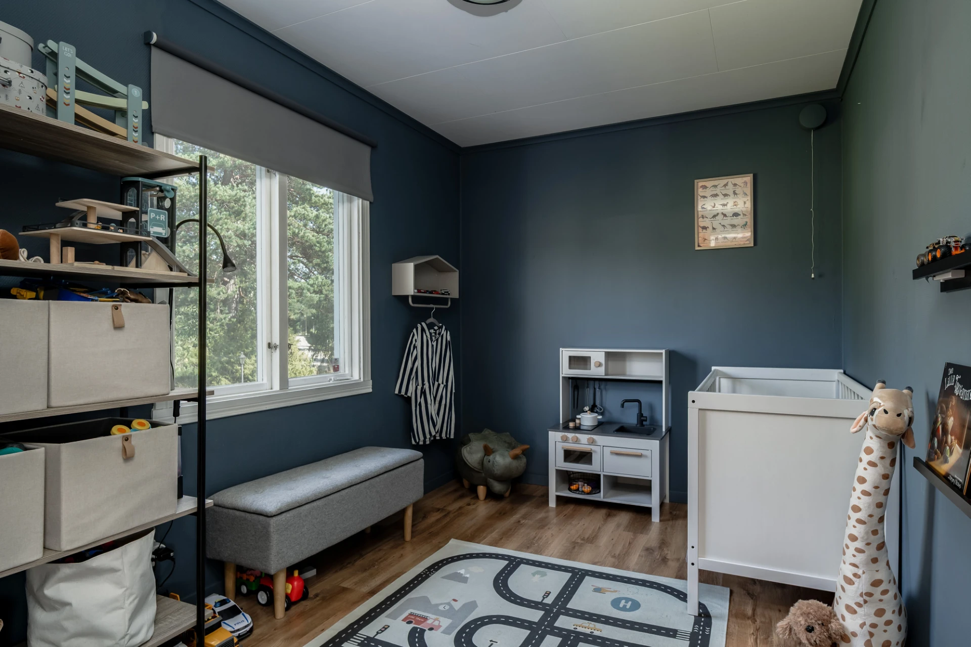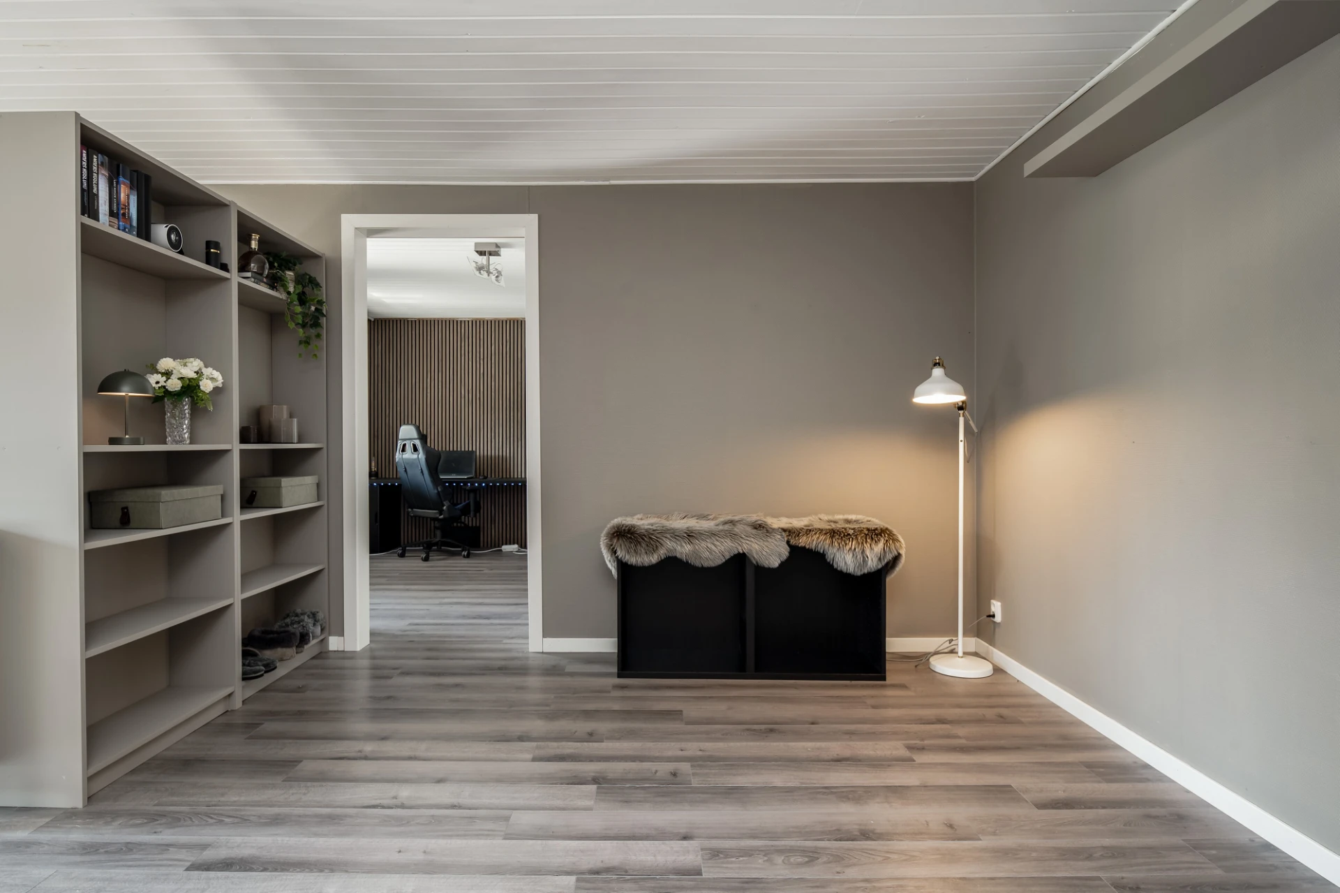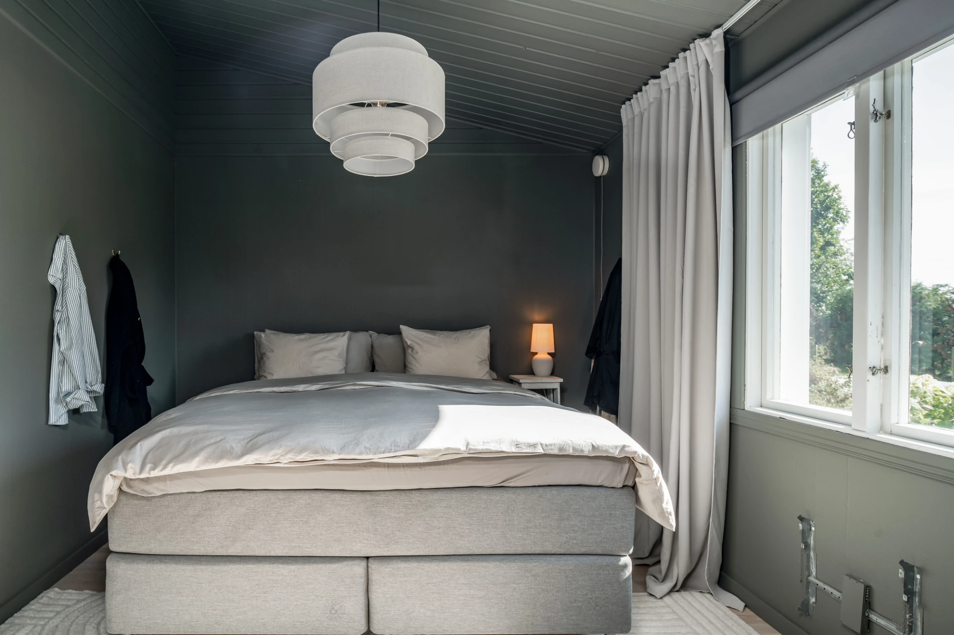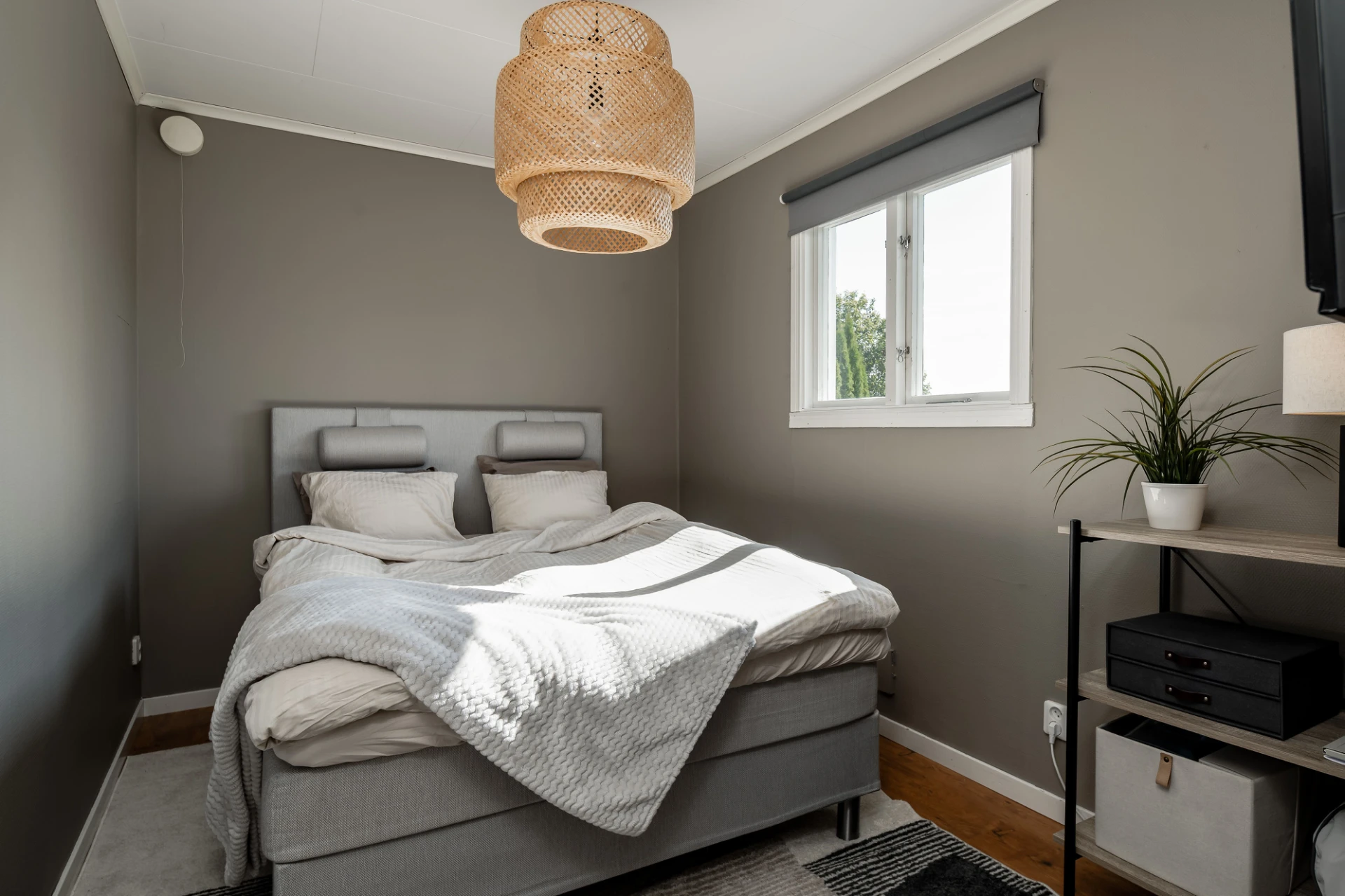 Laminatgolv och grå/blå väggar. Här finns plats för dubbelsäng med tillhörande möblemang.
