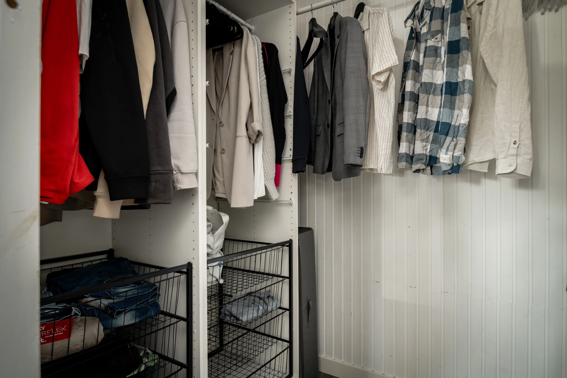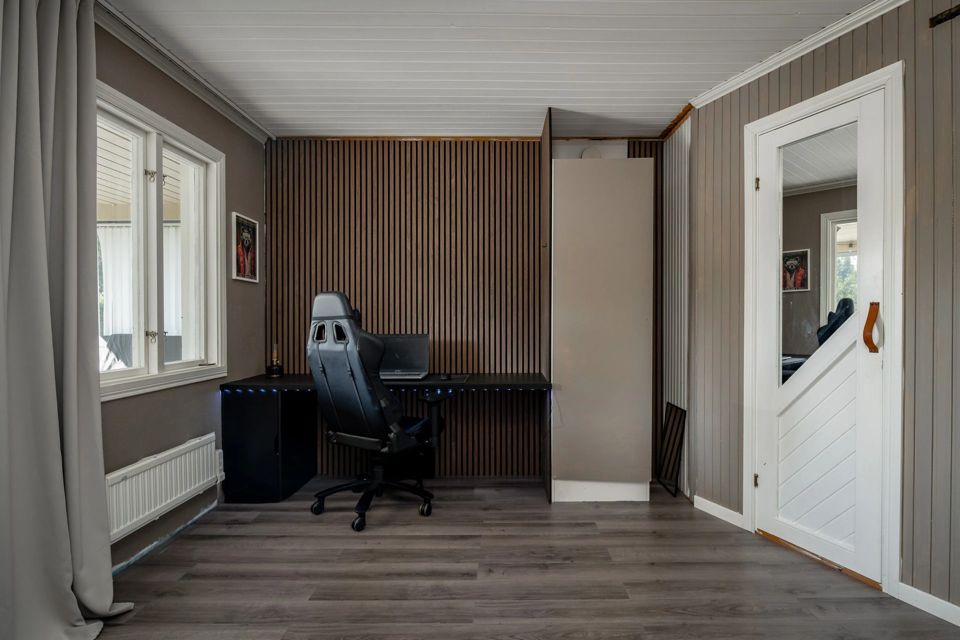 Laminatgolv och beige väggar samt akustikpanel. Här finns plats för dubbelsäng med tillhörande möblemang. Förvaring i garderob.