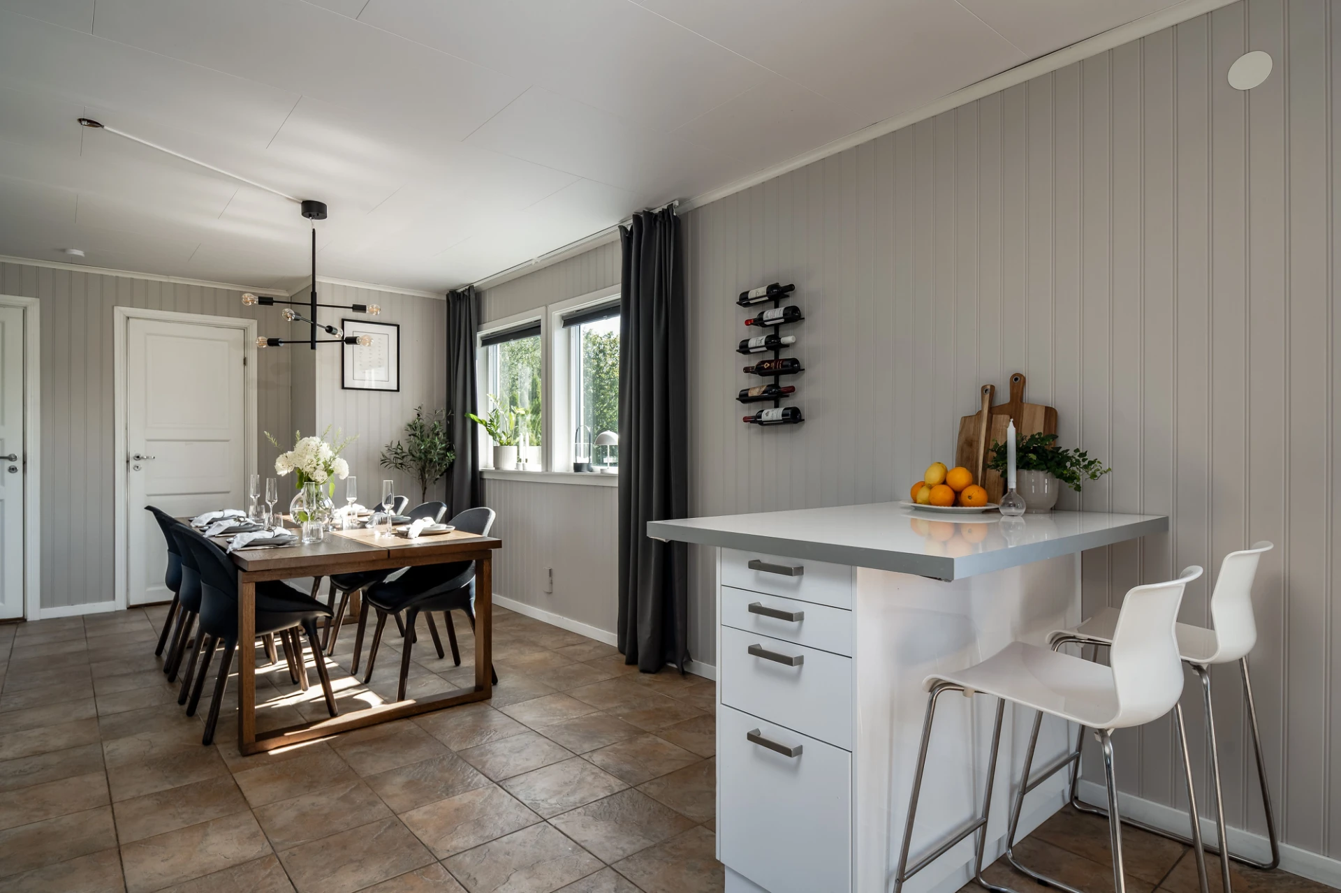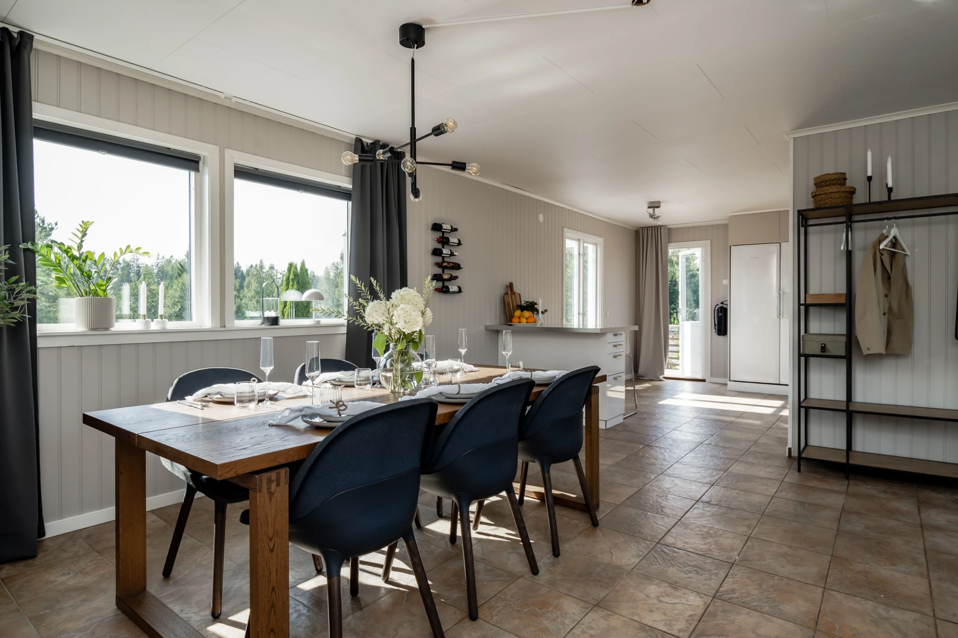 Klinkergolv och beige väggar. Här finns plats för matgrupp.