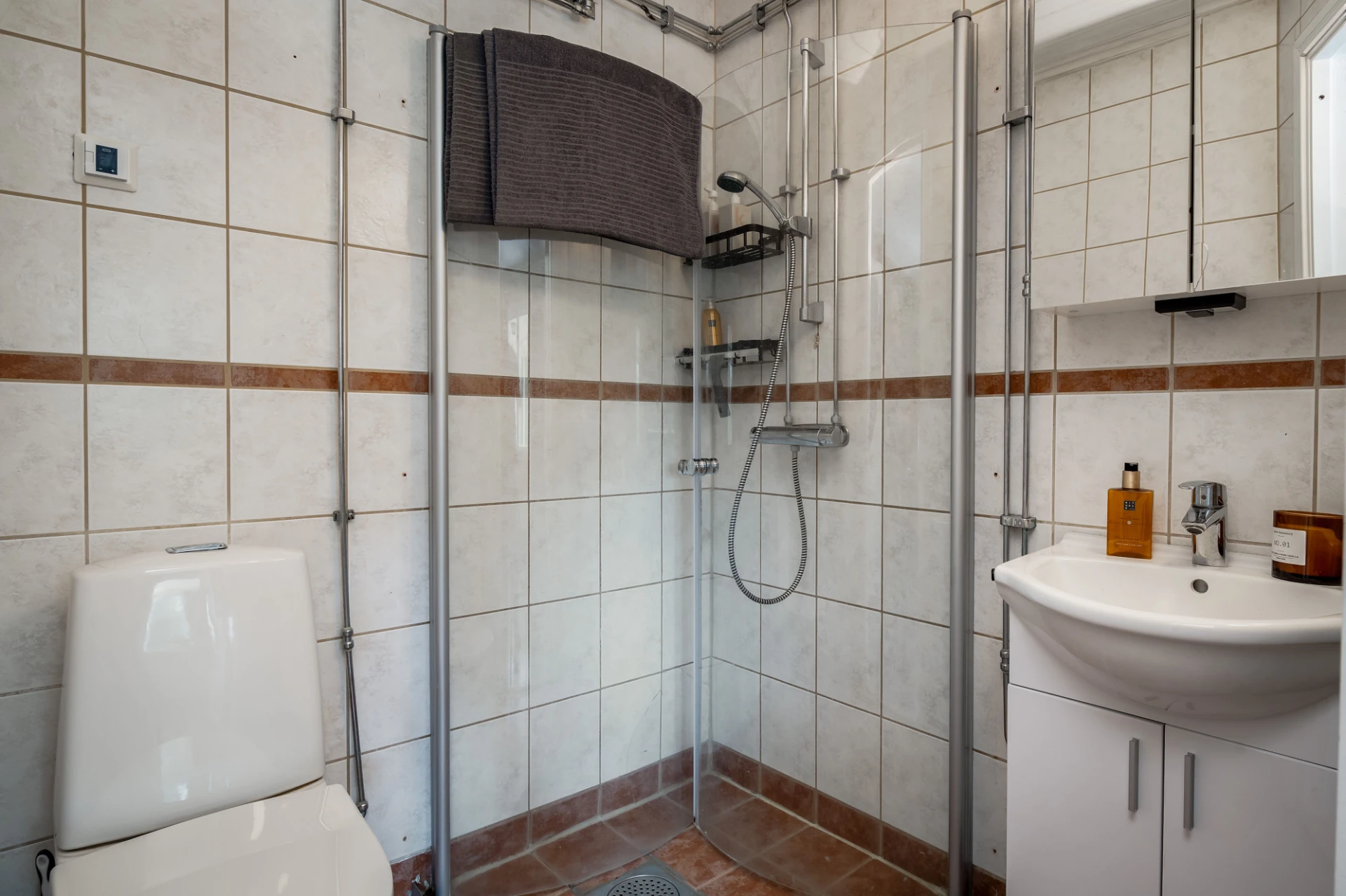 Klinkergolv och kakel på väggar. Handfat, WC och dusch.