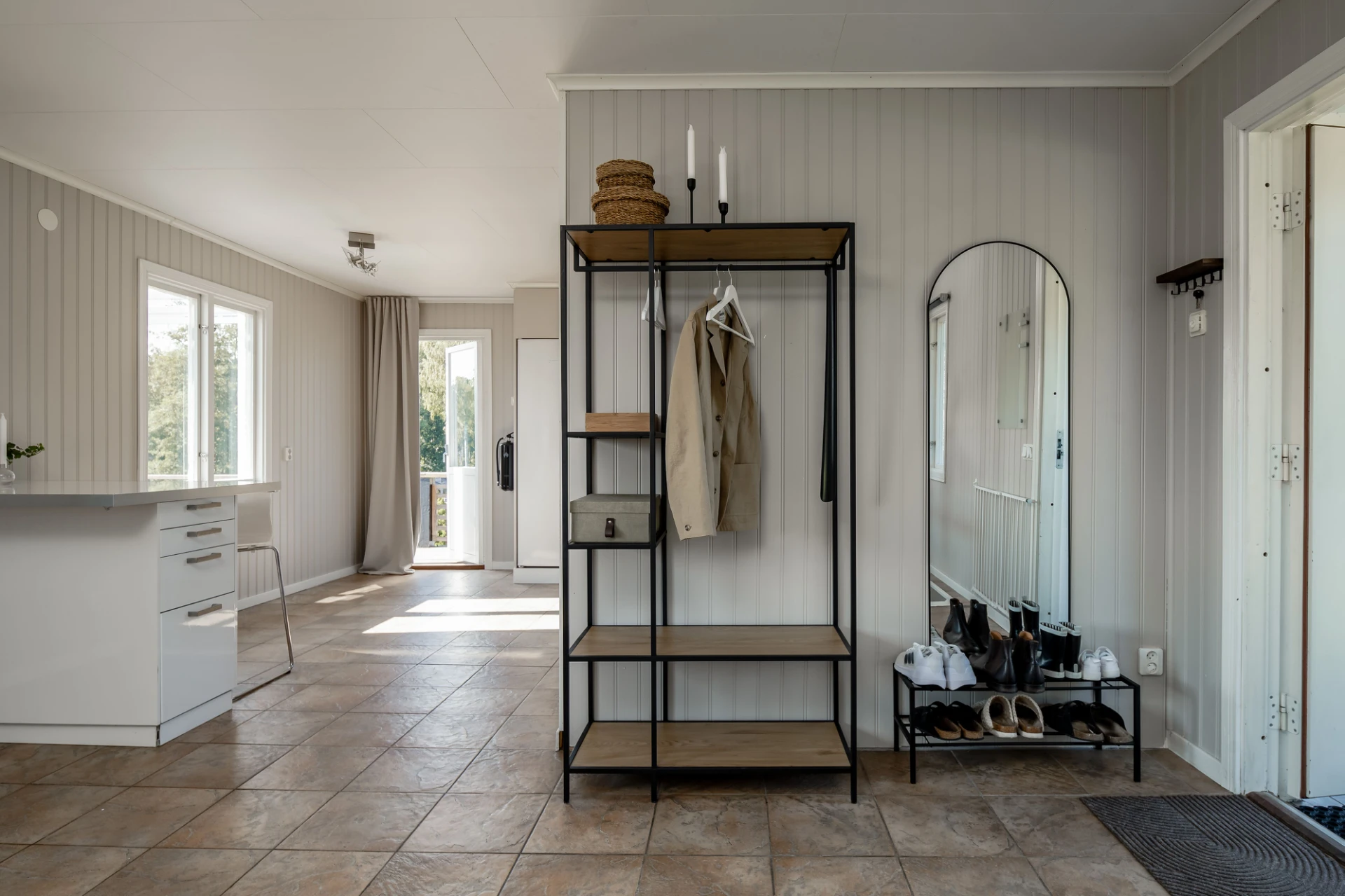 Klinkergolv och beige väggar. Här finns möjlighet till avhängning.