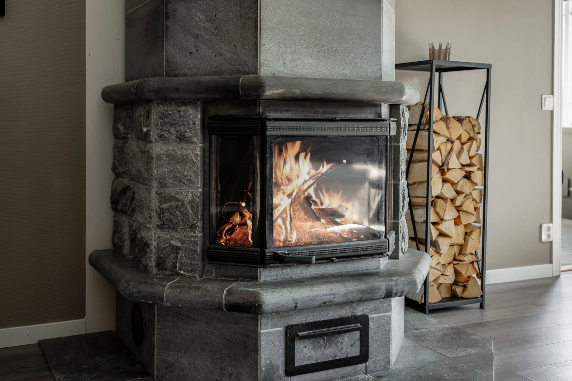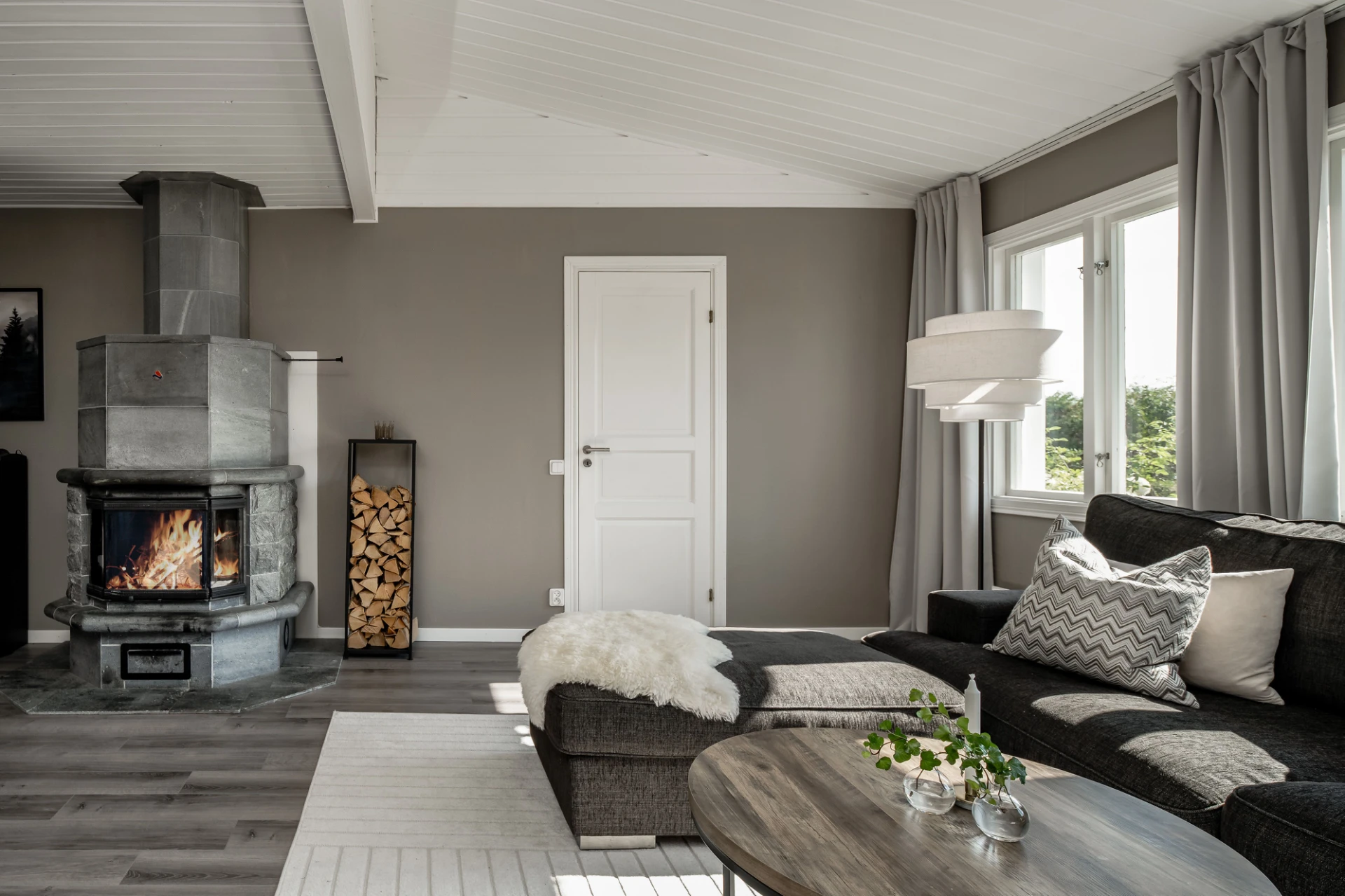Laminatgolv och beige väggar. Här finns plats för soffa med tillhörande möblemang. Braskamin.