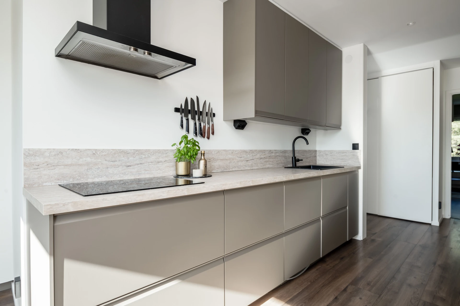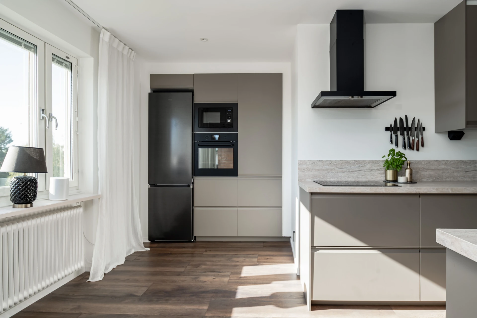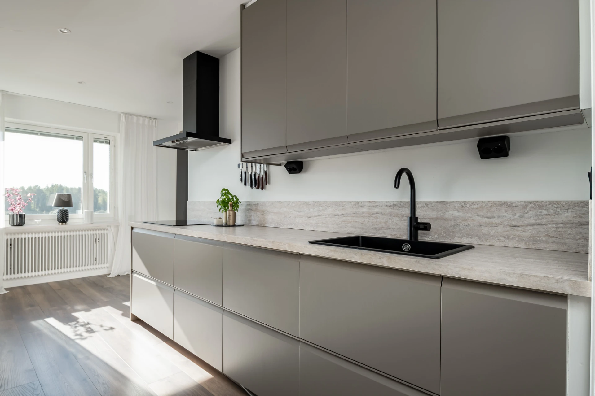 Laminatgolv och vita väggar. Grå/beige köksluckor och stenliknande laminatbänskiva. Den maskinella utrustningen består av köksfläkt, induktionshäll, inbyggnadsugn, inbyggnadsmikro, integrerad diskmaskin samt kyl och frys. Här finns plats för mindre matgrupp. Utgång till balkong.