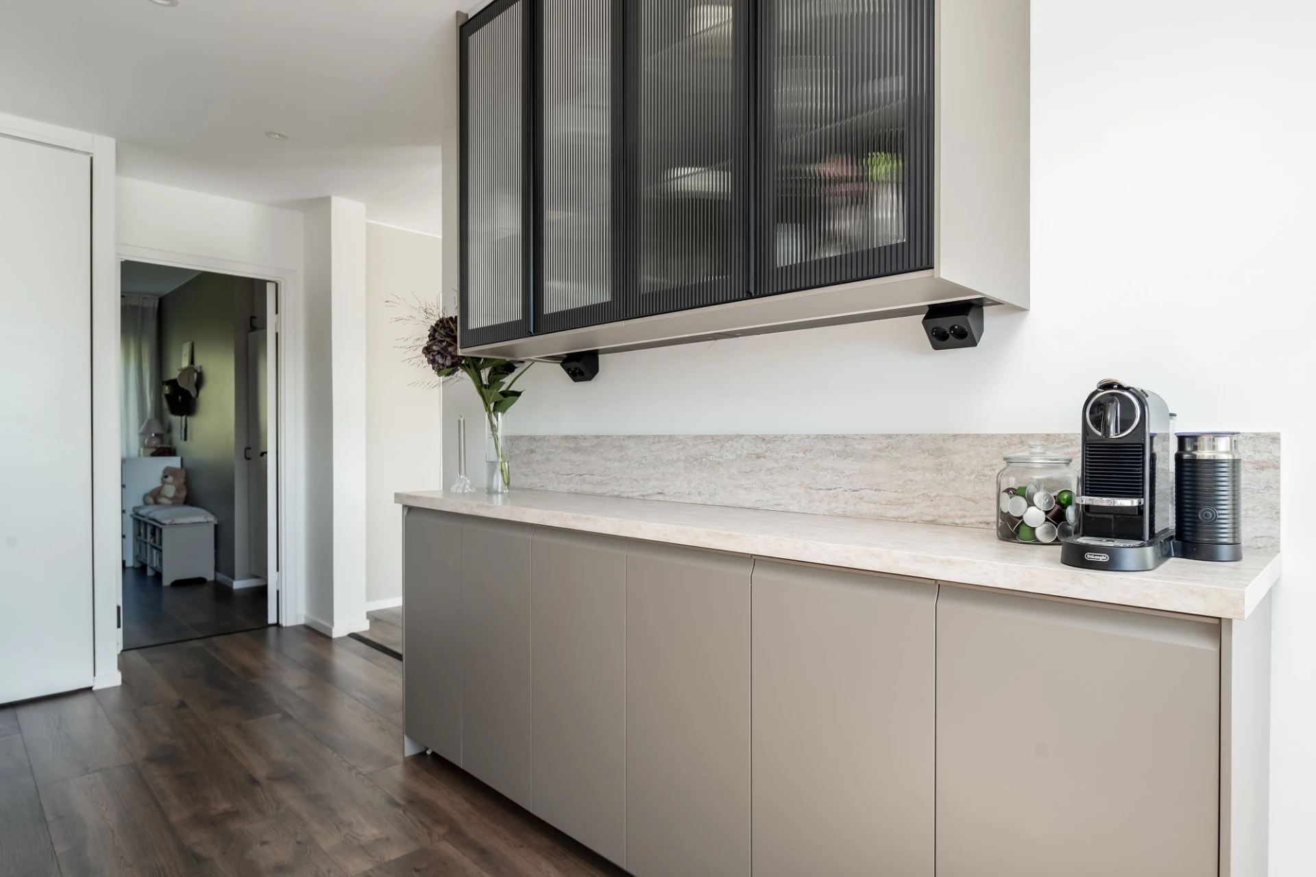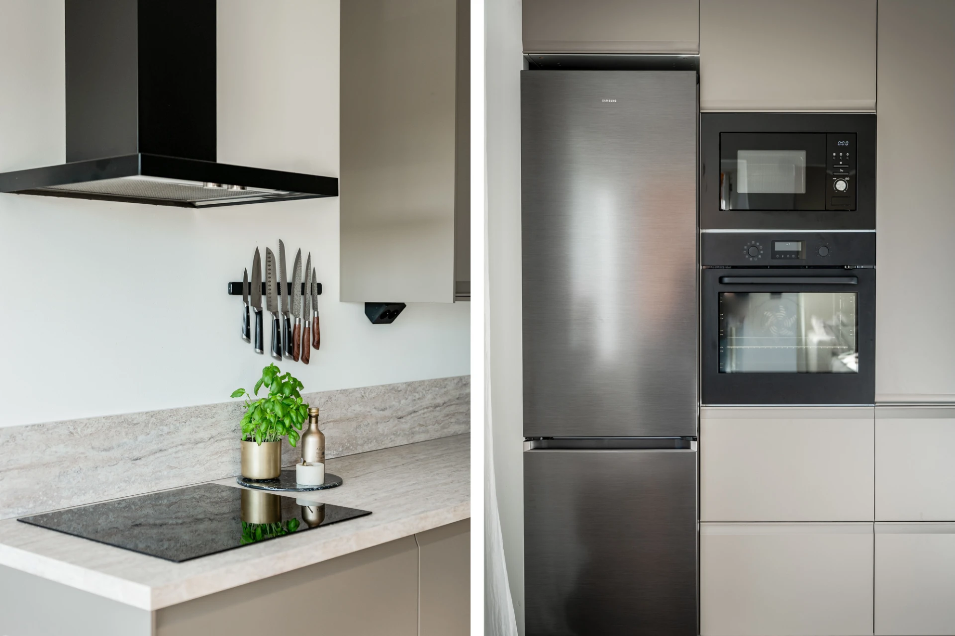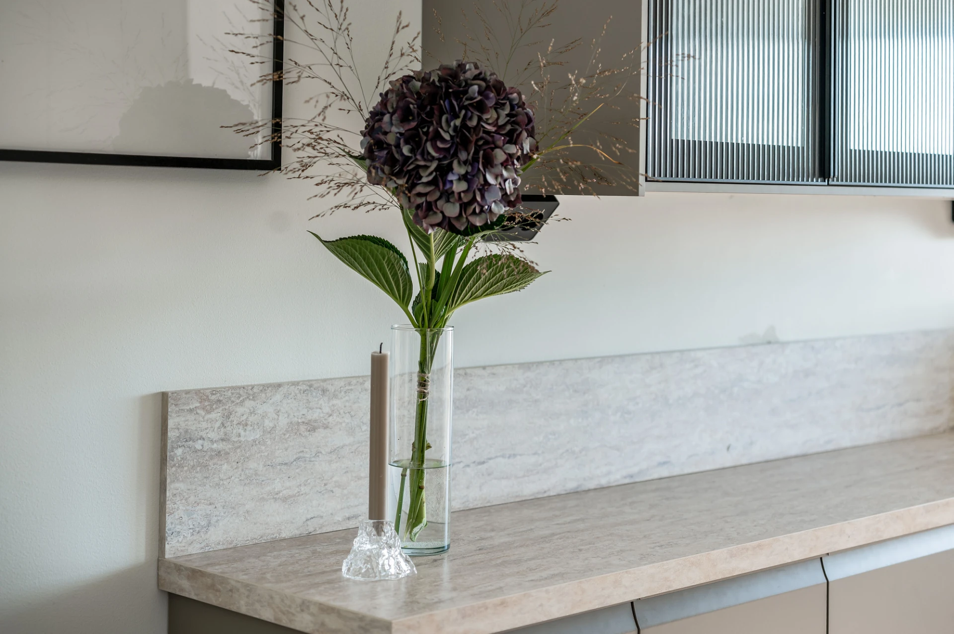 Laminatgolv och vita väggar. Grå/beige köksluckor och stenliknande laminatbänskiva. Den maskinella utrustningen består av köksfläkt, induktionshäll, inbyggnadsugn, inbyggnadsmikro, integrerad diskmaskin samt kyl och frys. Här finns plats för mindre matgrupp. Utgång till balkong.