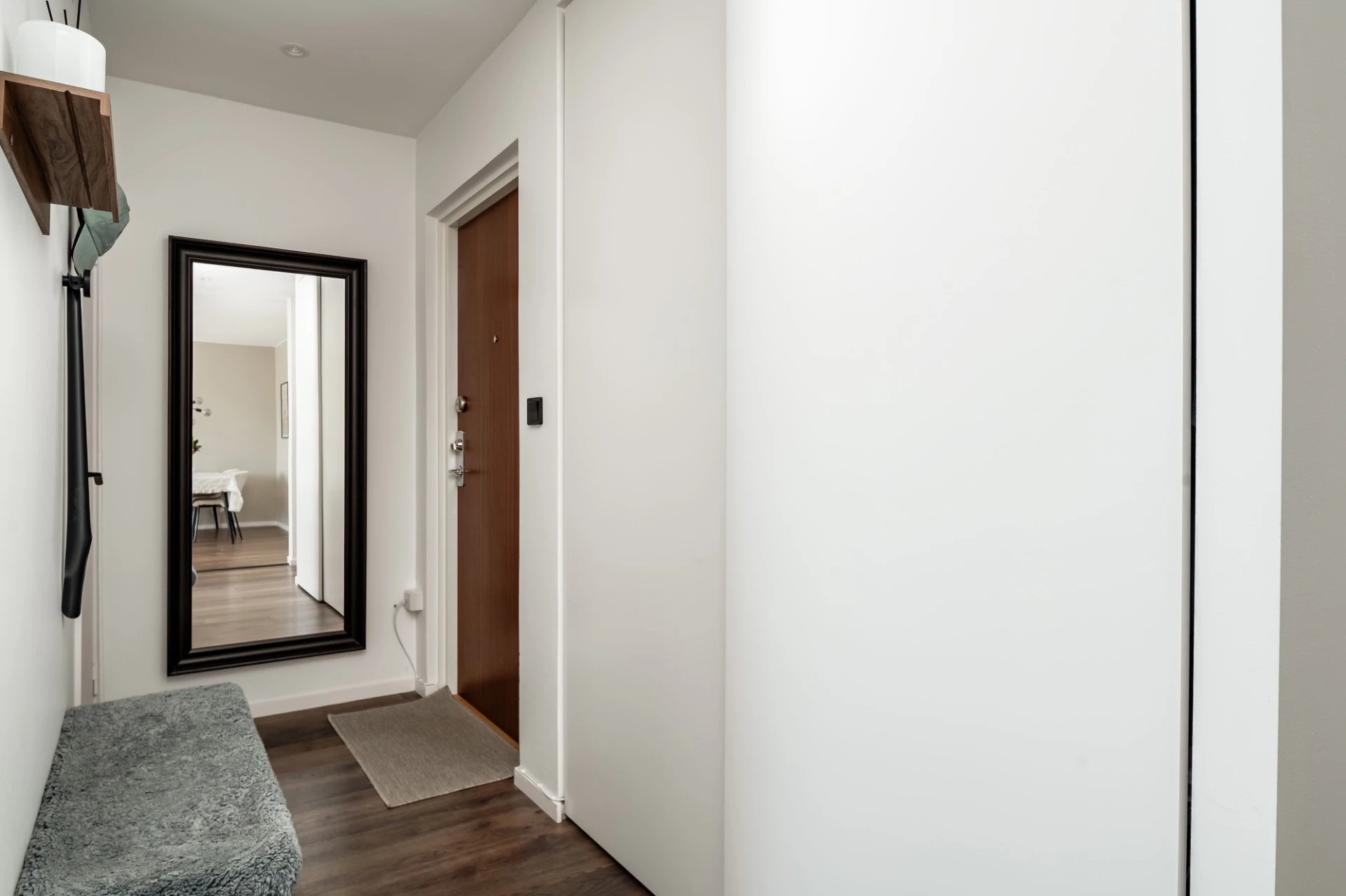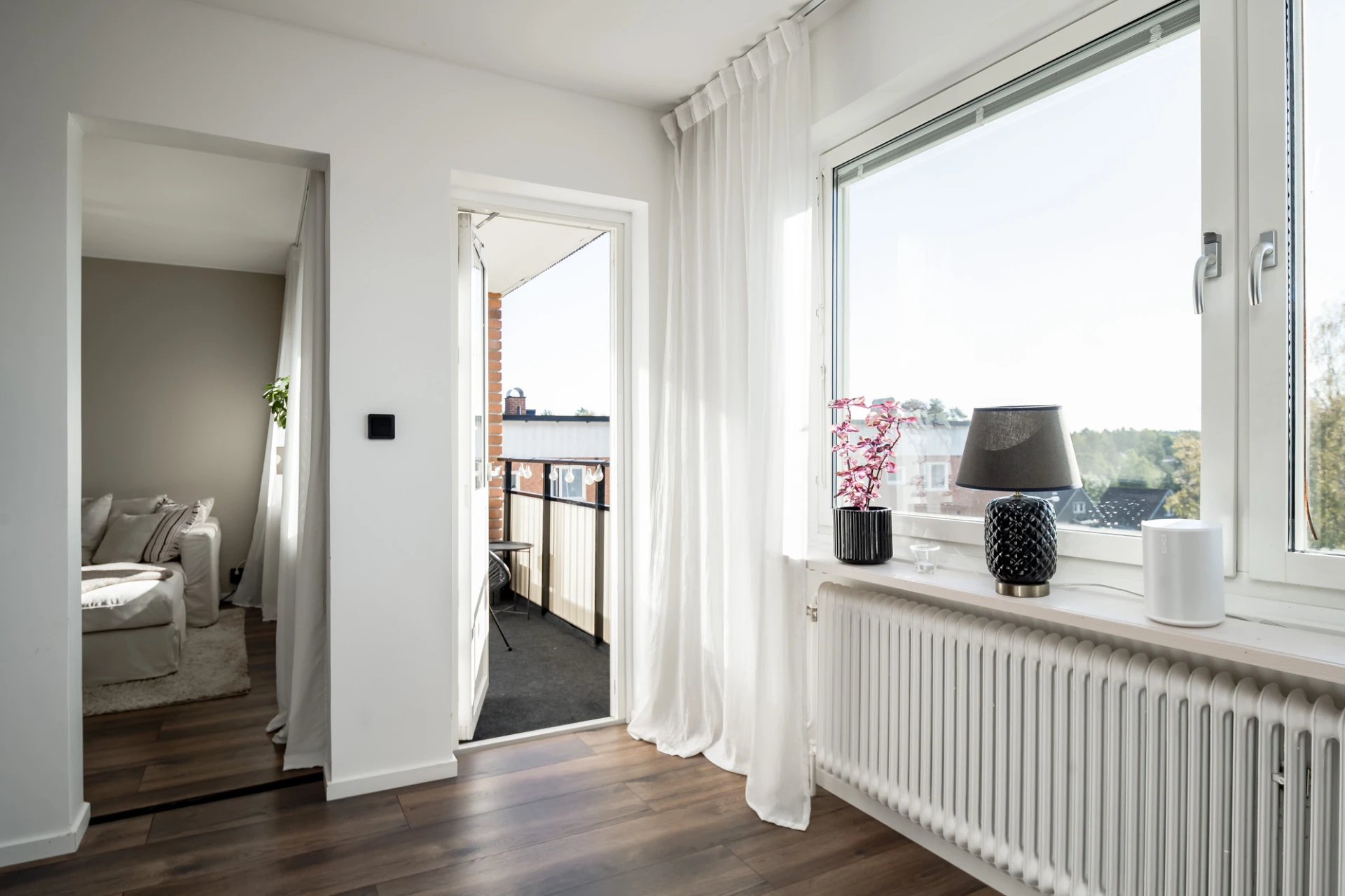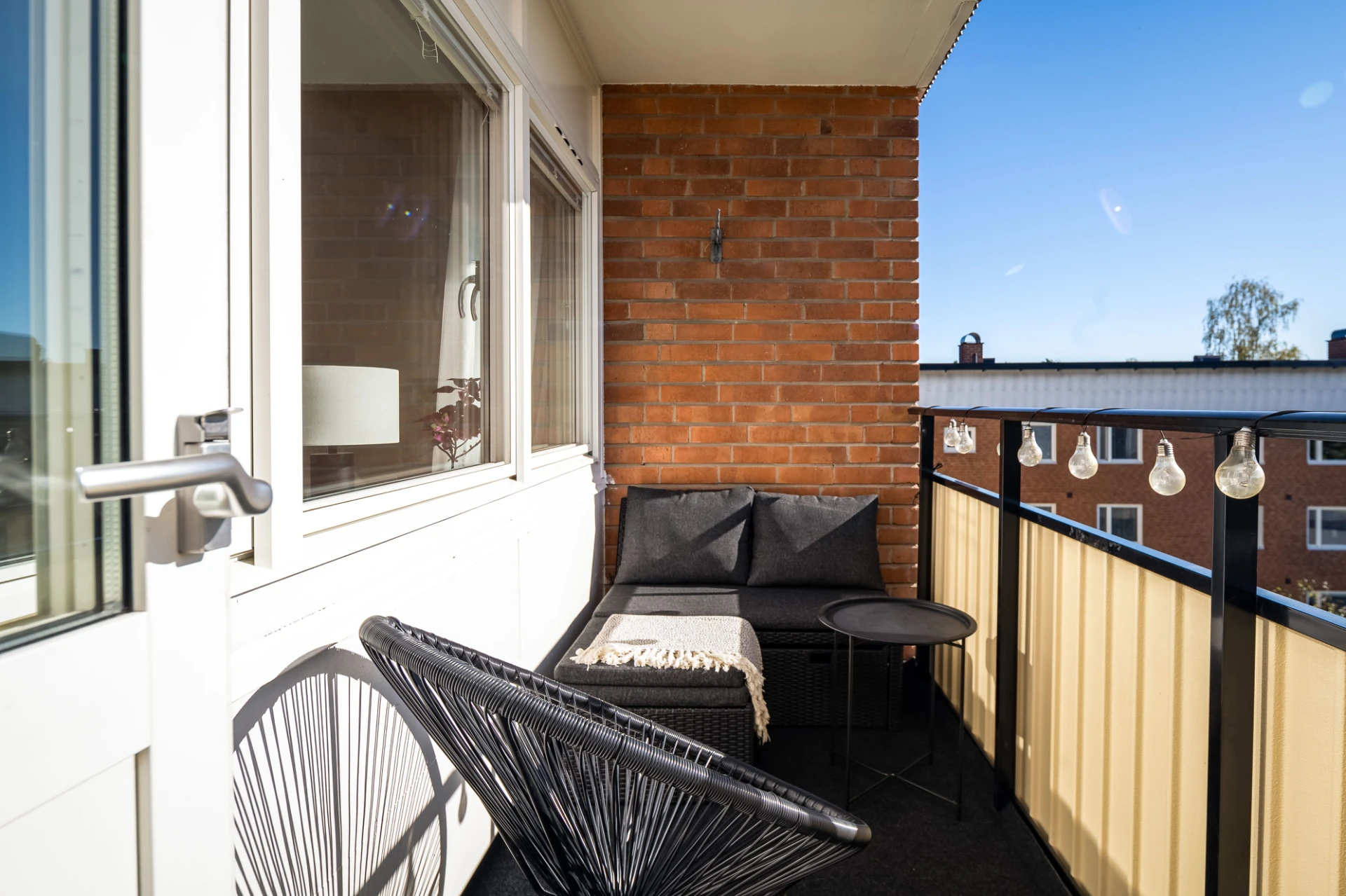 När du kliver in i lägenheten välkomnas du av en hall med avhängning. Vidare kommer du till köket som är smakfullt med moderna vitvaror och snygga detaljer. Härifrån nås den inglasade balkongen, en härlig förlängning av bostaden där du kan njuta av solen större del av dagen. Vardagsrummet har gott om utrymme för både soffgrupp och matsalsdel. Lägenheten rymmer två fina sovrum, båda med praktiska garderobslösningar. Duschrummet är helkaklat med praktisk toppmatad tvättmaskin som underlättar vardagen.