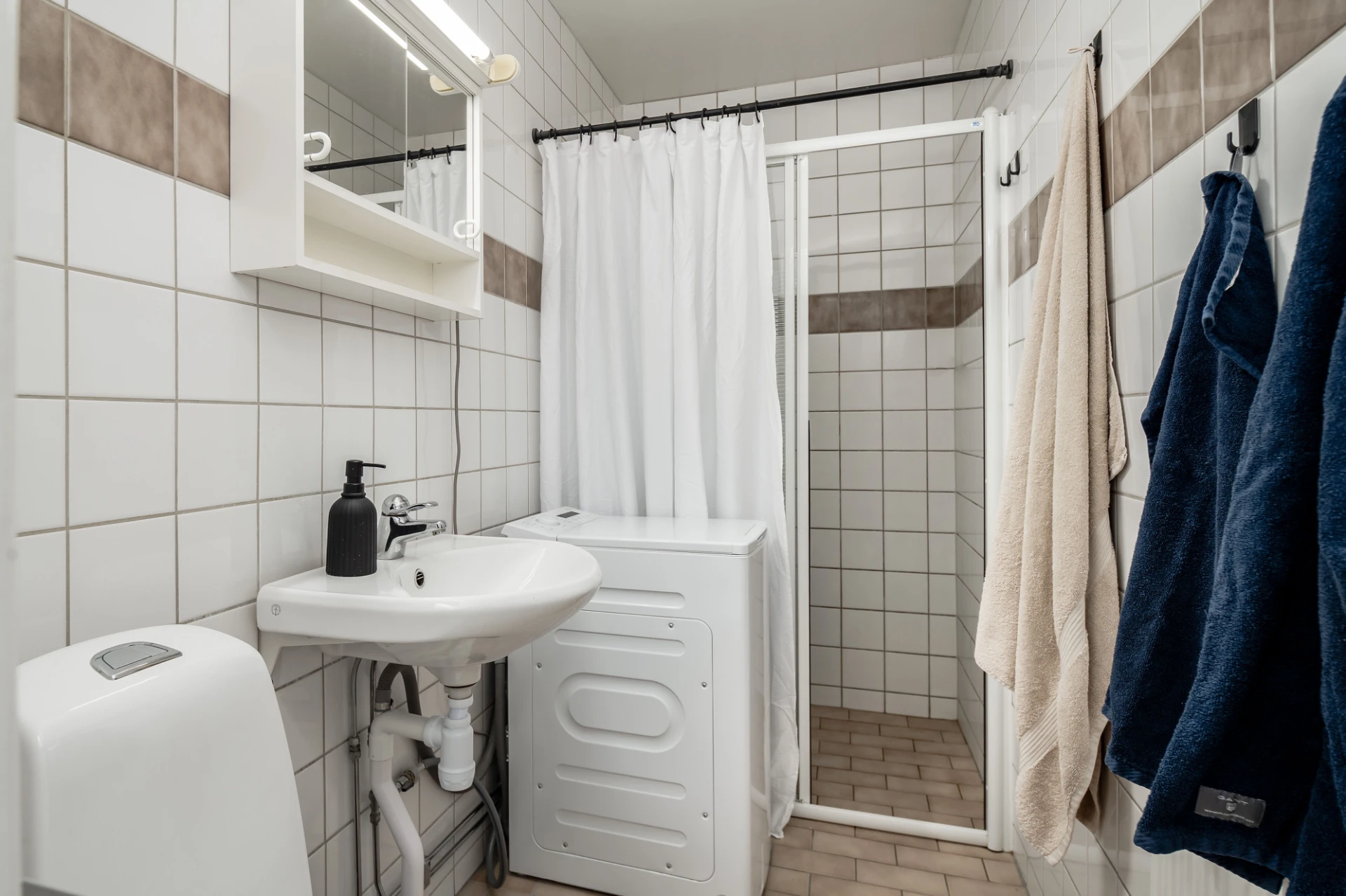 Klinkergolv och kakel på väggar. Tvättställ, WC och dusch samt toppmatad tvättmaskin.