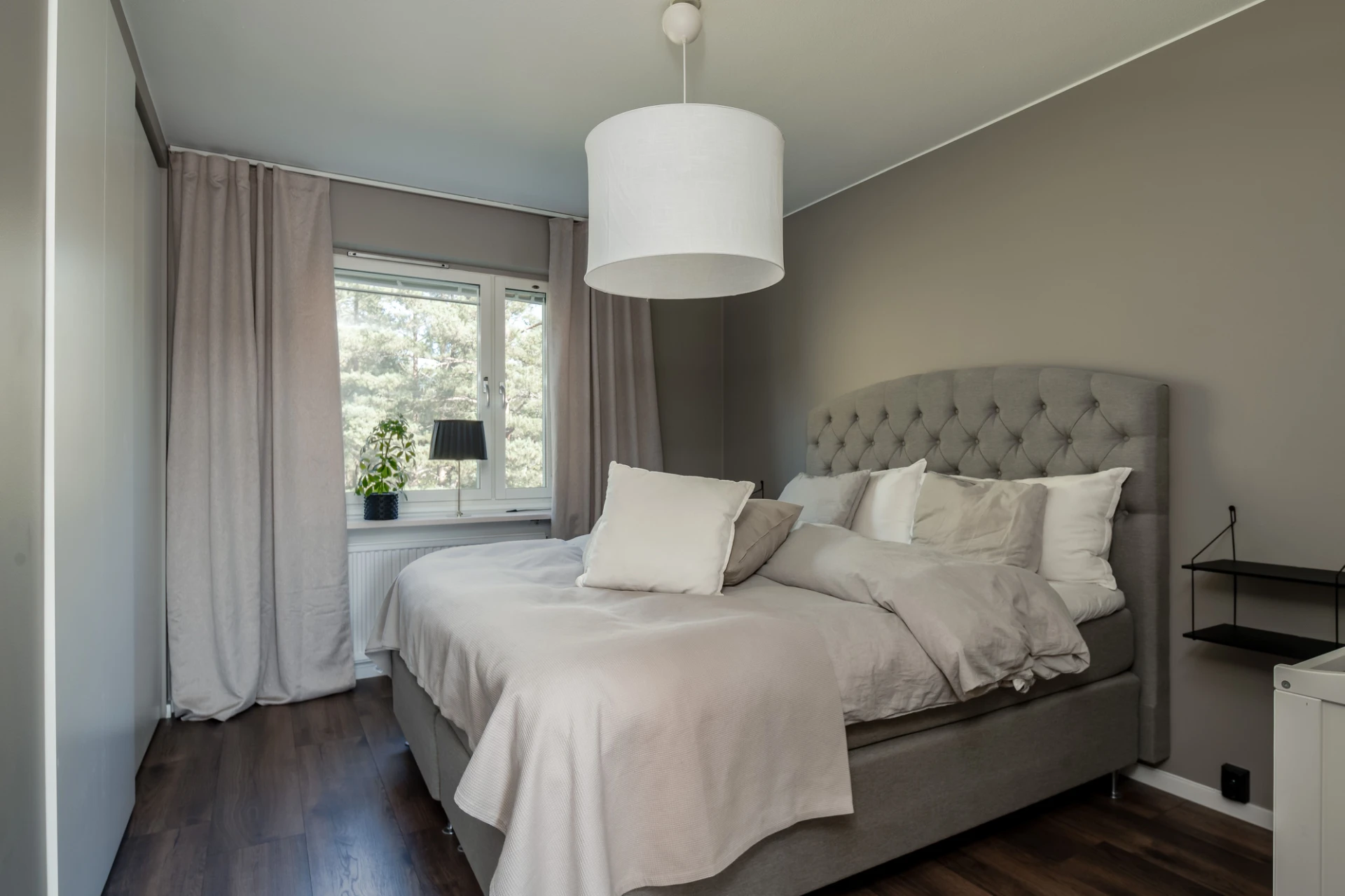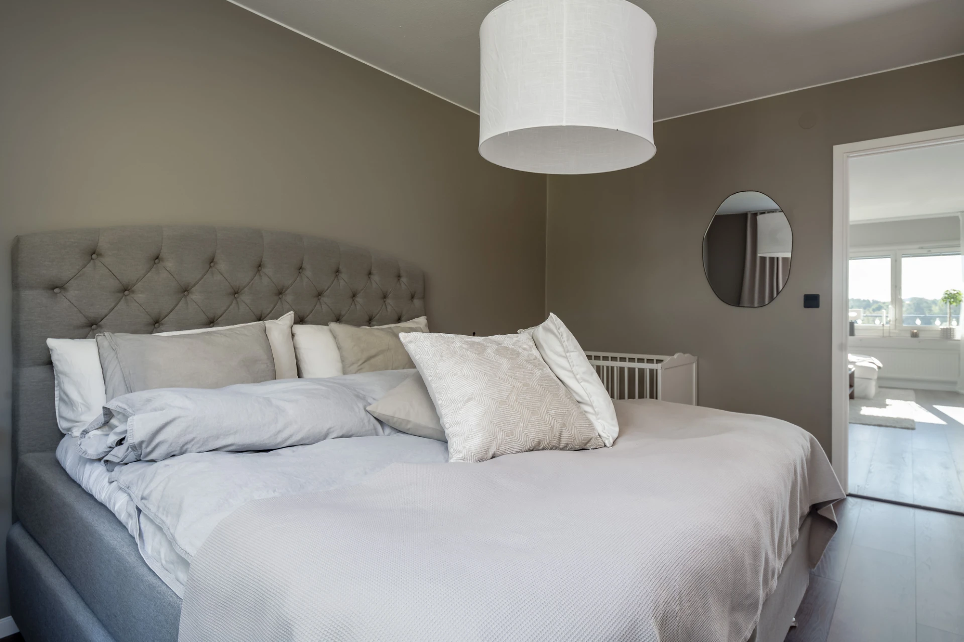 Laminatgolv och beige väggar. Här finns plats för dubbelsäng med tillhörande möblemang. Förvaring i garderober med skjutdörrar.