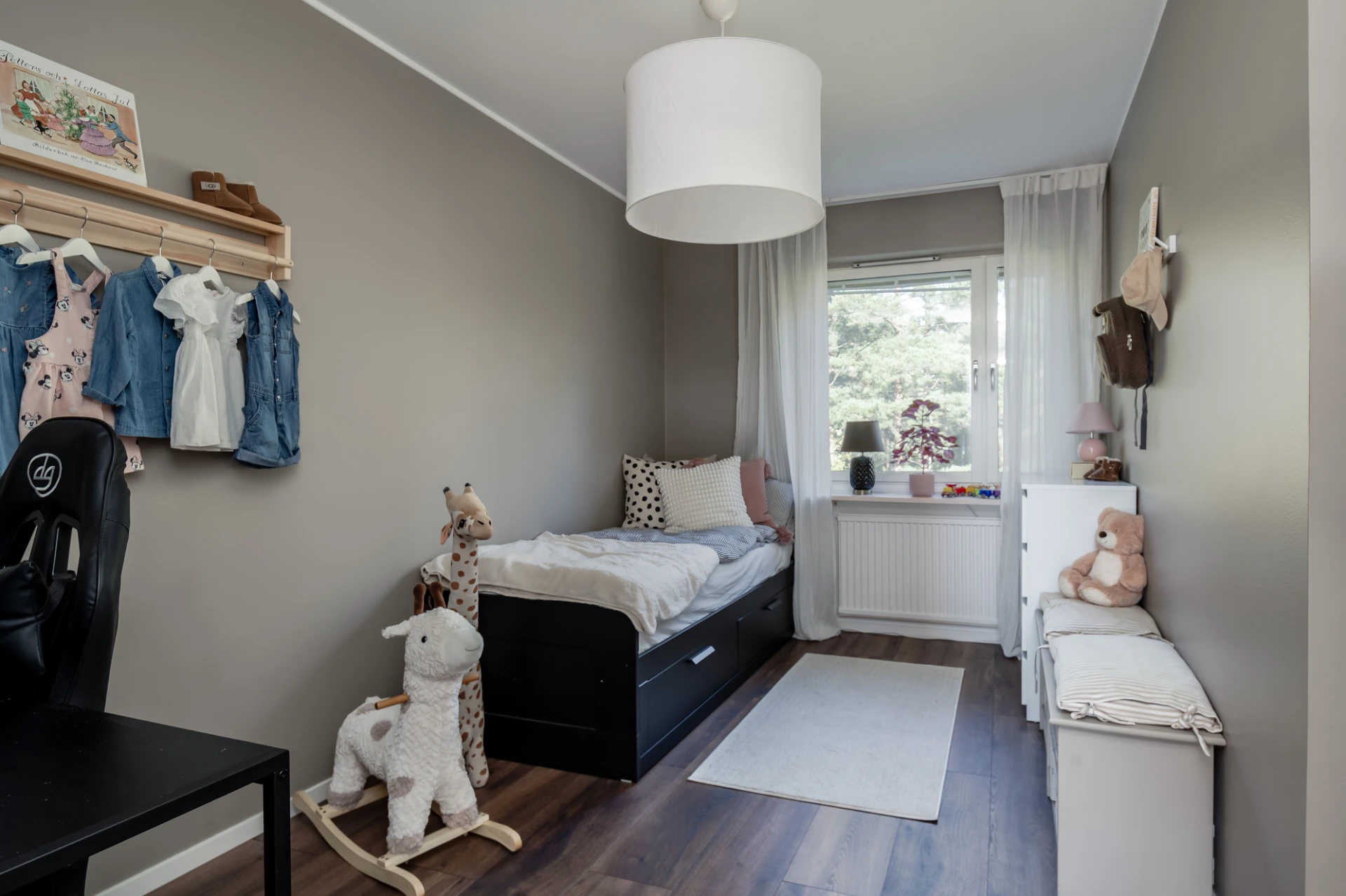 Laminatgolv och beige väggar. Här finns plats för dubbelsäng med tillhörande möblemang. Förvaring i garderob.