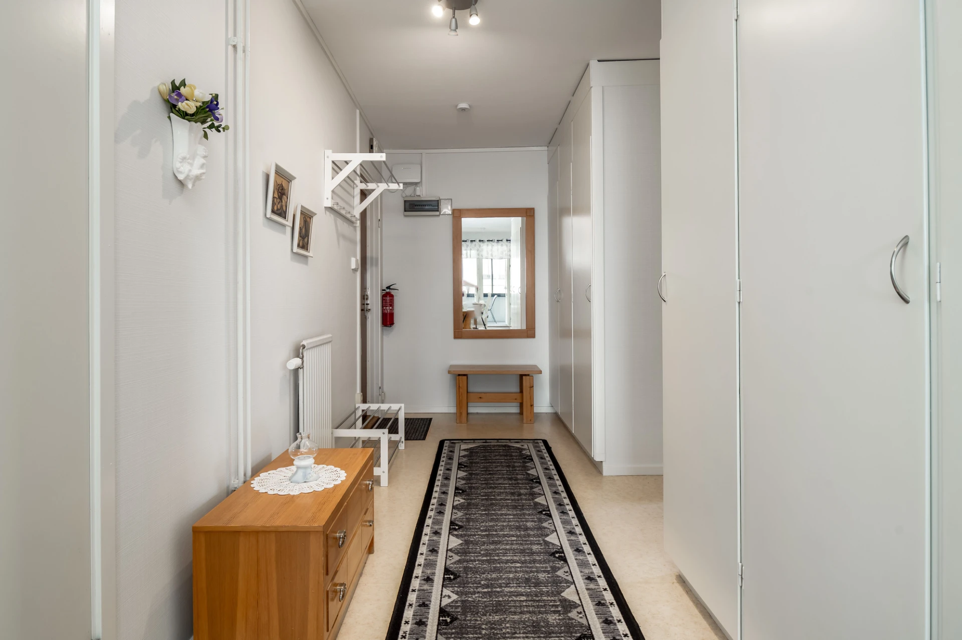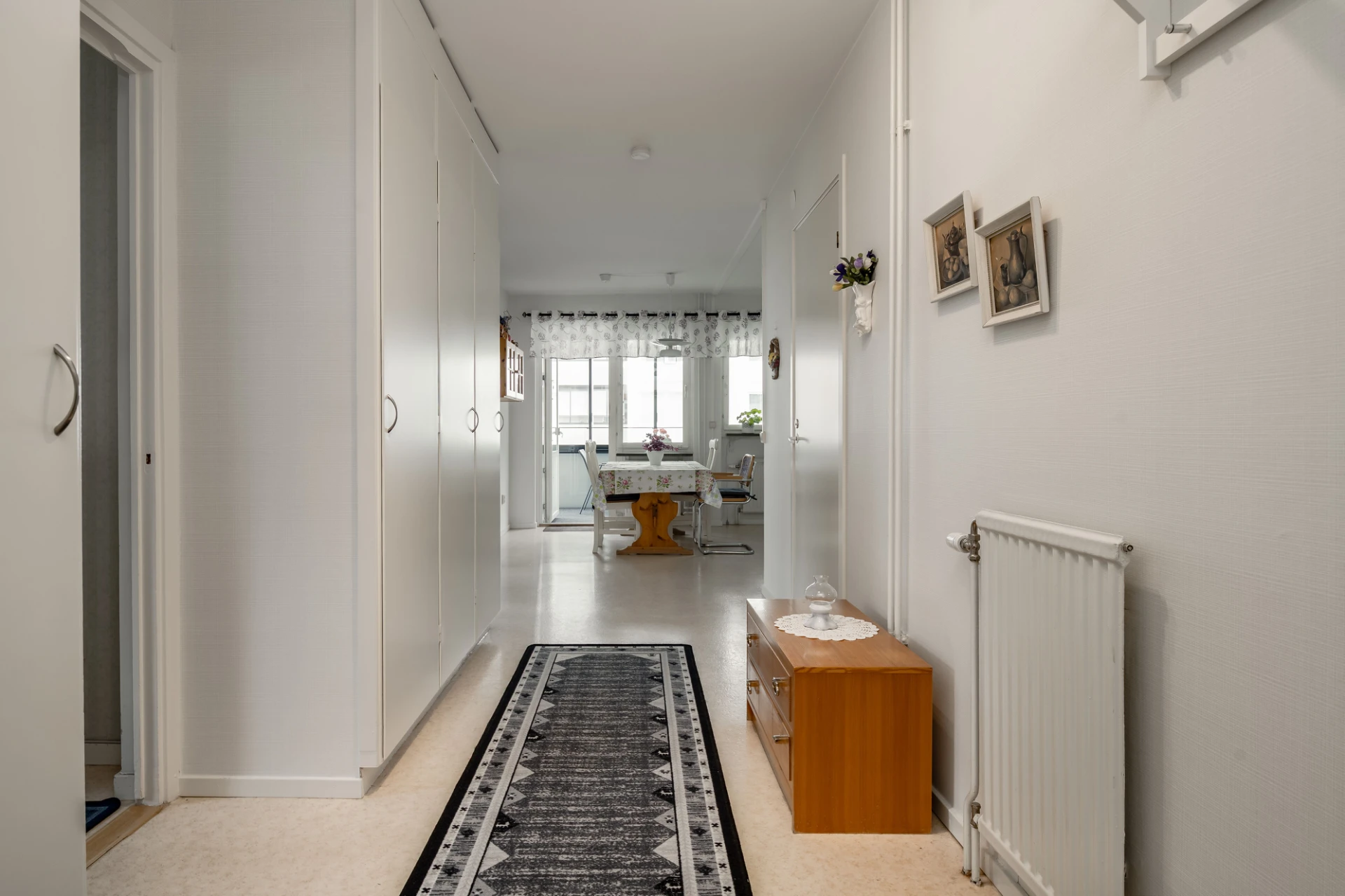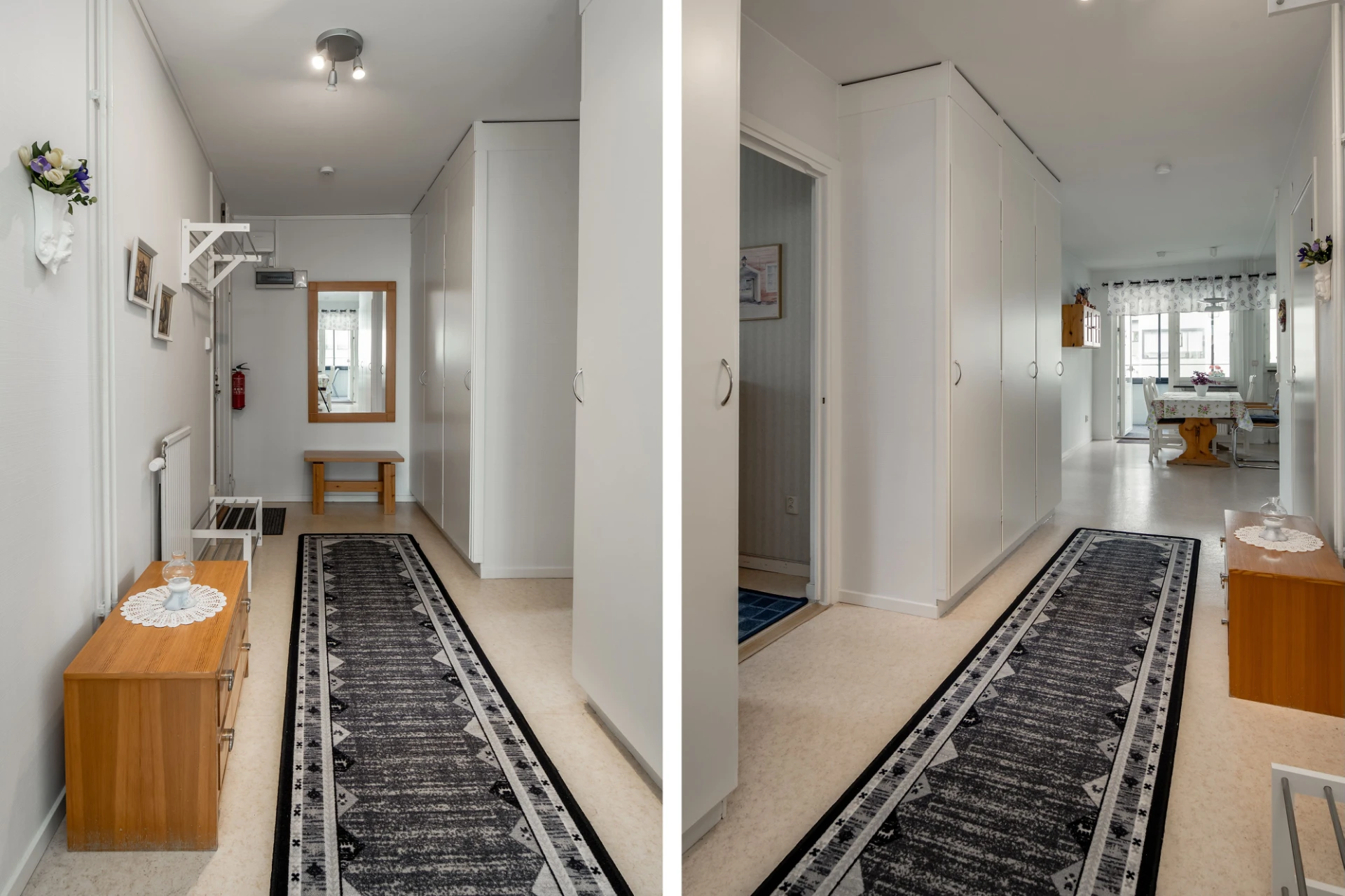 Du välkomnas av en rymlig hall med goda avhängningsmöjligheter. Vardagsrummet har vackert parkettgolv och generöst ljusinsläpp – en perfekt plats för både avkoppling och umgänge. Köket är funktionellt med plats för matgrupp, och härifrån nås även den mysiga balkongen. Lägenheten rymmer dessutom ett sovrum med förvaring samt ett duschrum med kaklade väggar, utrustat med dusch, WC och tvättmaskin.