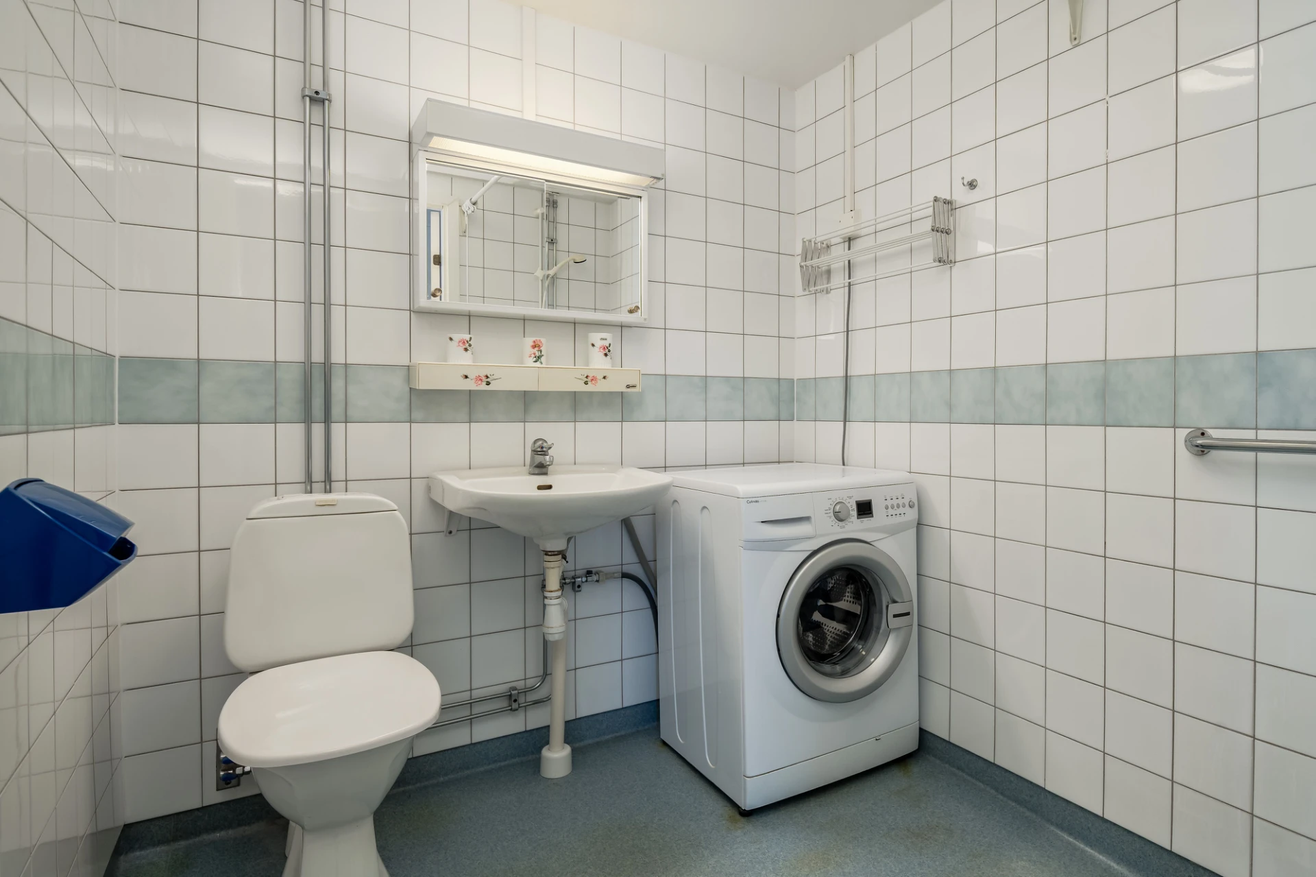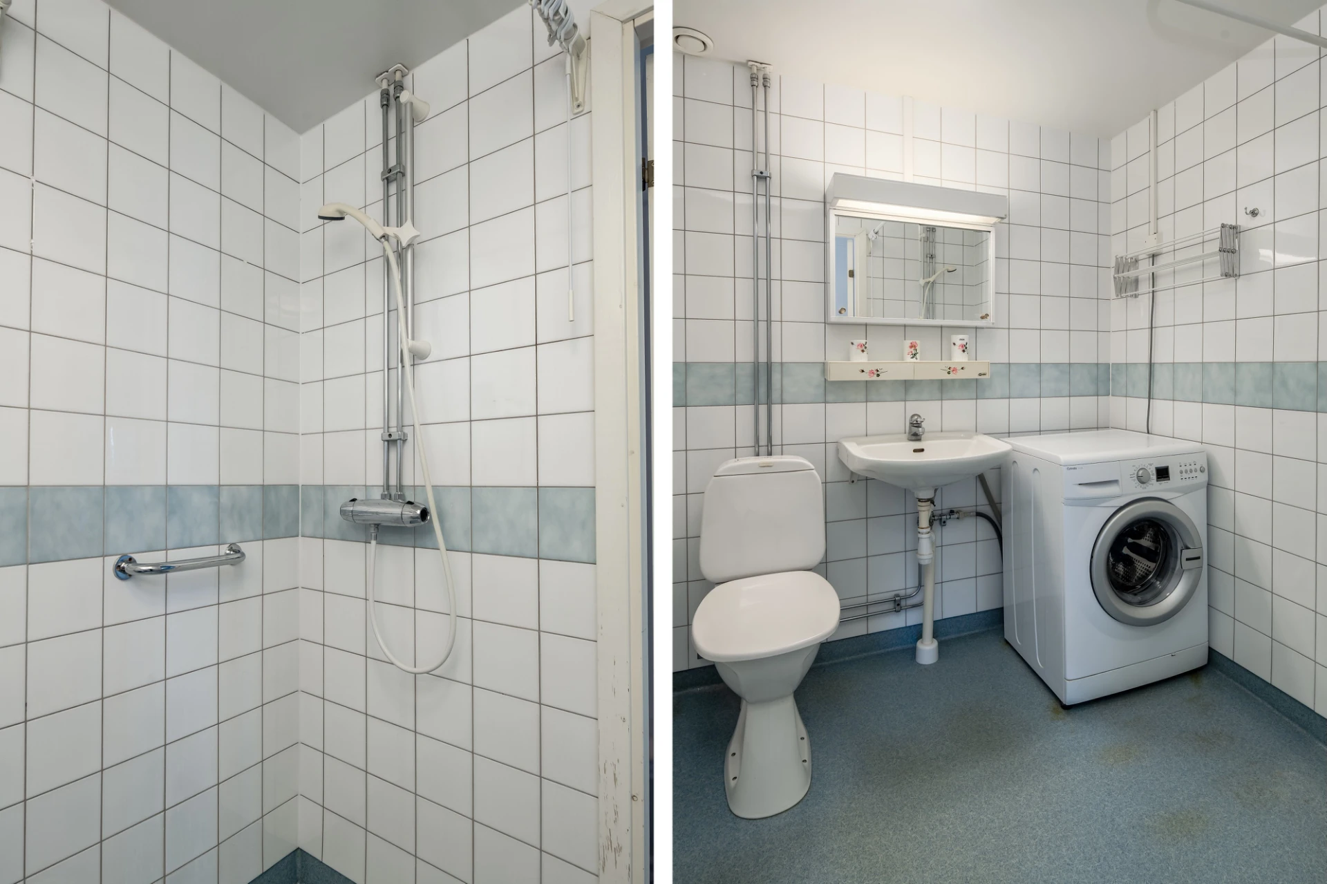 Våtrumsmatta och vitt kakel på väggar. Tvättställ, WC, dusch och tvättmaskin.