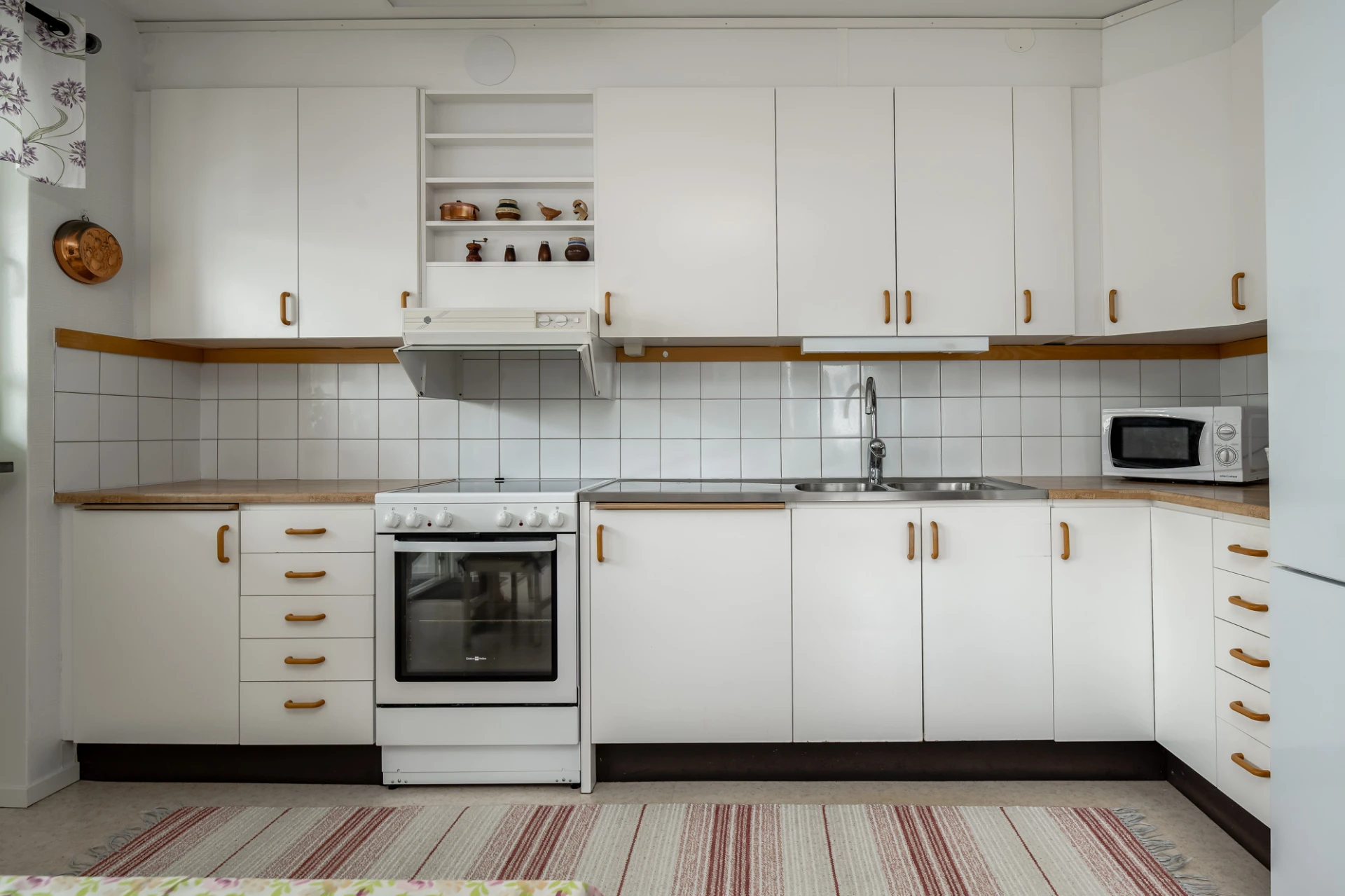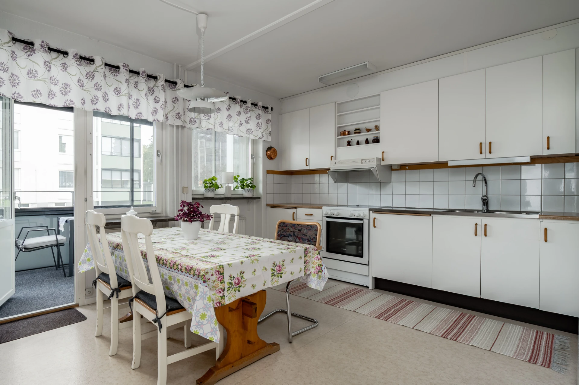 Plastmatta på golv och vita väggar. Vita köksluckor och vitt kakel. Den maskinella utrustningen består av köksfläkt, spis med ugn, diskmaskin samt kyl och frys. Här finns plats för matgrupp. Utgång till balkong.