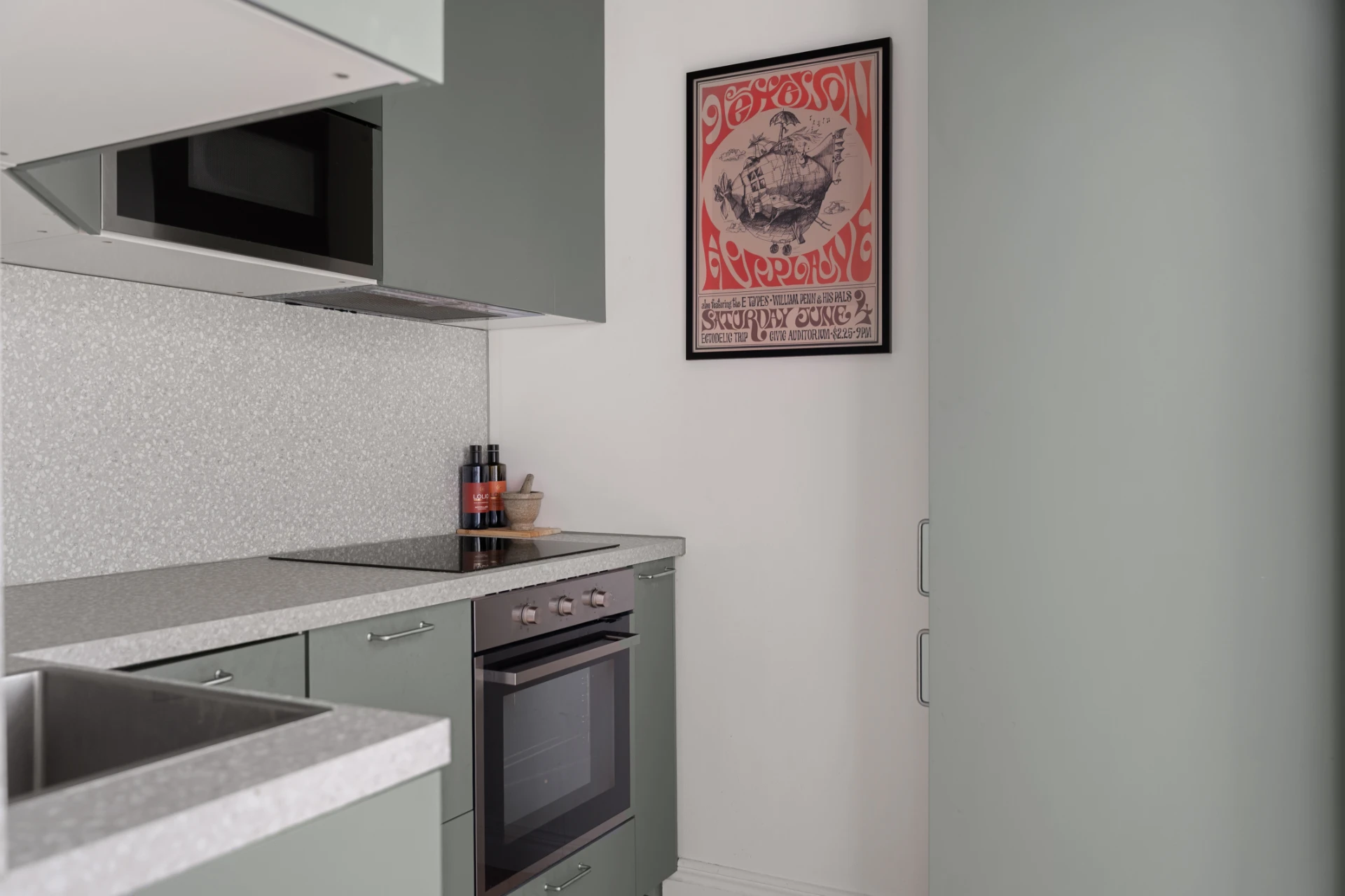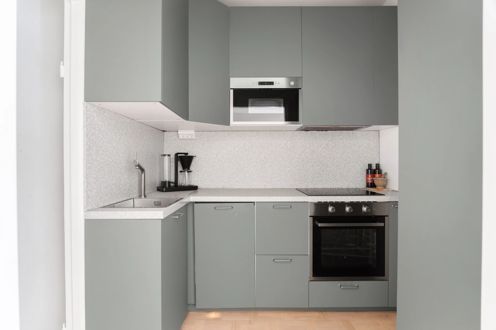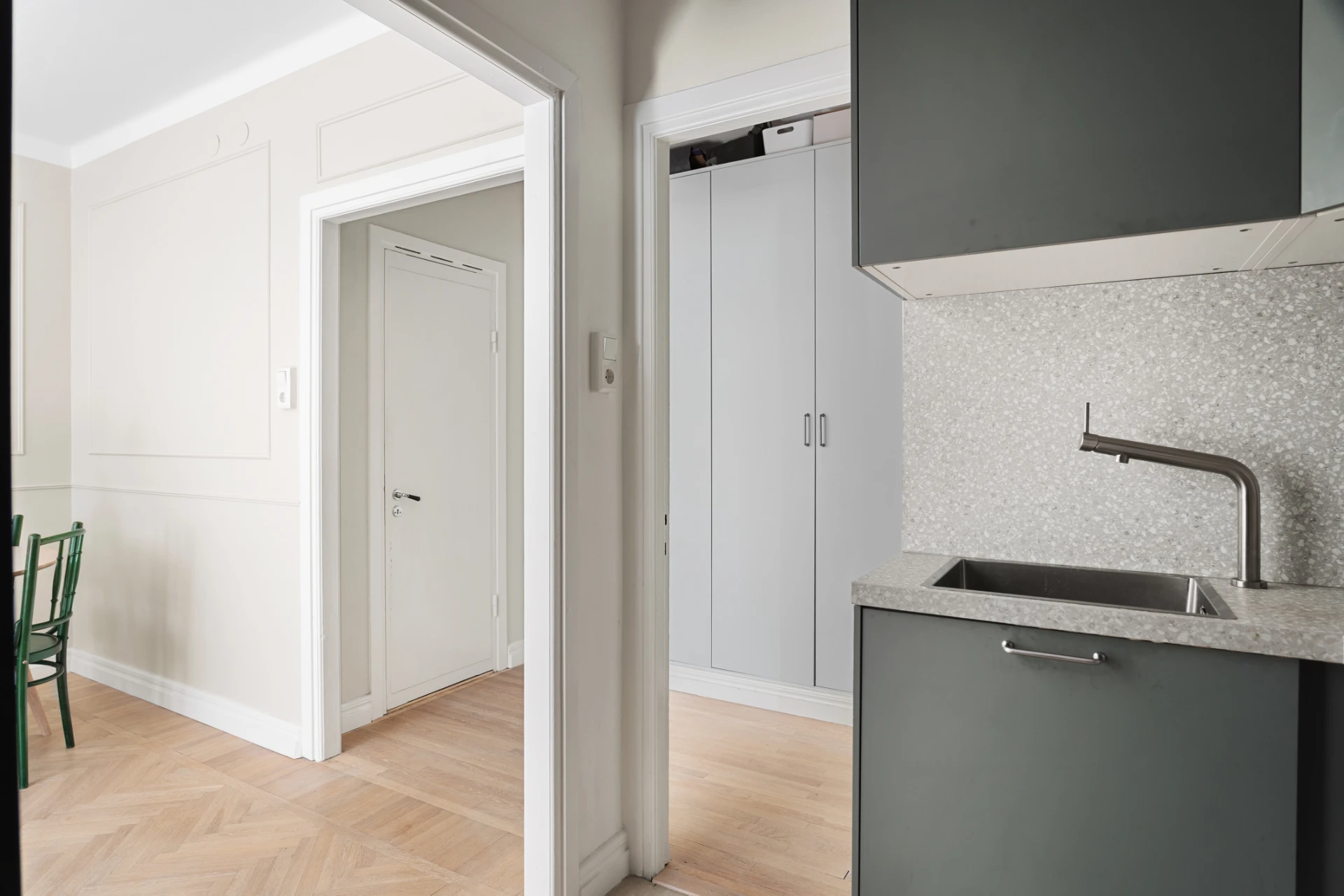 Stilrent kök med grågröna skåpsluckor, ljus bänkskiva och stänkskydd i mönstrad ljus ton. Parkettgolv och ljus väggfärg ger ett sobert intryck. Fullt utrustat med ugn, induktionshäll, diskmaskin, mikrovågsugn och gott om förvaring.