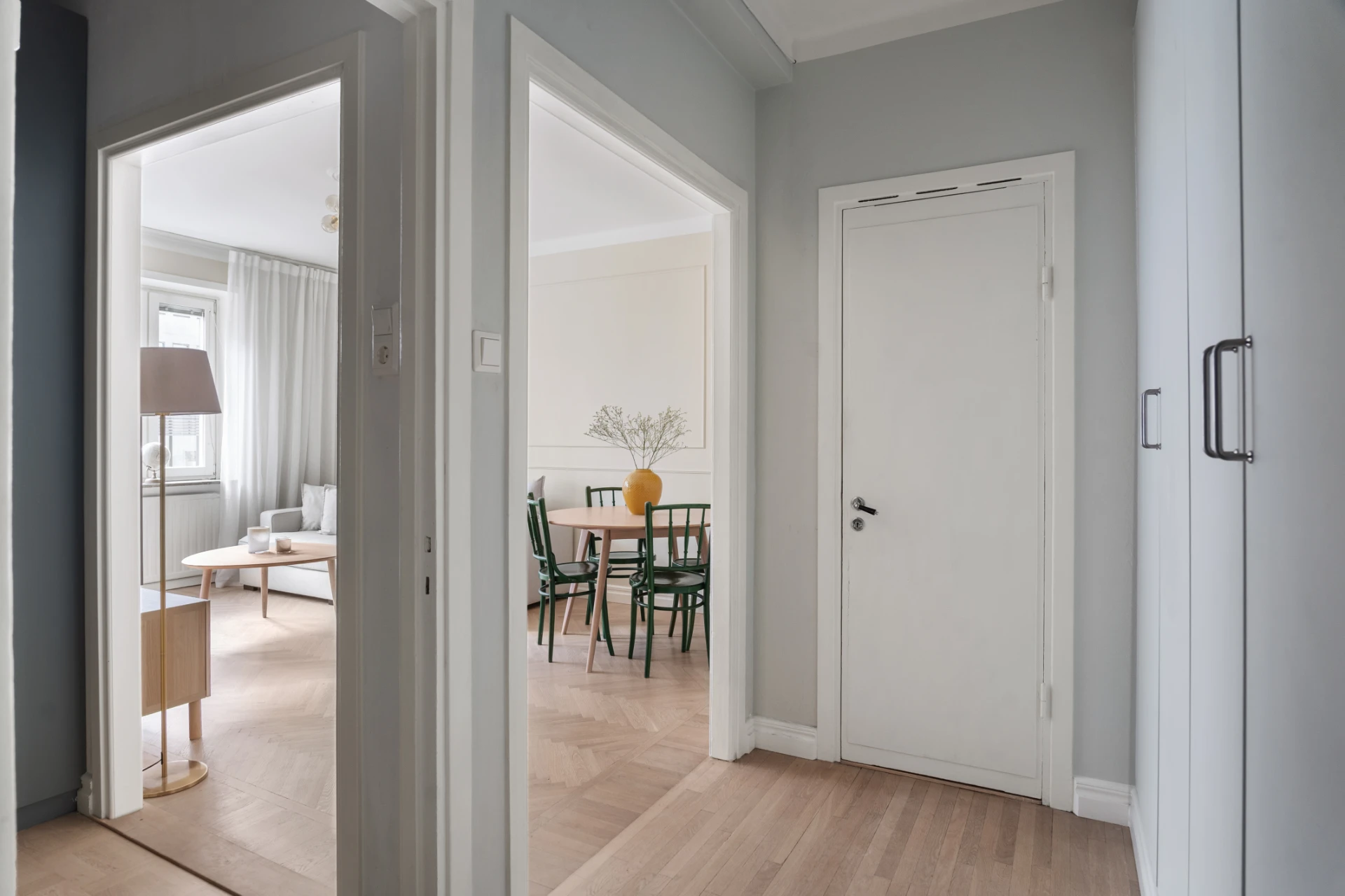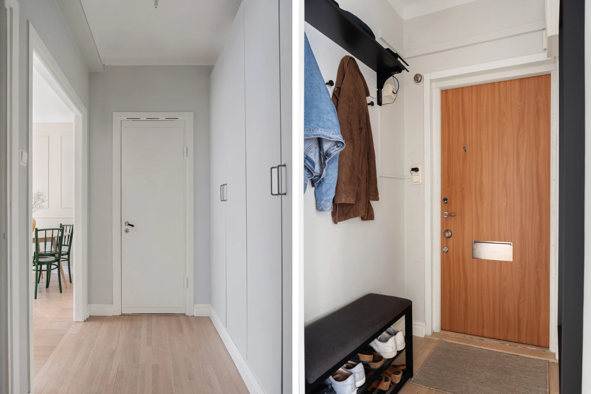 Praktisk hall med ljusgrå väggar och parkettgolv. Plats för avhängning, hatthylla samt gott om förvaring i platsbyggda garderober.
