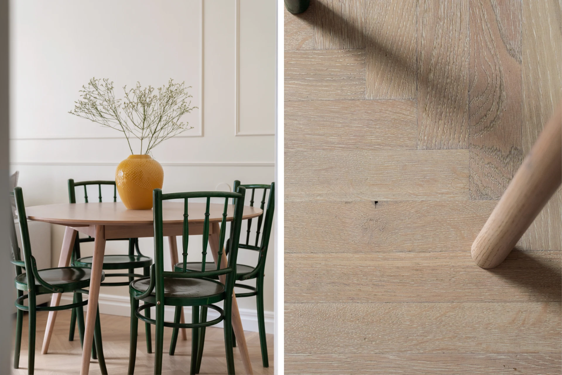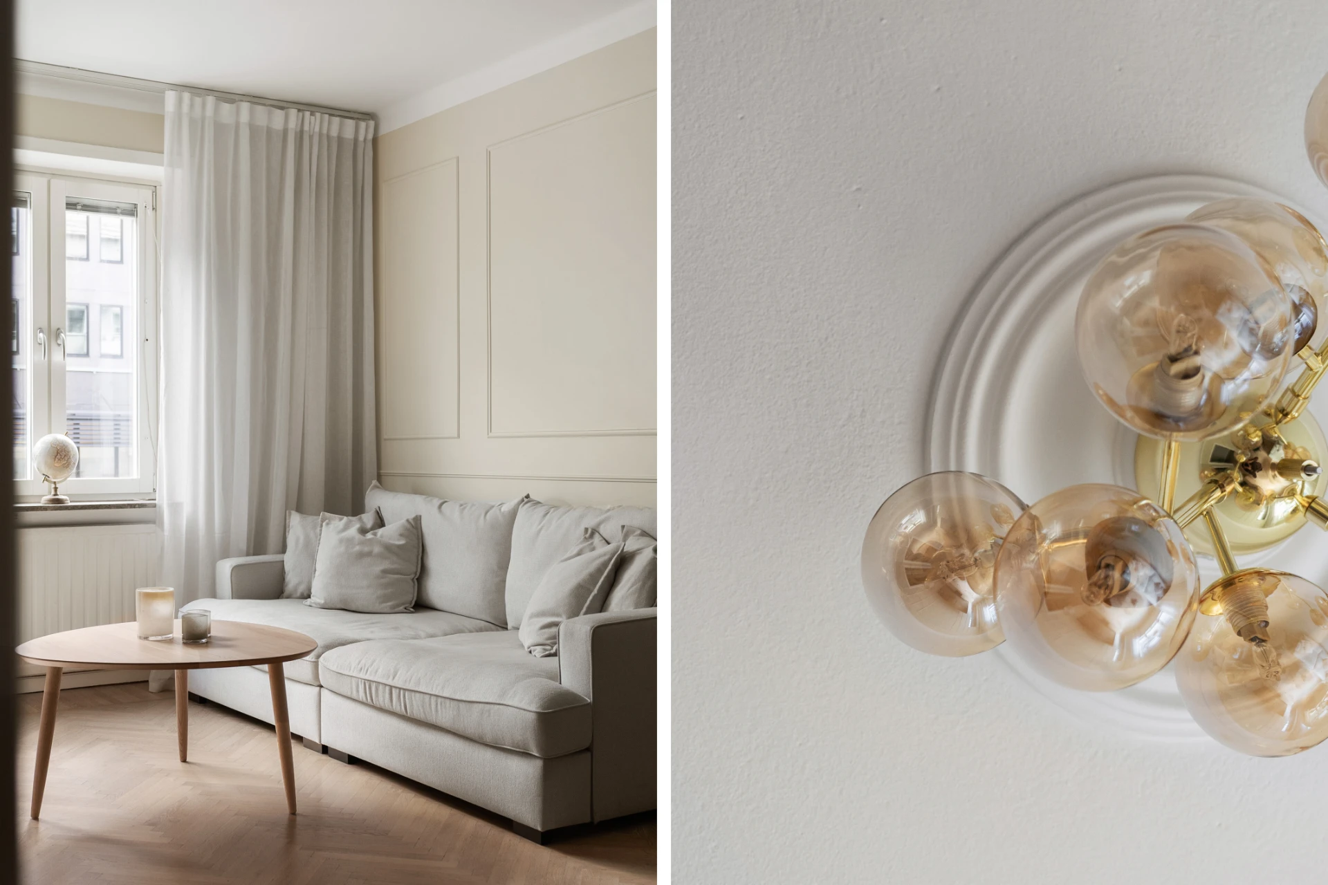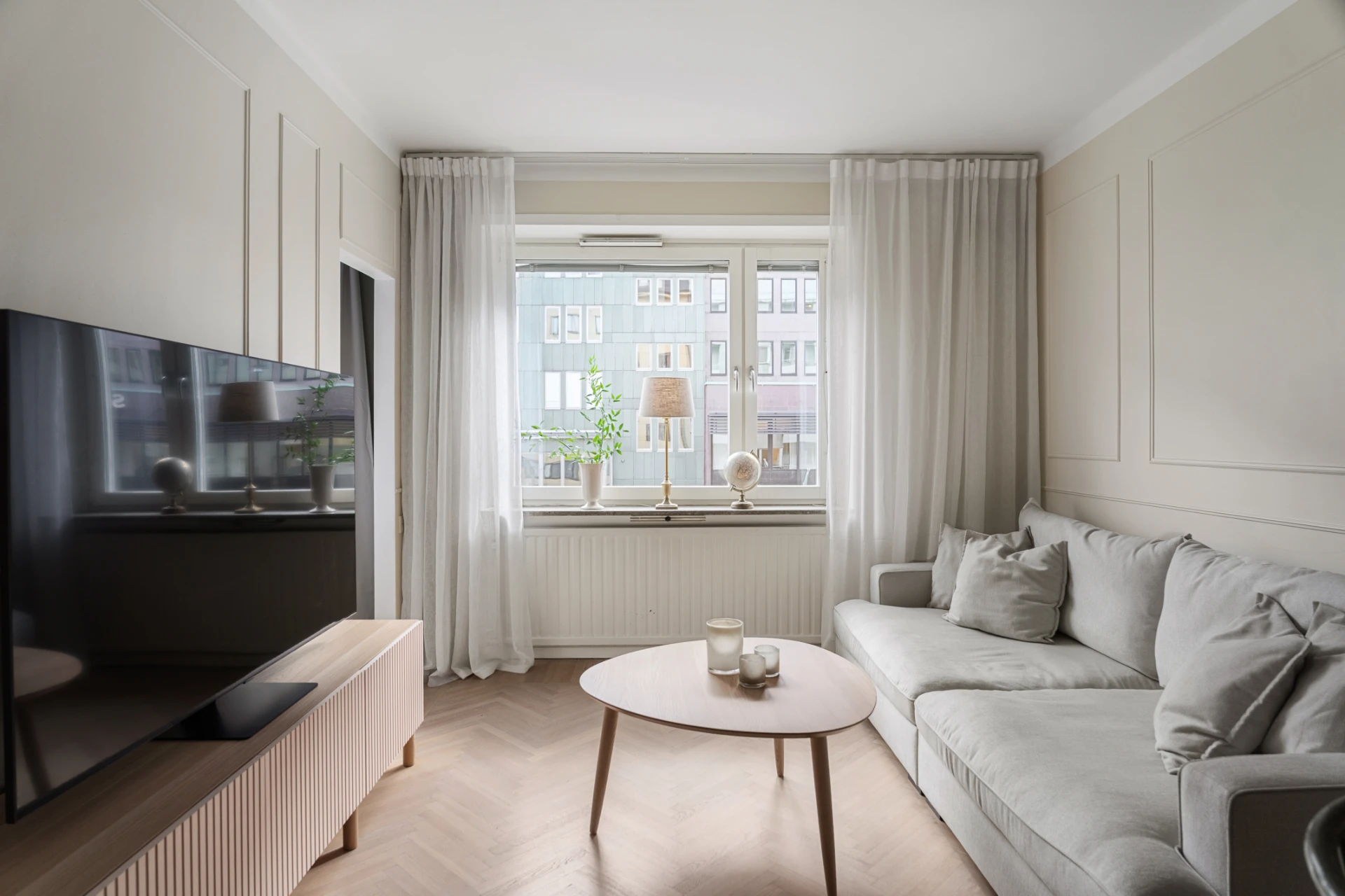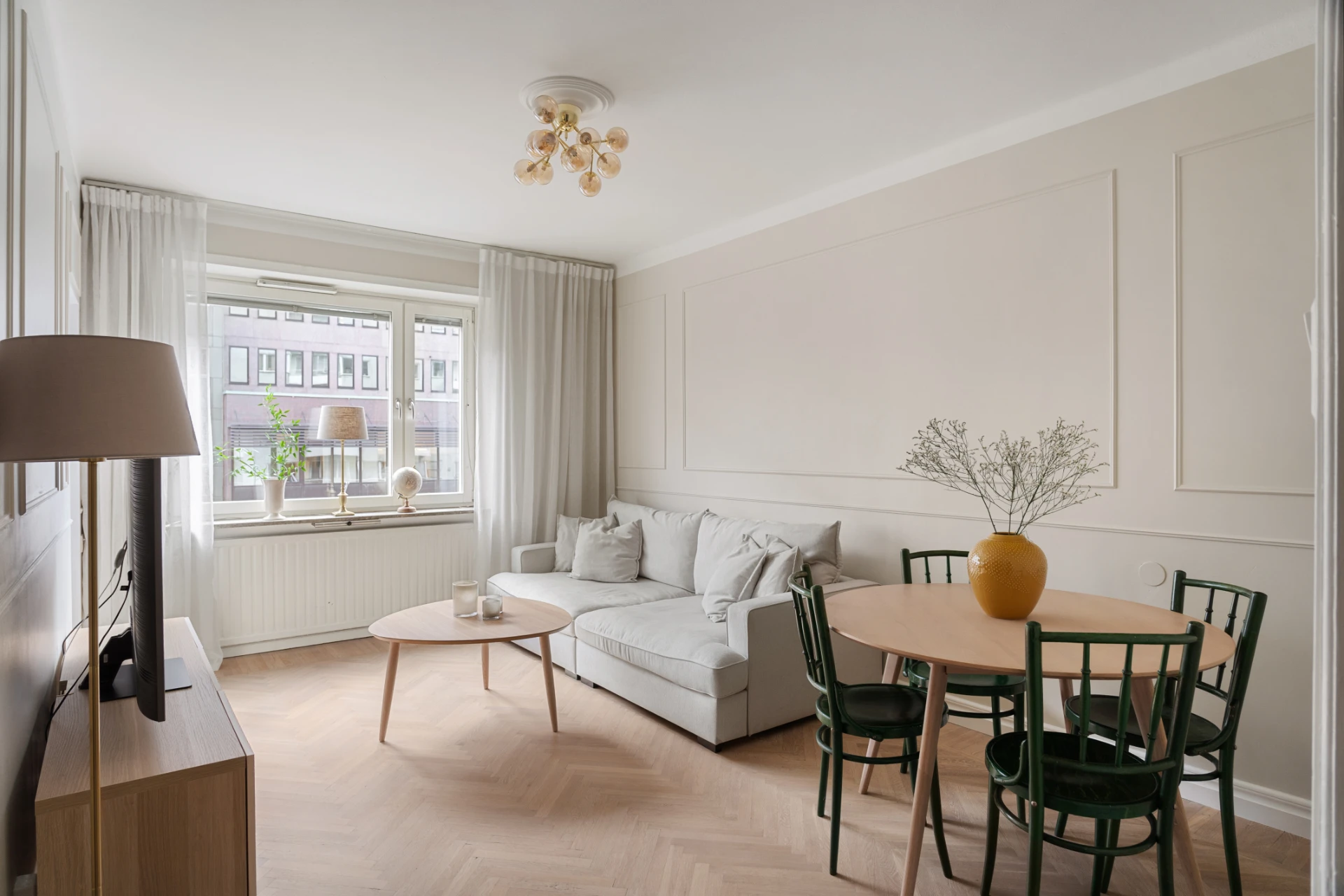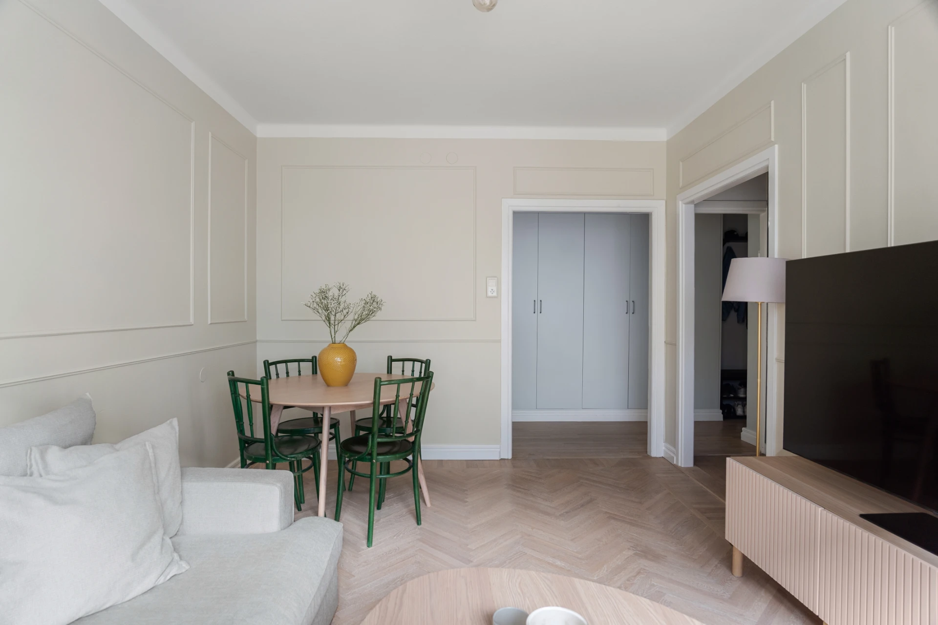 Ljust och luftigt med väggar målade i en varm, beige ton och elegant väggpanel. Fiskbensmönstrat trägolv och fönster som släpper in rikligt med dagsljus. Plats för både soffgrupp och matbord.