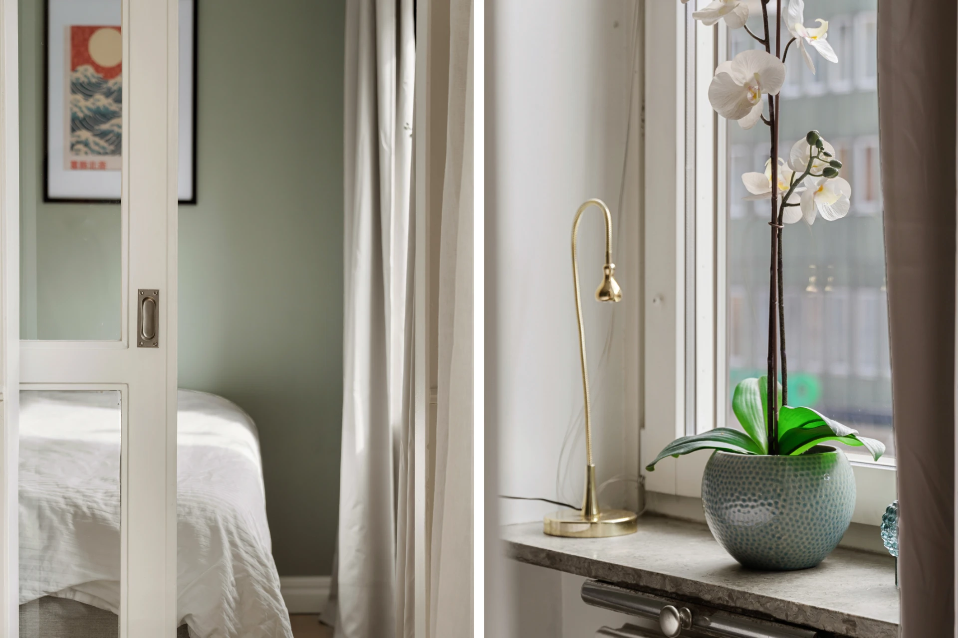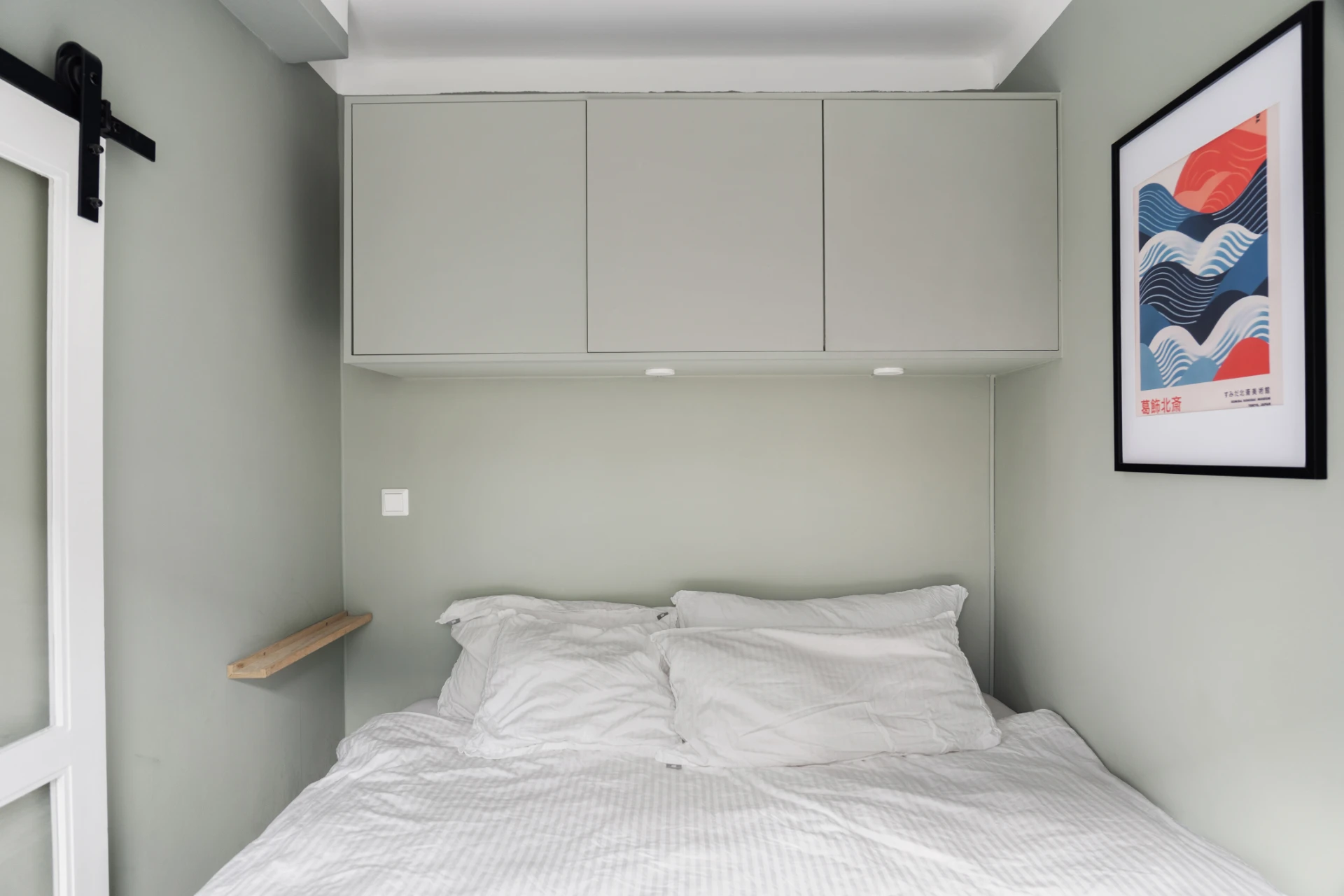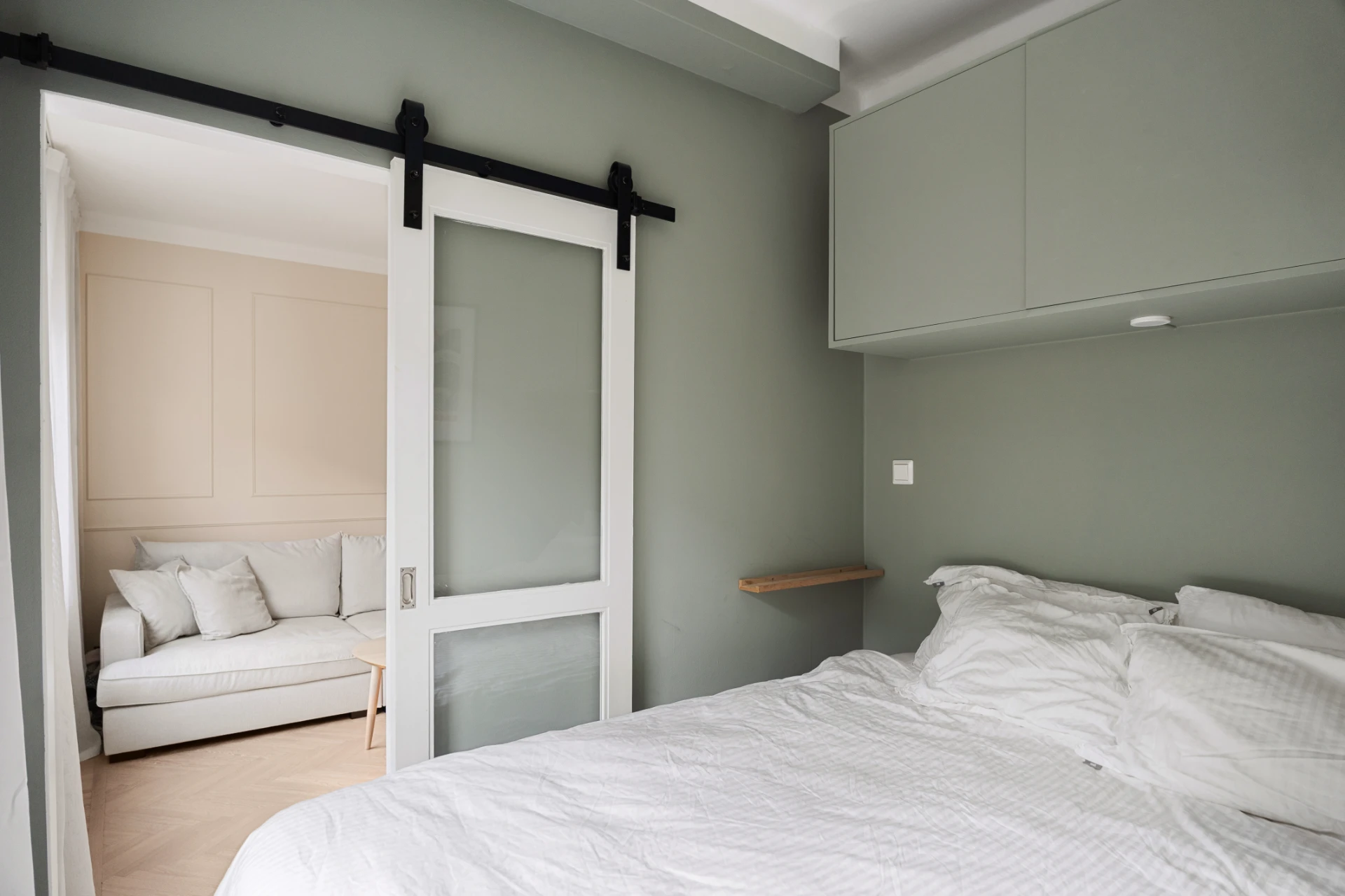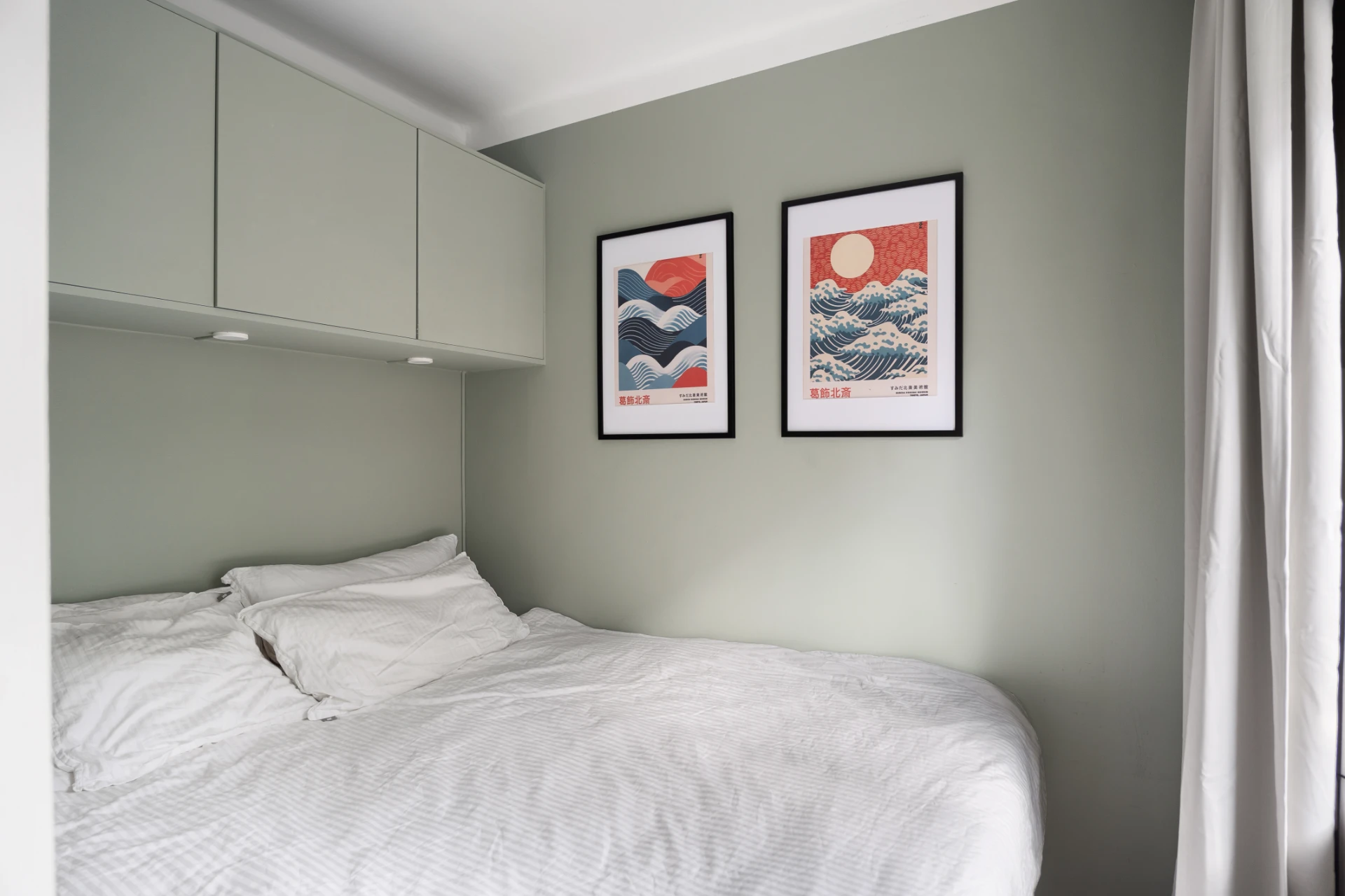 Mysigt sovrum med gröntonade väggar och platsbyggd förvaring ovanför sängen. Ljus gardin, neutrala textilier och fint ljusinsläpp skapar en rofylld atmosfär.