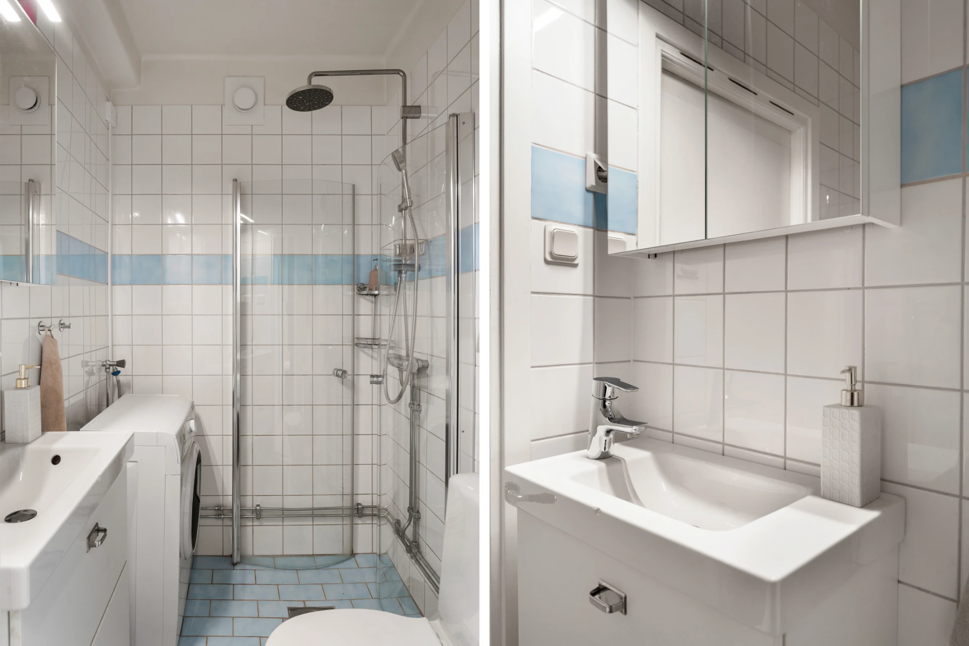 Helkaklat badrum med vit kakel och ljusblå bård, samt matchande klinkergolv i blått. Utrustat med dusch, kommod, spegelskåp, WC och tvättmaskin.