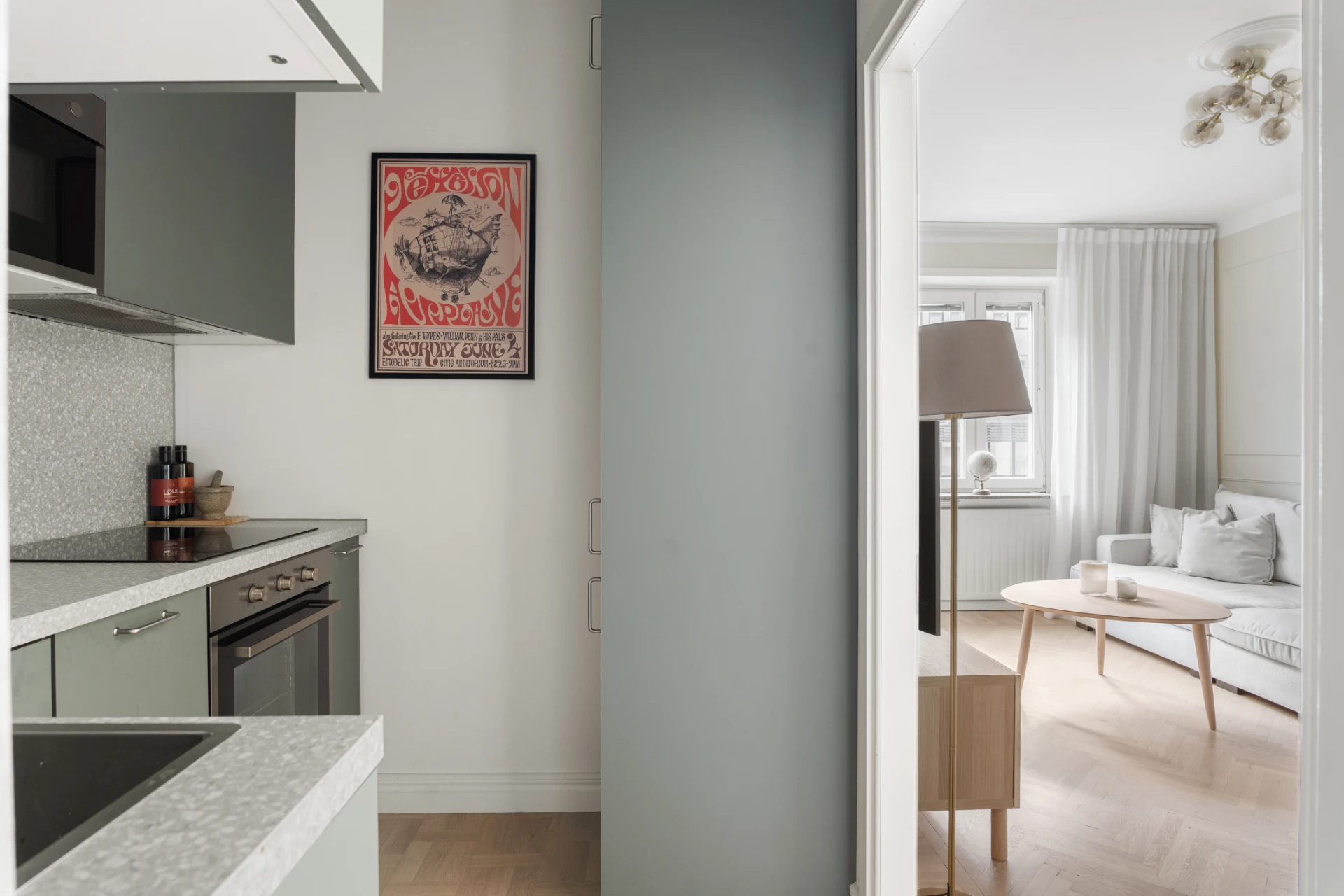 Lägenheten har en genomtänkt disposition där varje kvadratmeter tas till vara. Det nyrenoverade köket är både praktiskt och stilrent med gott om förvaring bakom släta luckor, generösa arbetsytor och integrerade vitvaror. Den öppna känslan mot vardagsrummet skapar en social miljö med plats för matbord och gäster. Vardagsrummet är ljust och inbjudande med stora fönsterpartier som ger ett fint ljusinsläpp. Här ryms både soffgrupp och matplats i en harmonisk miljö där originalgolv och väggpanel skapar karaktär. Sovrummet är lugnt och rofyllt med platsbyggd förvaring och vackert grönmålade väggar som ramar in rummet. Badrummet är helkaklat i ljusa toner med blå accent och erbjuder både dusch och tvättmaskin – ett stort plus för bekvämligheten. Hallen är rymlig med gott om förvaring bakom snygga, platsbyggda garderober.