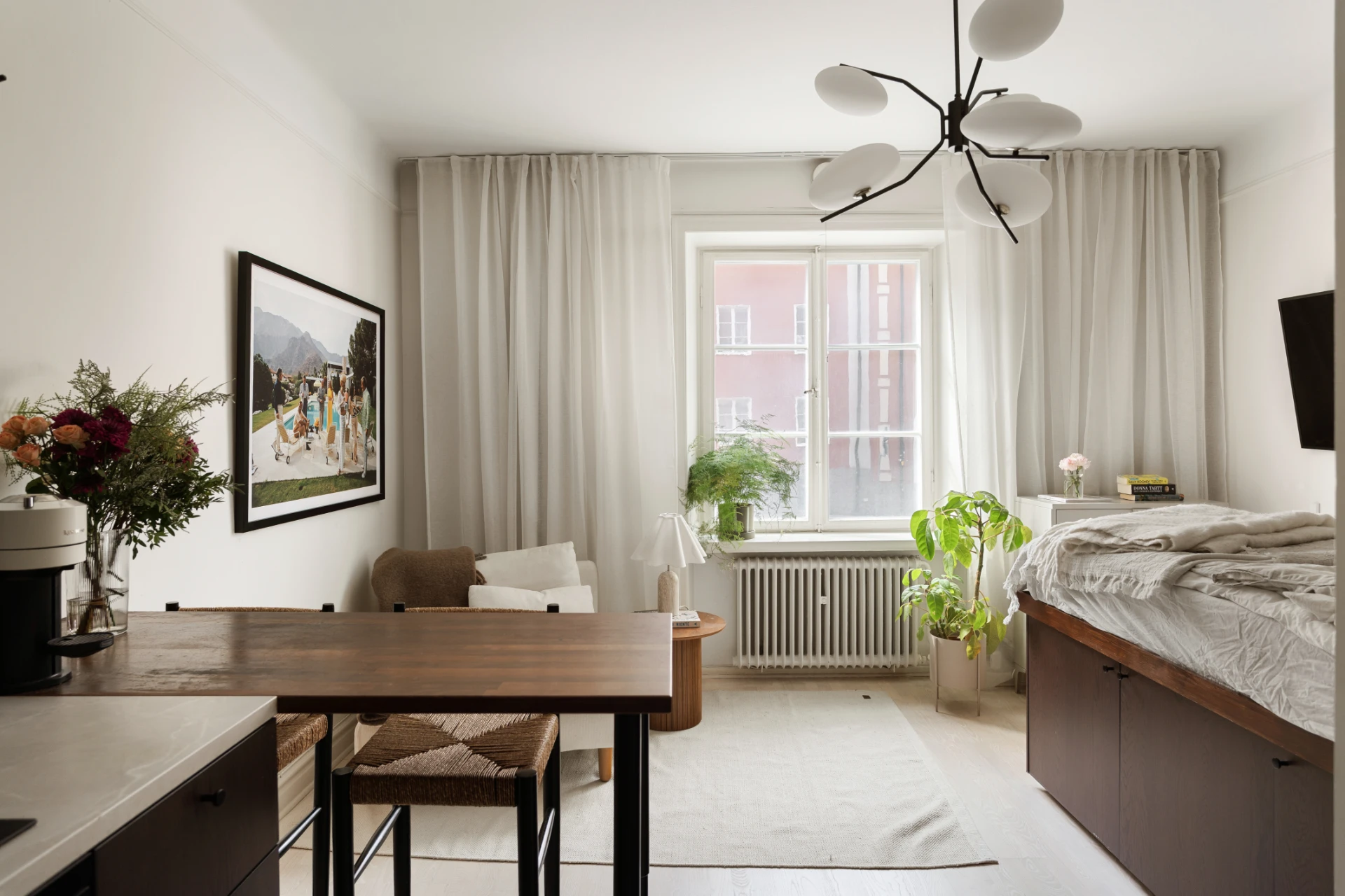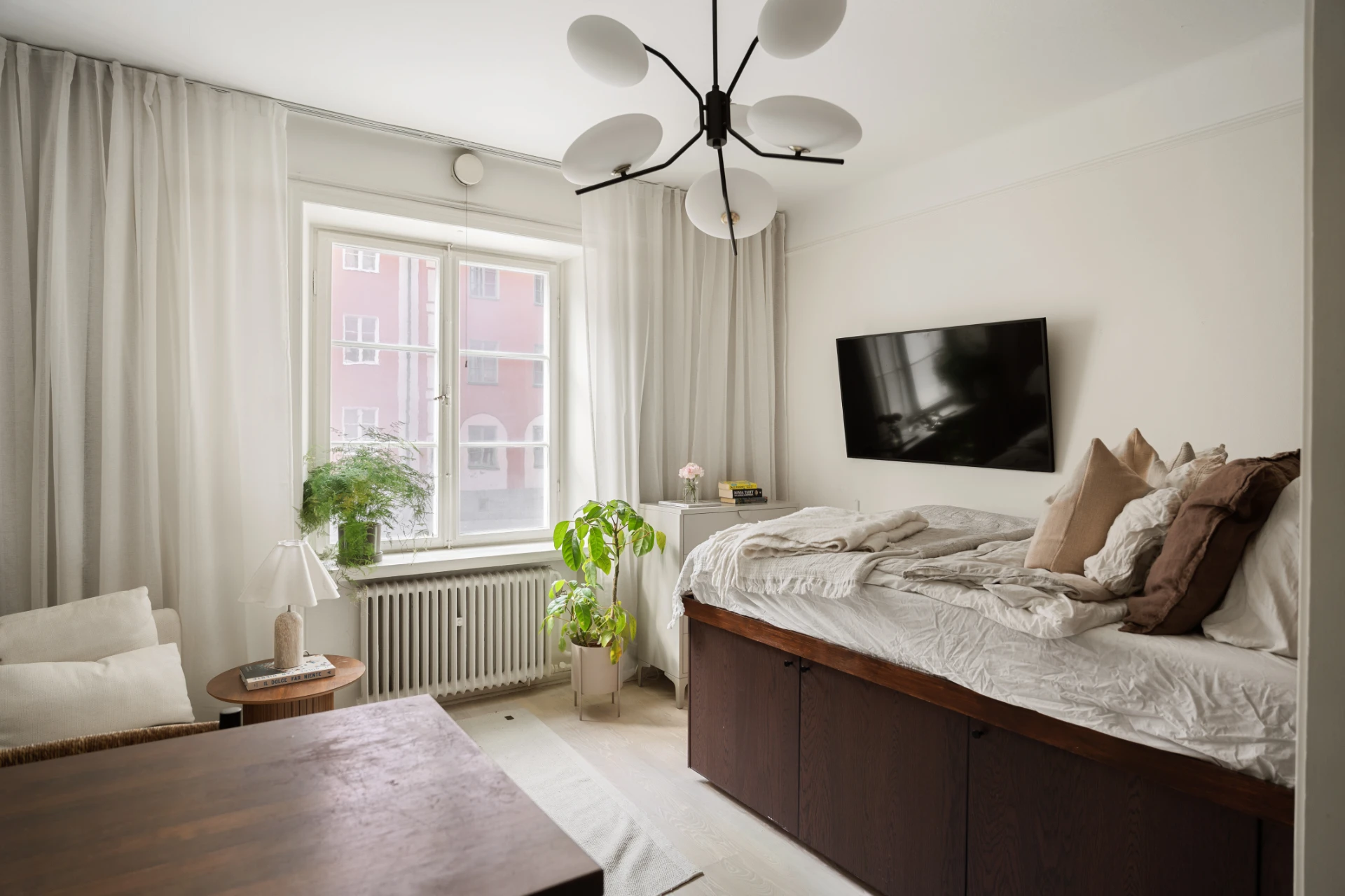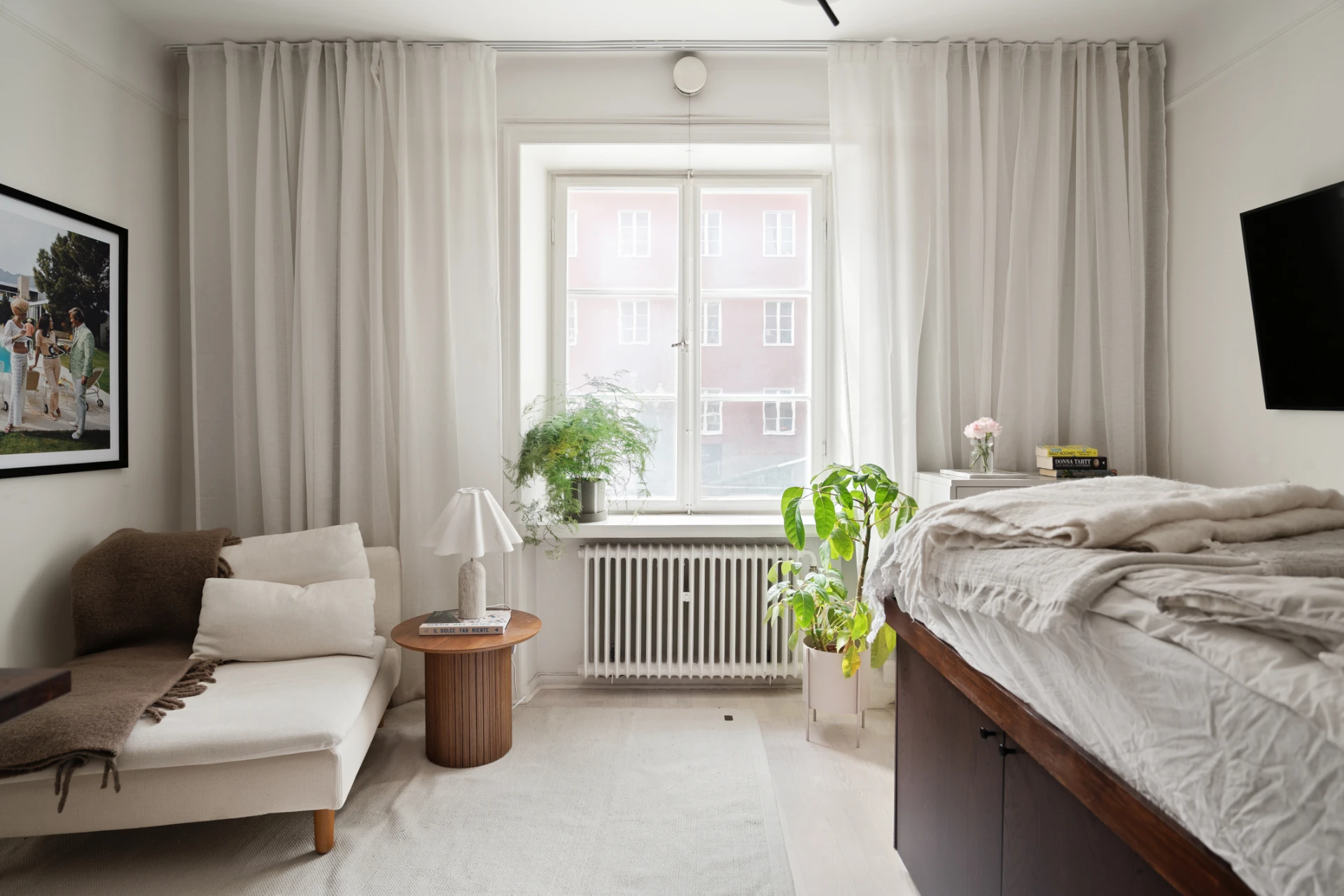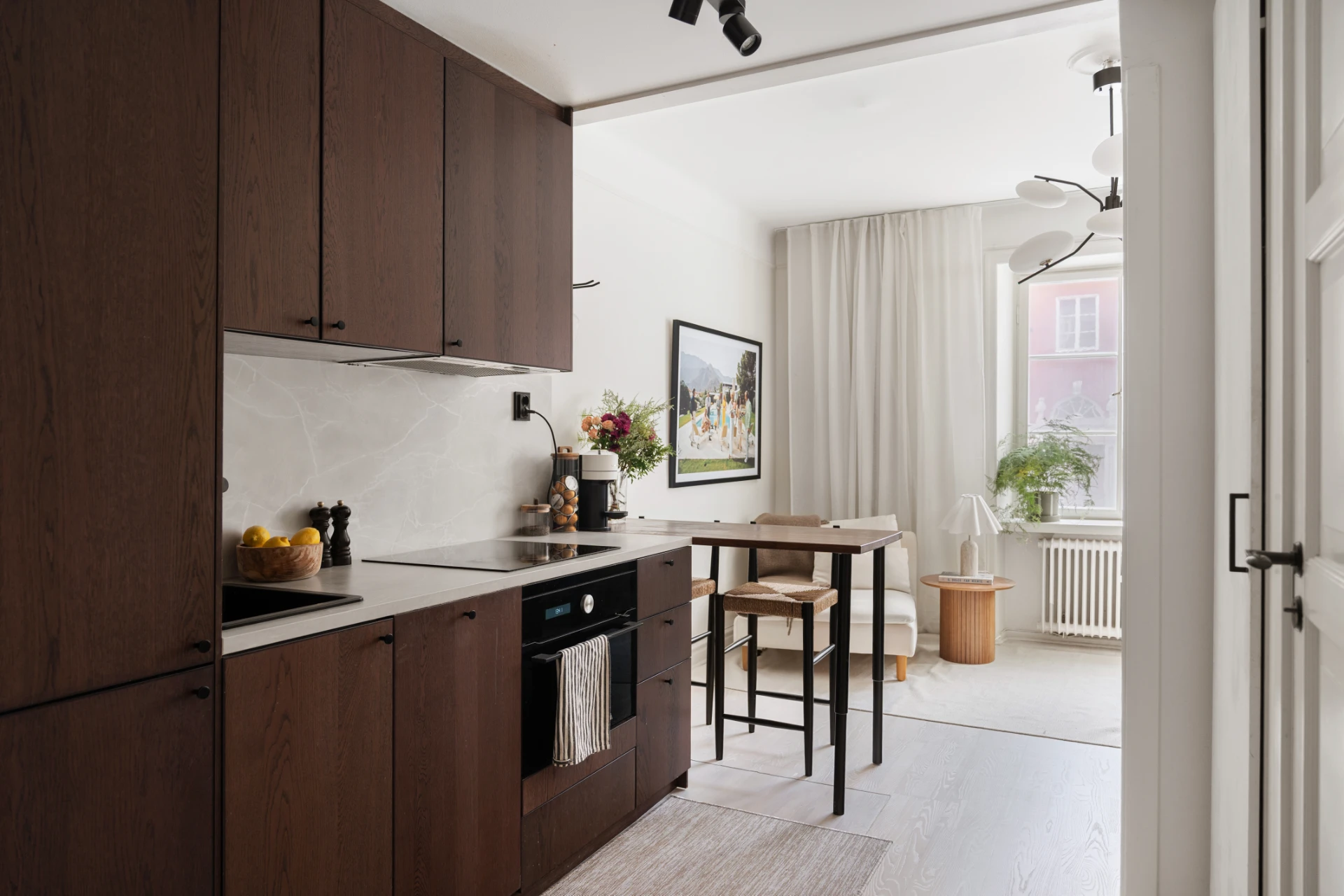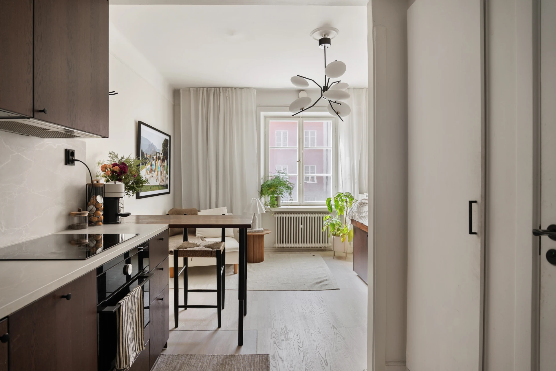 Redan i hallen möts du av en inbjudande atmosfär och praktiska avhängningsmöjligheter som gör det enkelt att hålla ordning på både ytterkläder och skor. Härifrån kliver du in i det moderna köket, med stilrena bruna fronter och gott om förvaringsutrymme. Den maskinella utrustningen – integrerad kyl/frys, diskmaskin, induktionshäll och spis – gör matlagningen till ett nöje. Köket övergår sömlöst i det ljusa sällskapsrummet, där den öppna planlösningen skapar en härlig rymd och inbjuder till sociala stunder. Det stora spröjsade fönstret blir rummets naturliga blickfång och släpper in ett mjukt, generöst ljus. Här finns gott om plats för att kombinera en fåtölj eller mindre soffa med ett matsalsbord för trevliga middagar, en bekväm säng och personliga detaljer. Badrummet är fräscht och funktionellt, utrustat med wc, handfat med kommod och spegelskåp ovanför, samt en praktisk duschhörna.