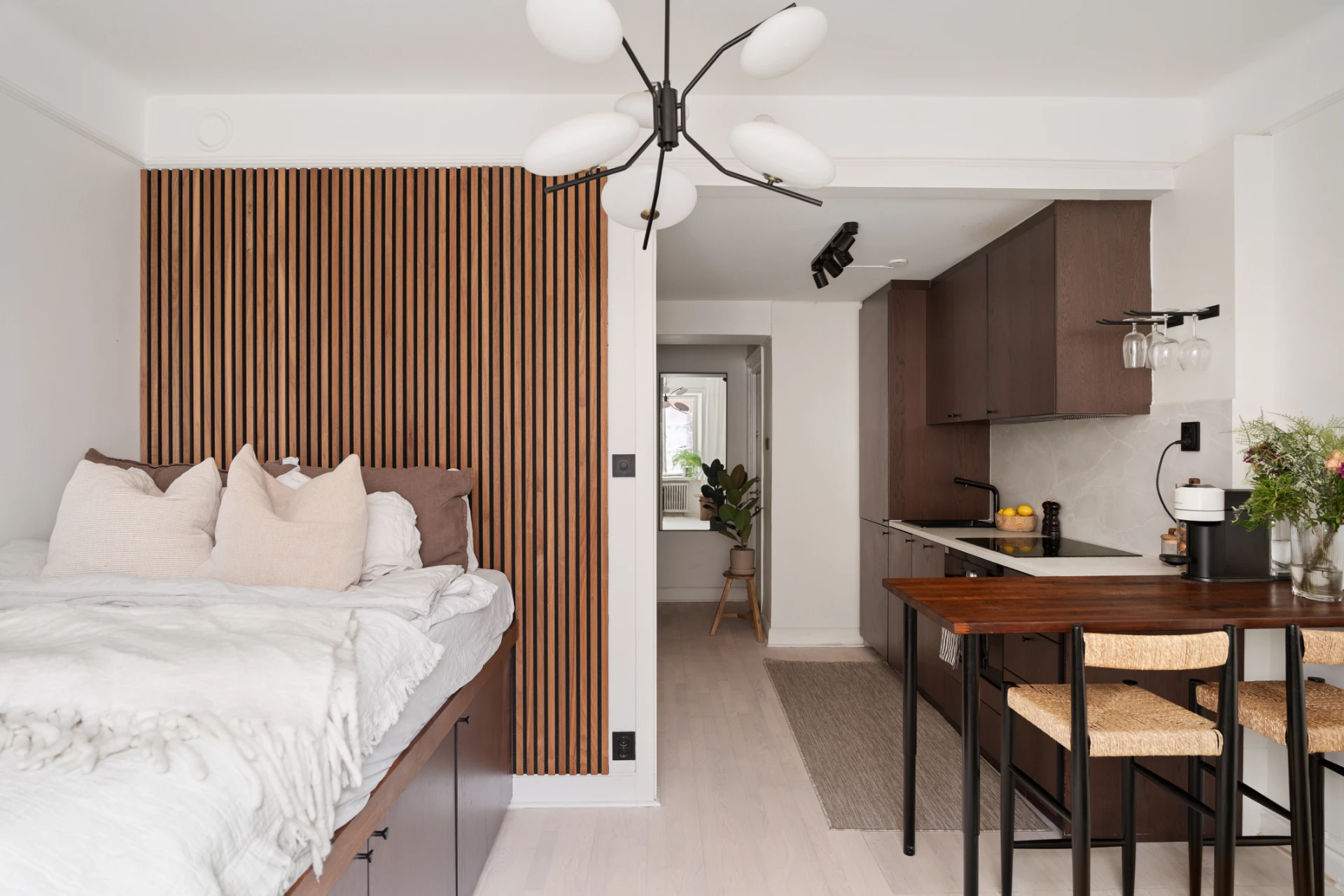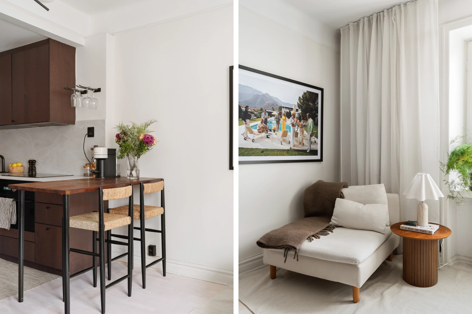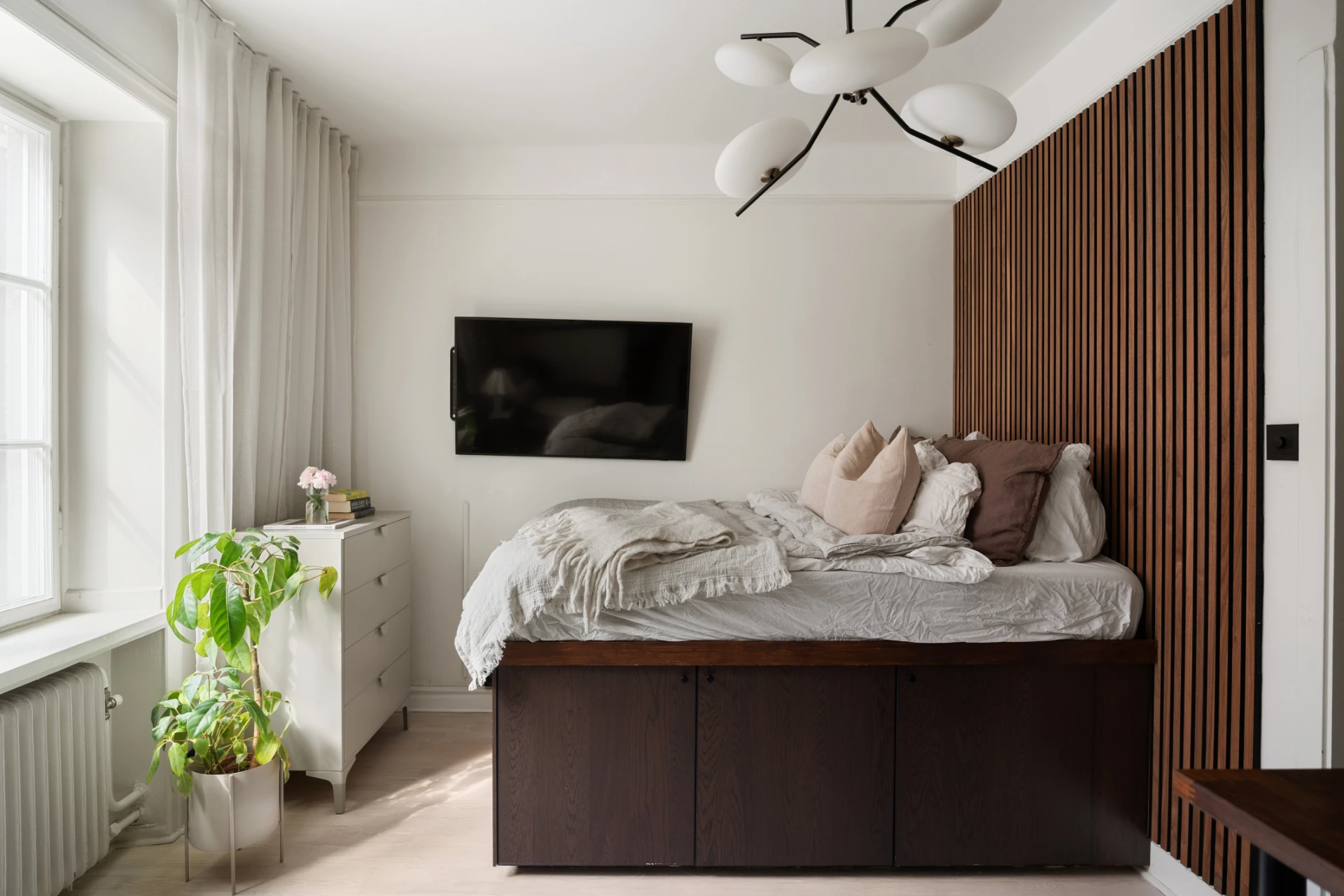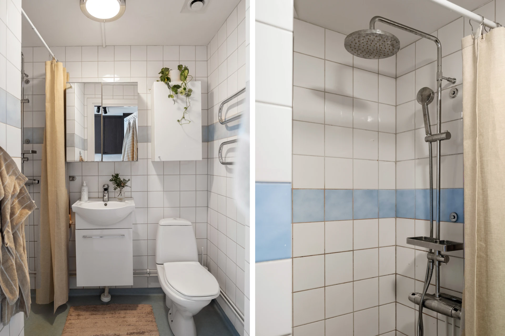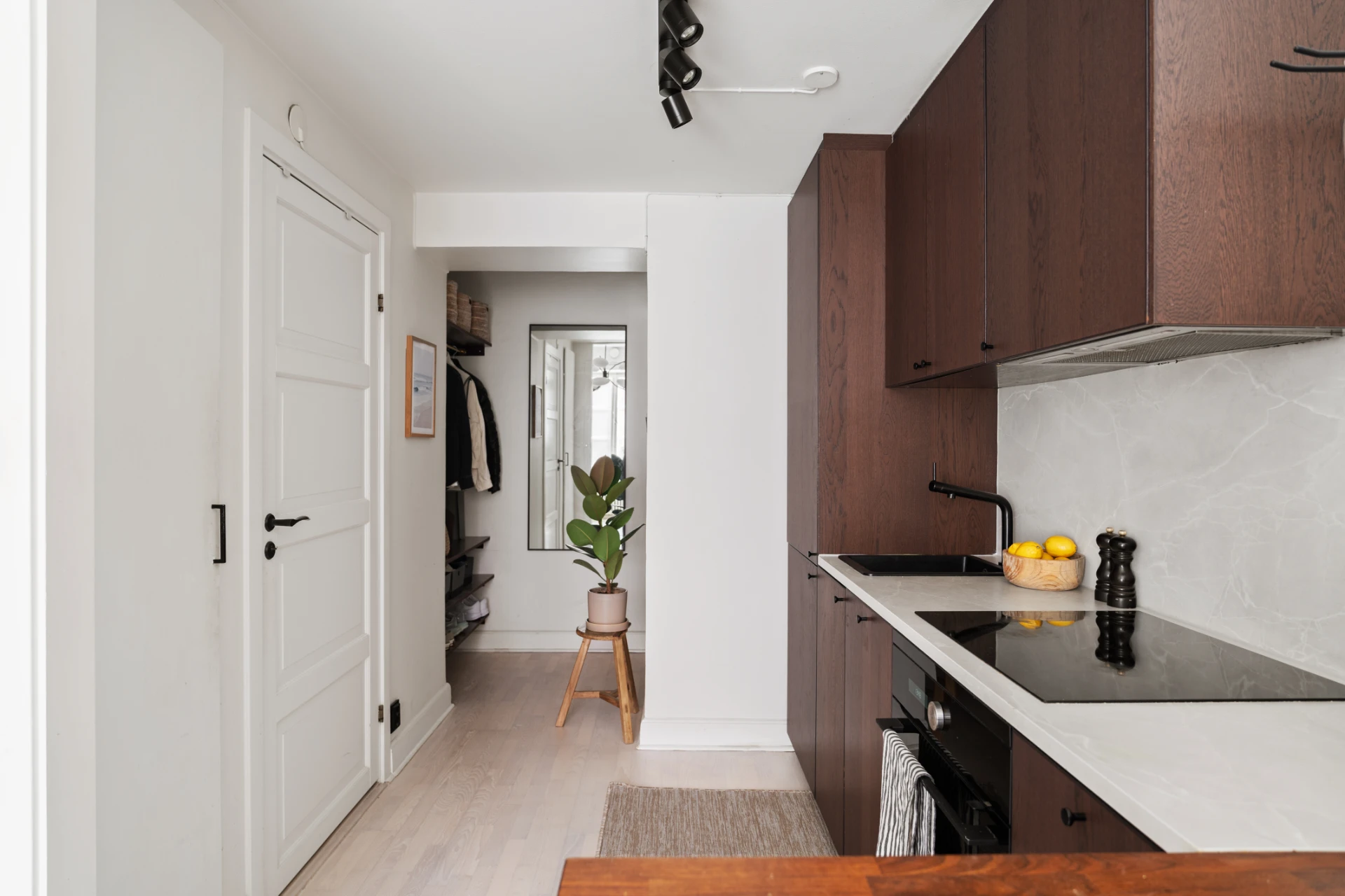 Redan i hallen möts du av en inbjudande atmosfär och praktiska avhängningsmöjligheter som gör det enkelt att hålla ordning på både ytterkläder och skor. Härifrån kliver du in i det moderna köket, med stilrena bruna fronter och gott om förvaringsutrymme. Den maskinella utrustningen – integrerad kyl/frys, diskmaskin, induktionshäll och spis – gör matlagningen till ett nöje. Köket övergår sömlöst i det ljusa sällskapsrummet, där den öppna planlösningen skapar en härlig rymd och inbjuder till sociala stunder. Det stora spröjsade fönstret blir rummets naturliga blickfång och släpper in ett mjukt, generöst ljus. Här finns gott om plats för att kombinera en fåtölj eller mindre soffa med ett matsalsbord för trevliga middagar, en bekväm säng och personliga detaljer. Badrummet är fräscht och funktionellt, utrustat med wc, handfat med kommod och spegelskåp ovanför, samt en praktisk duschhörna.
