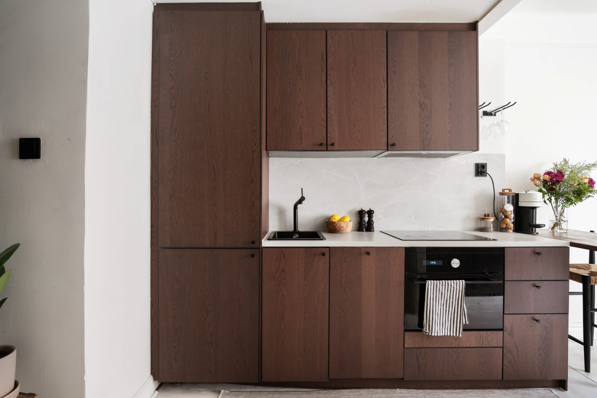 Modernt kök med god förvaring bakom bruna fronter. Maskinell utrustning såsom integrerad kyl/frys och diskmaskin, induktionshäll samt spis Köket ligger i öppen planlösning ut mot sällskapsrummet vilket ger en otrolig rymd.