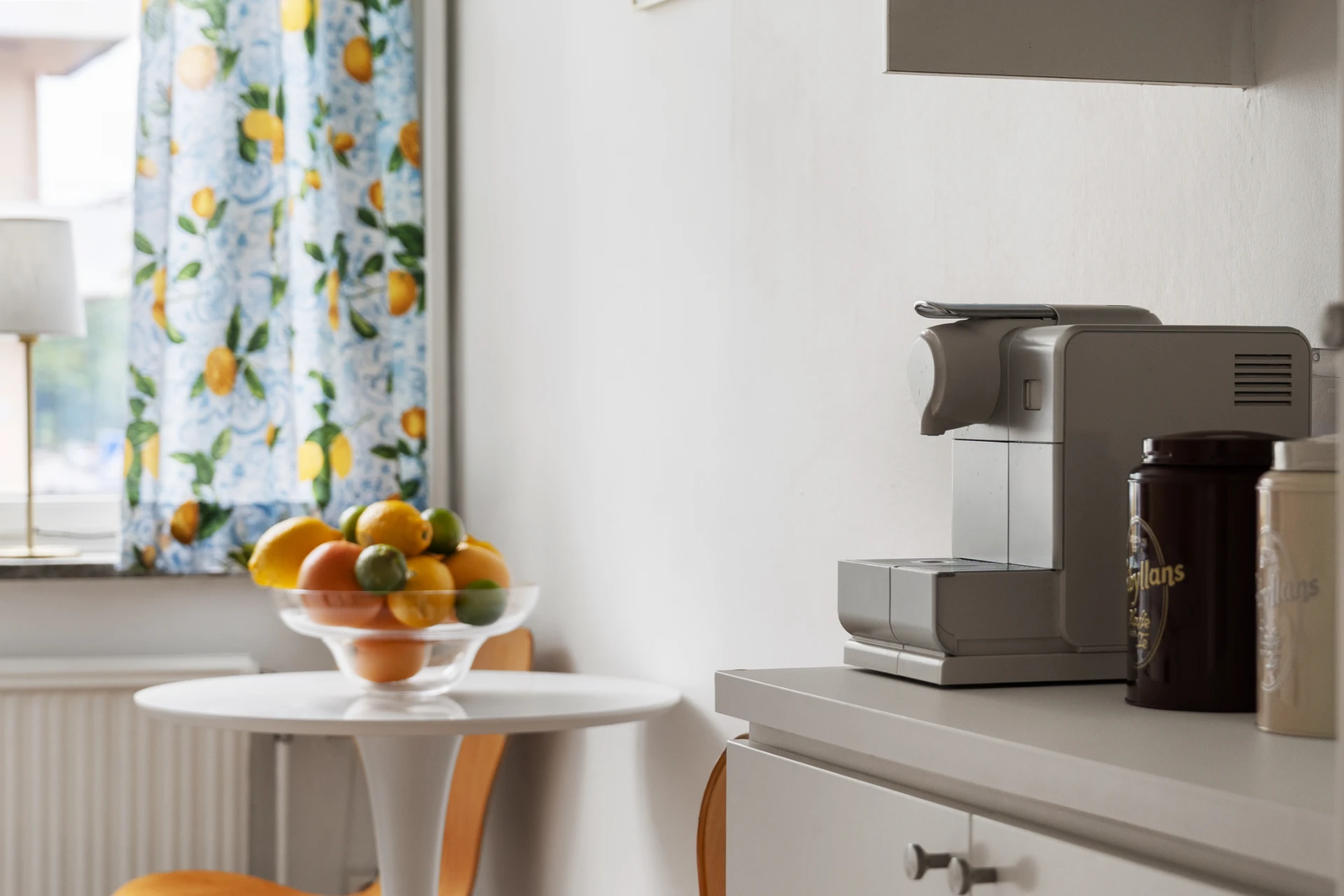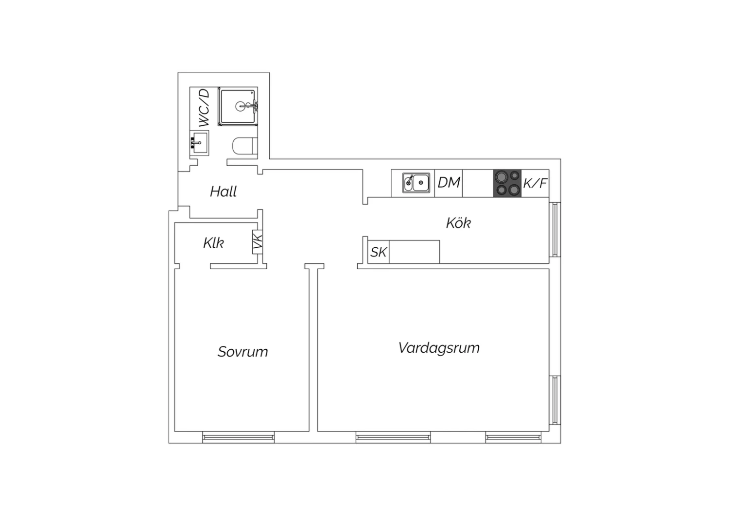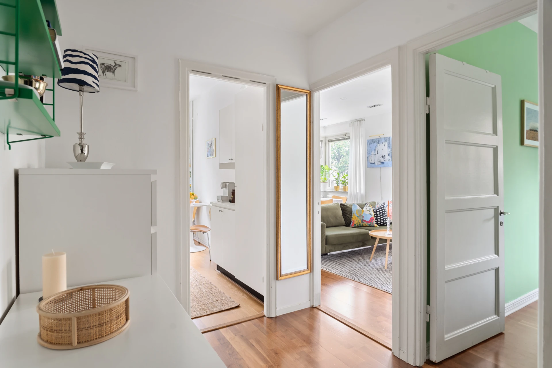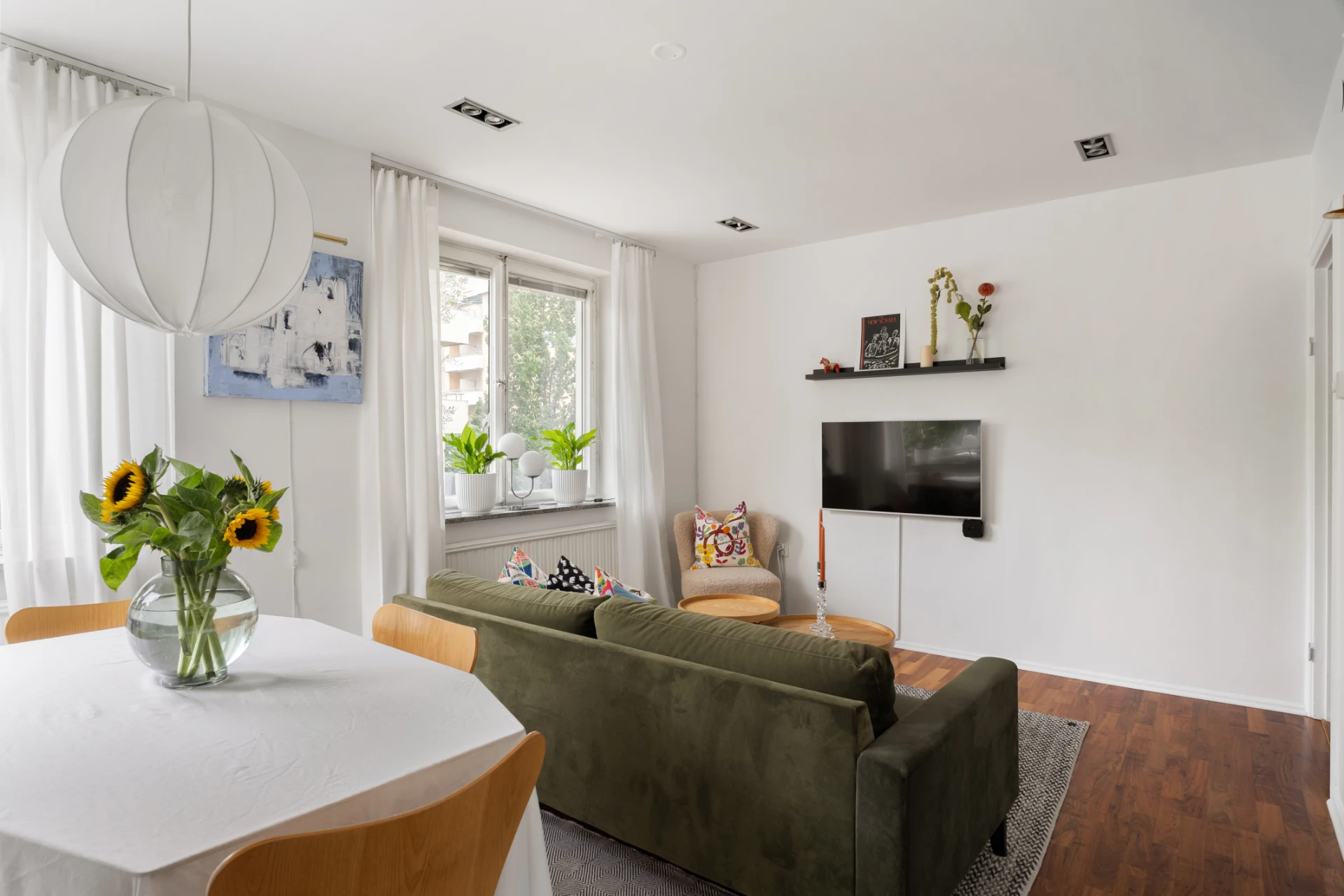 När du kliver in genom dörren möts du av en ljus och inbjudande hall med stilrent mörkt klinkergolv och gott om plats för att hänga av ytterkläder och skor. Härifrån leds du vidare in i den rymliga inre hallen – ett praktiskt nav i bostaden med valnötsparkett vita väggar och en elegant inbyggd vinkyl som ger det där lilla extra. Här finns dessutom plats för förvaringsmöbel. Vardagsrummet är hemmets hjärta – ljust, luftigt och lätt att trivas i. Tack vare flera fönster i olika väderstreck flödar dagsljuset in och förstärker känslan av rymd. Den vackra valnötsparketten samspelar med den generösa ytan och gör det enkelt att möblera med både soffa, matsalsbord och mediamöbel. Här är det lätt att känna sig hemma, oavsett om du bjuder på middag eller bara kopplar av. Intill ligger det stilrena köket – en funktionell och smakfull plats med vita släta skåpsluckor, ljus bänkskiva och stänkskydd i sandfärgad stenimitation. Ett fönster släpper in dagsljus och skapar en trivsam miljö för både matlagning och morgonkaffet. Här finns full maskinell utrustning med spis/ugn, fläkt, diskmaskin och kyl/frys – samt plats för ett mindre matbord för vardagens måltider. Sovrummet är en lugn oas med väggar målade i en harmonisk lindblomsgrön ton och vacker valnötsparkett. Ett fönster skänker rummet ett behagligt ljus, och här finns gott om plats för en dubbelsäng, sidobord och förvaringsmöbel. Här finns dessutom en rymlig klädkammare som löser förvaringsbehoven på ett smidigt sätt. Badrummet är stilrent och helkaklat i svart och vitt – klassiskt och modernt på samma gång. Här finns WC, handfat med kommod och spegelskåp ovan samt dusch med infällbara glasväggar. För den som önskar bekvämligheten av egen tvättlösning är badrummet även förberett för tvättmaskin.