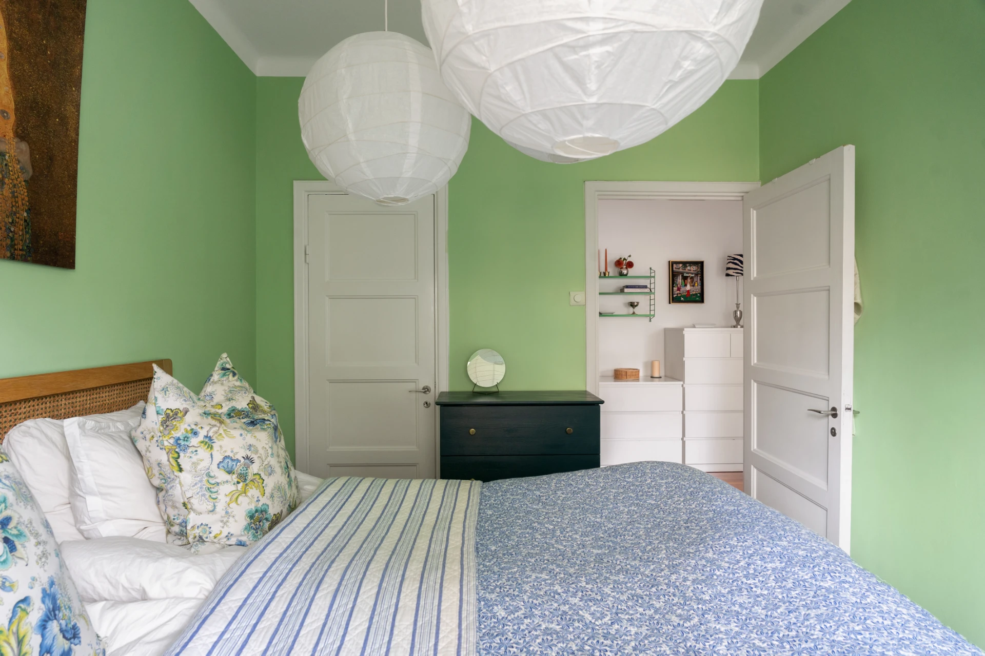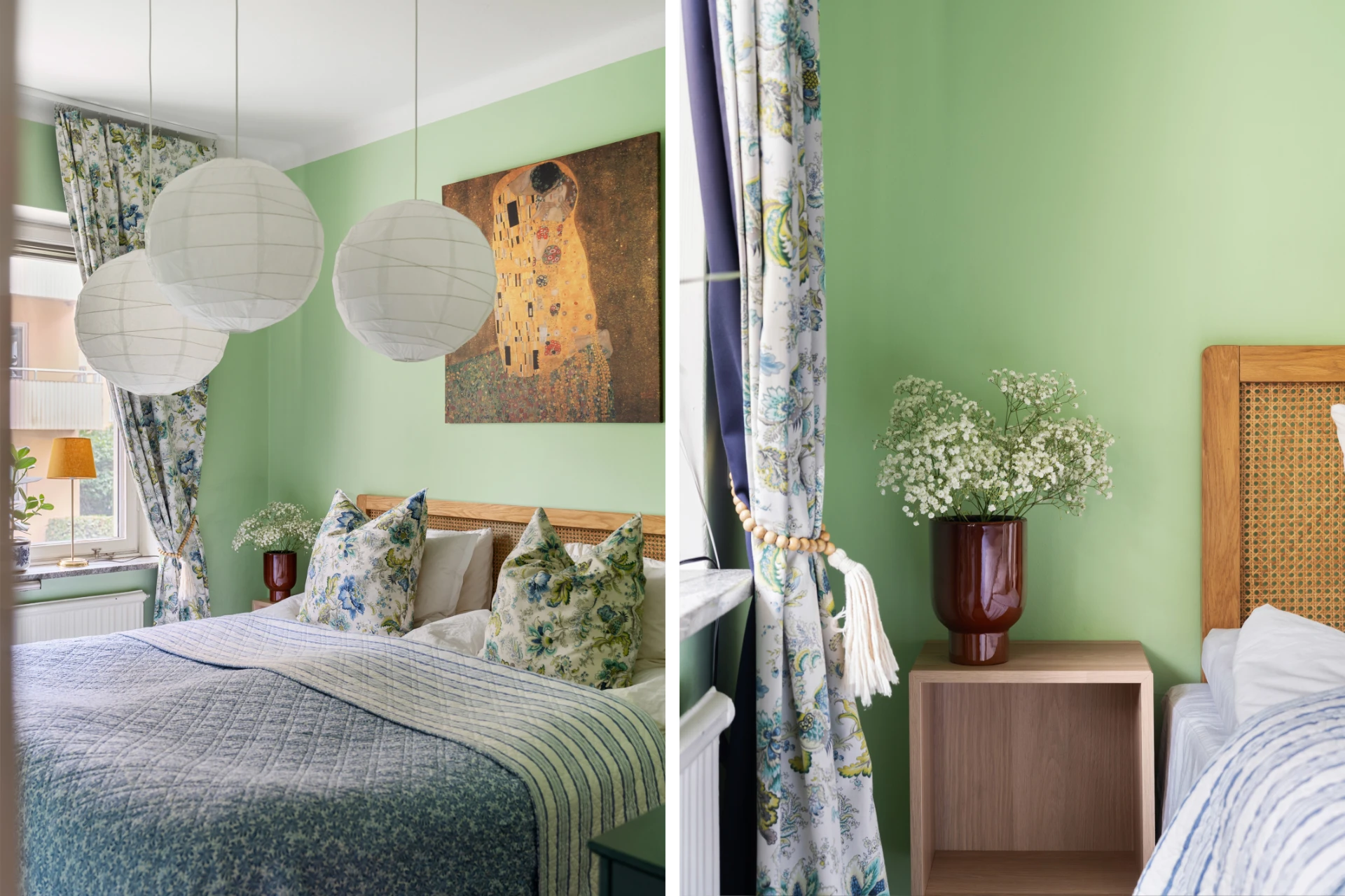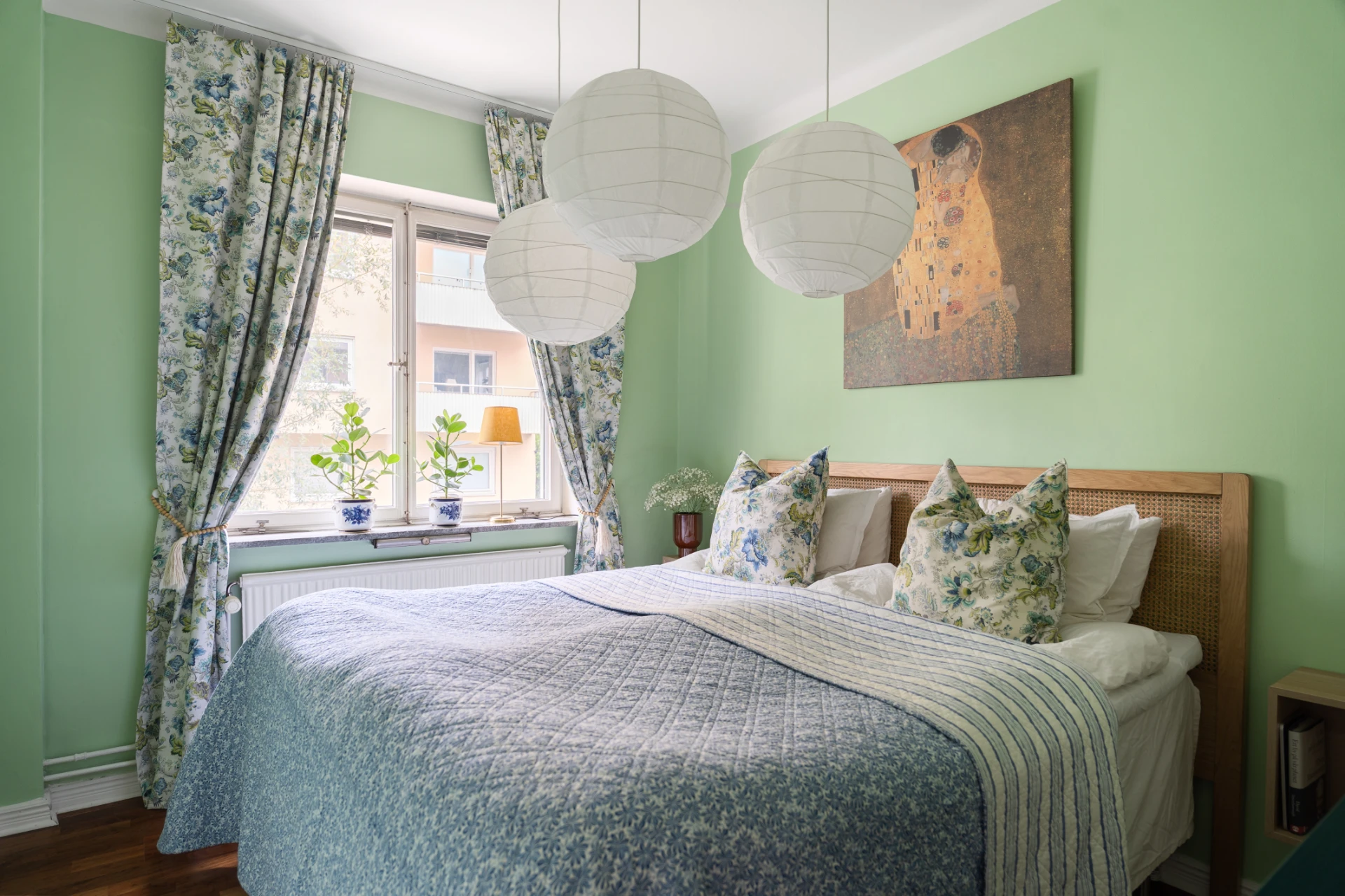 Harmoniskt sovrum med kulören Lindblomsgrön på väggarna, valnötsparkett samt ljusinsläpp från fönster. Här finns plats för dubbelsäng, sidobord samt förvaringsmöbel. Här finns även en rymlig klädkammare för extra förvaring.